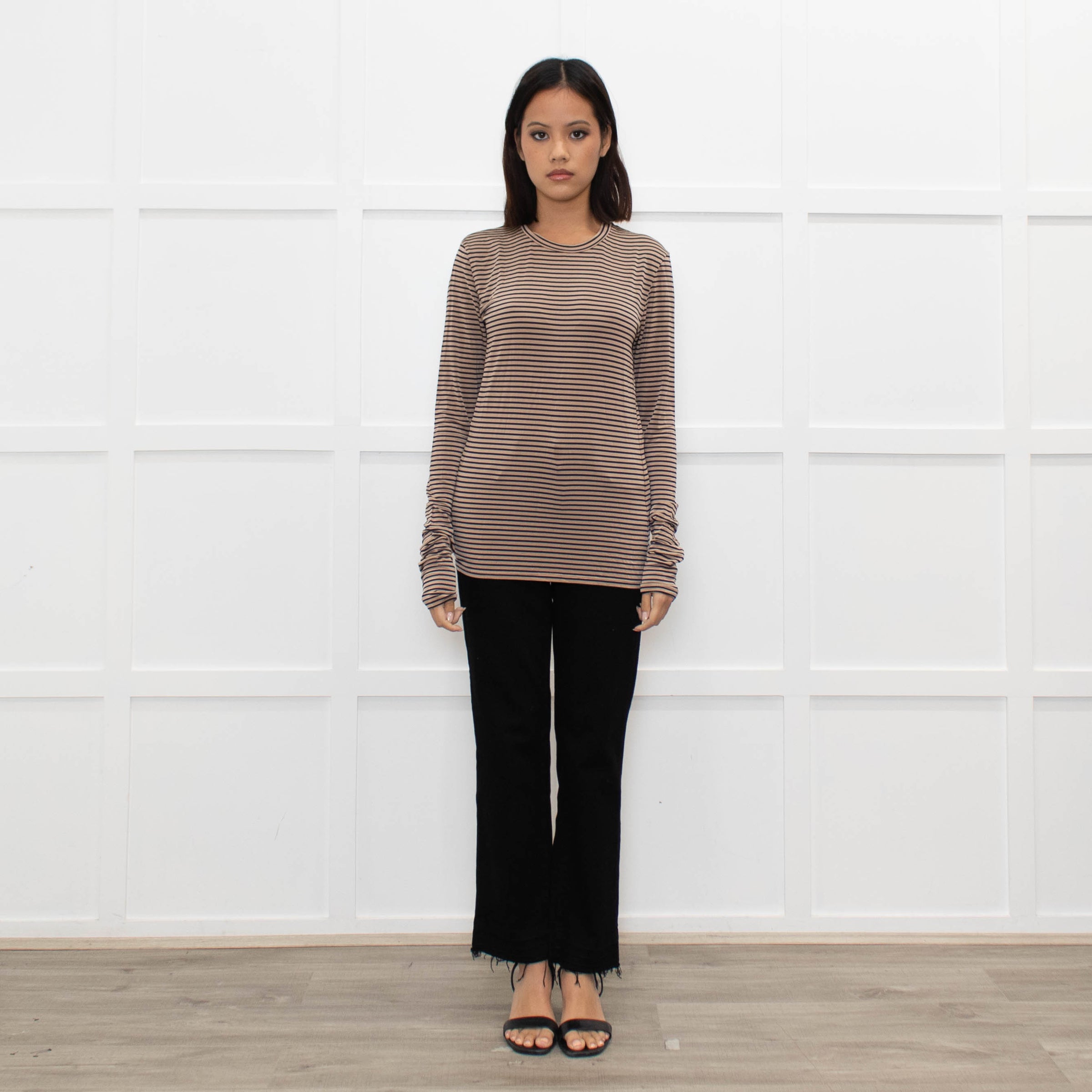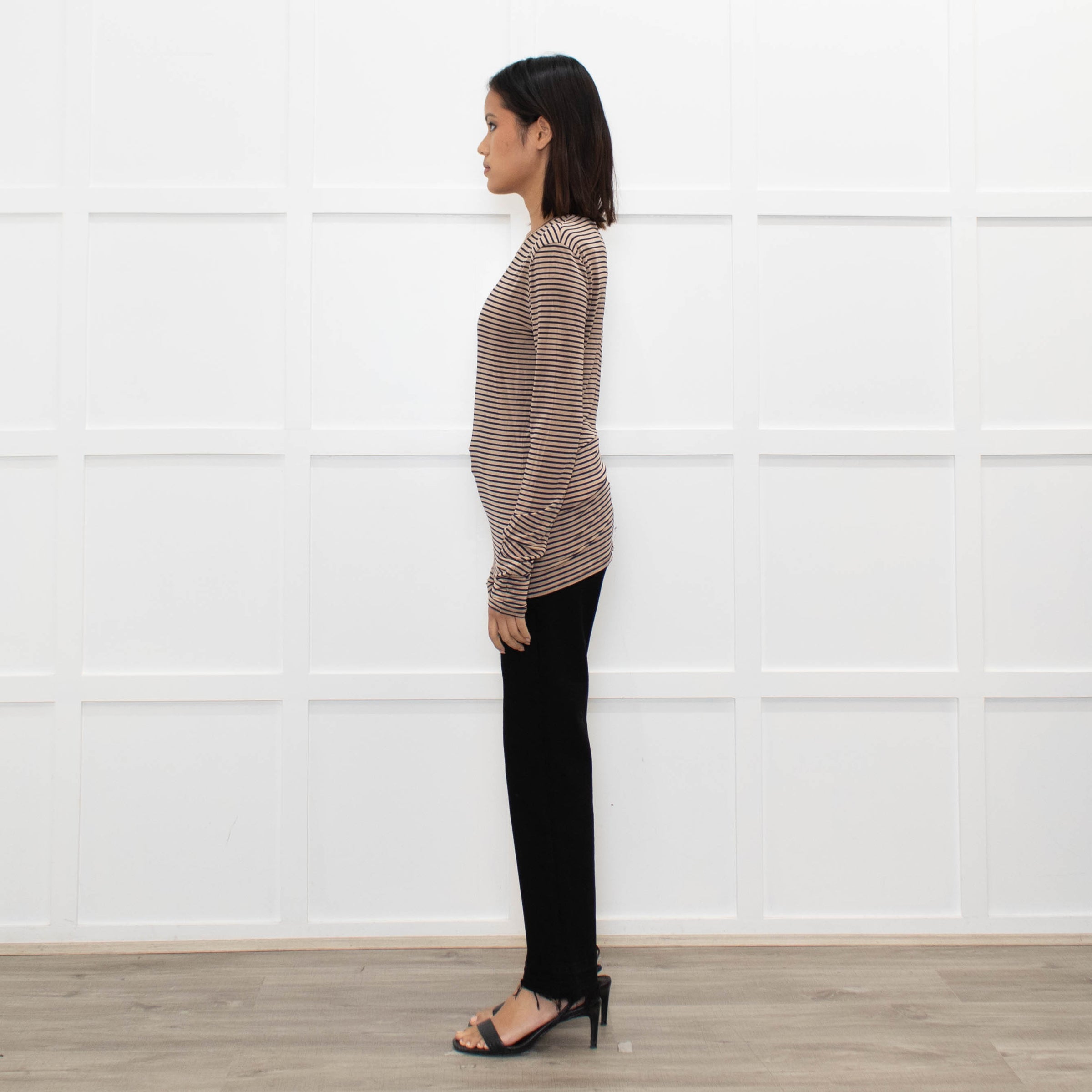 Max Mara Studio beige and navy blue striped long sleeve top in a fluid jersey with a rounded neck, and long sleeves.