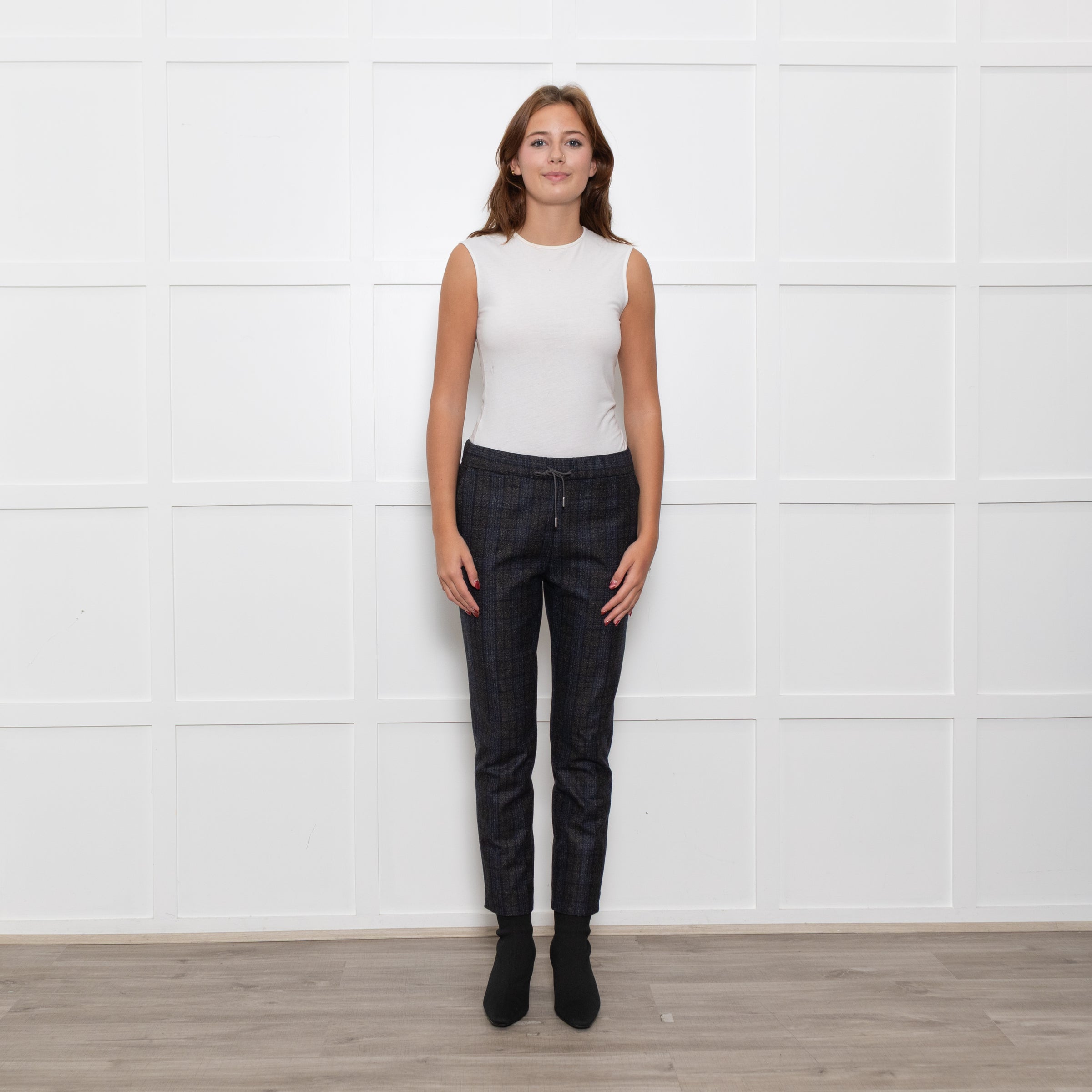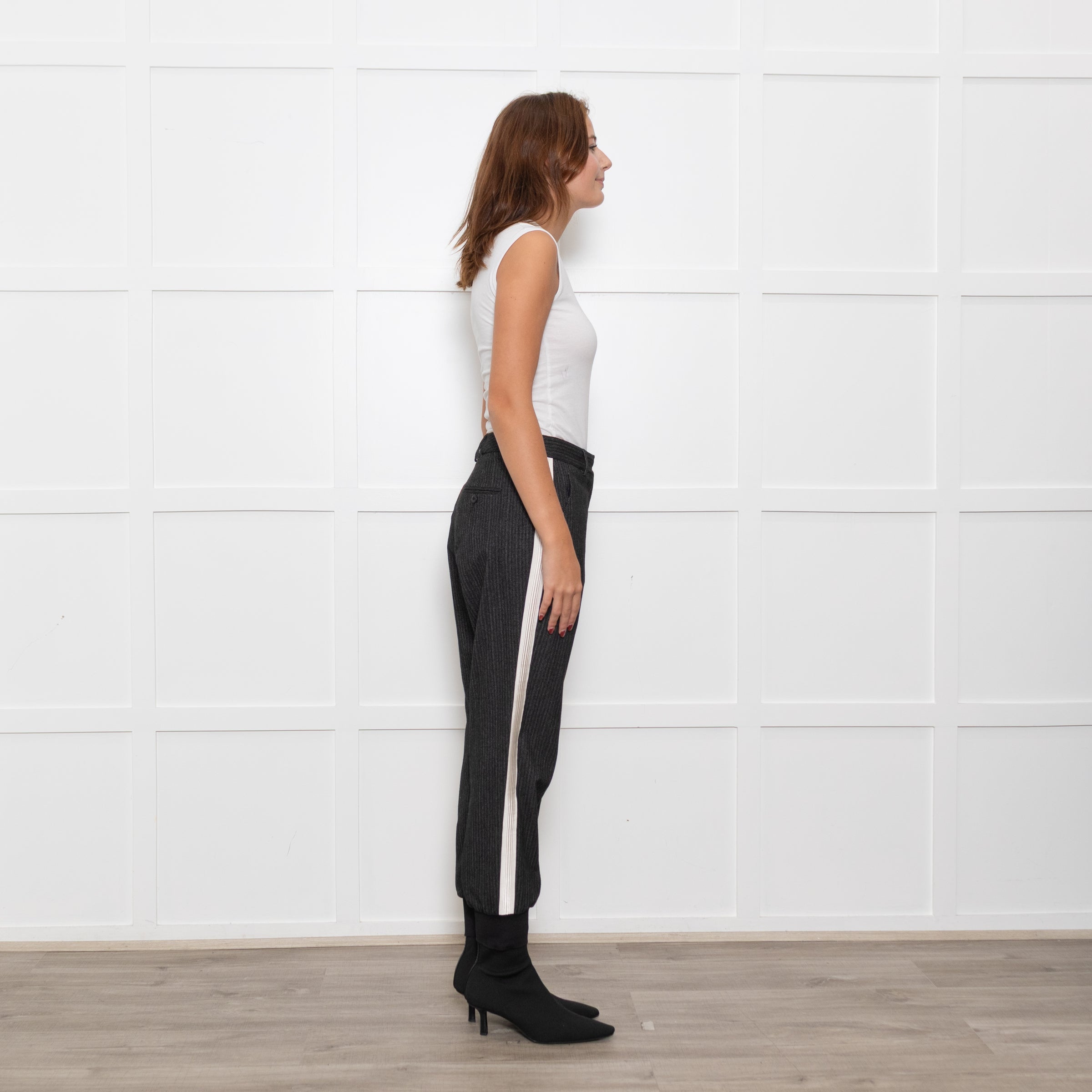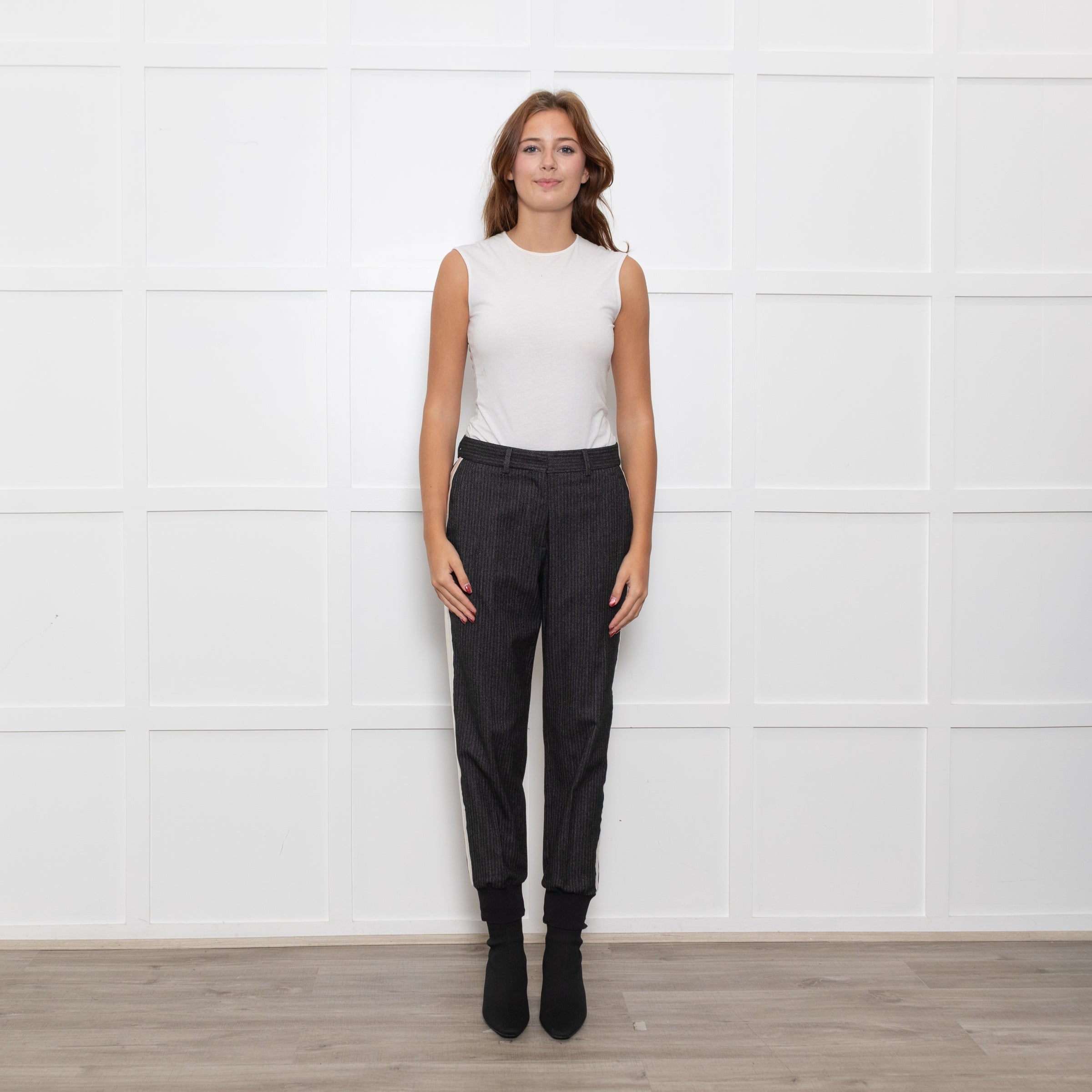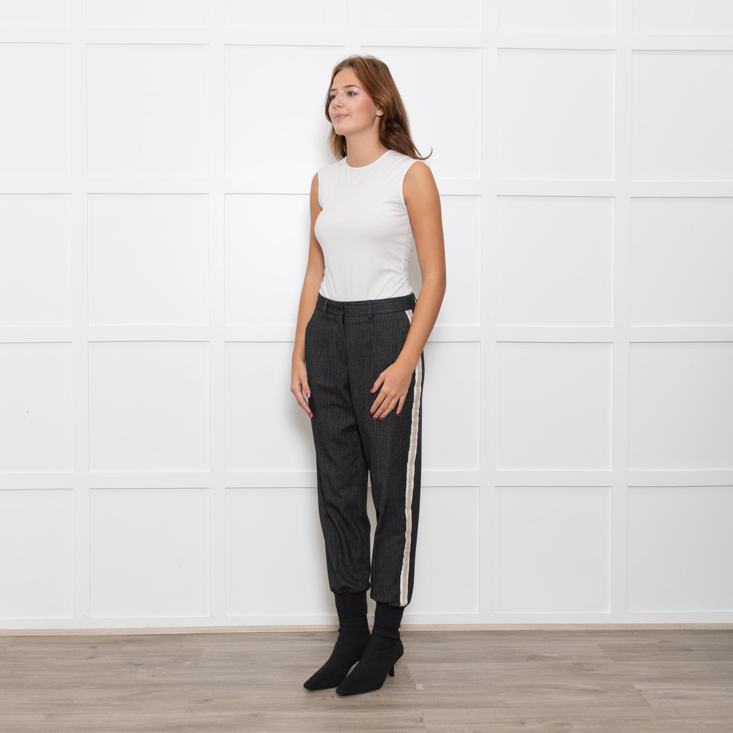 Me + Em black fitted fleck joggers featuring a gorgeous cream-white side stripe, finished with a metal clasp fastening and front zip.