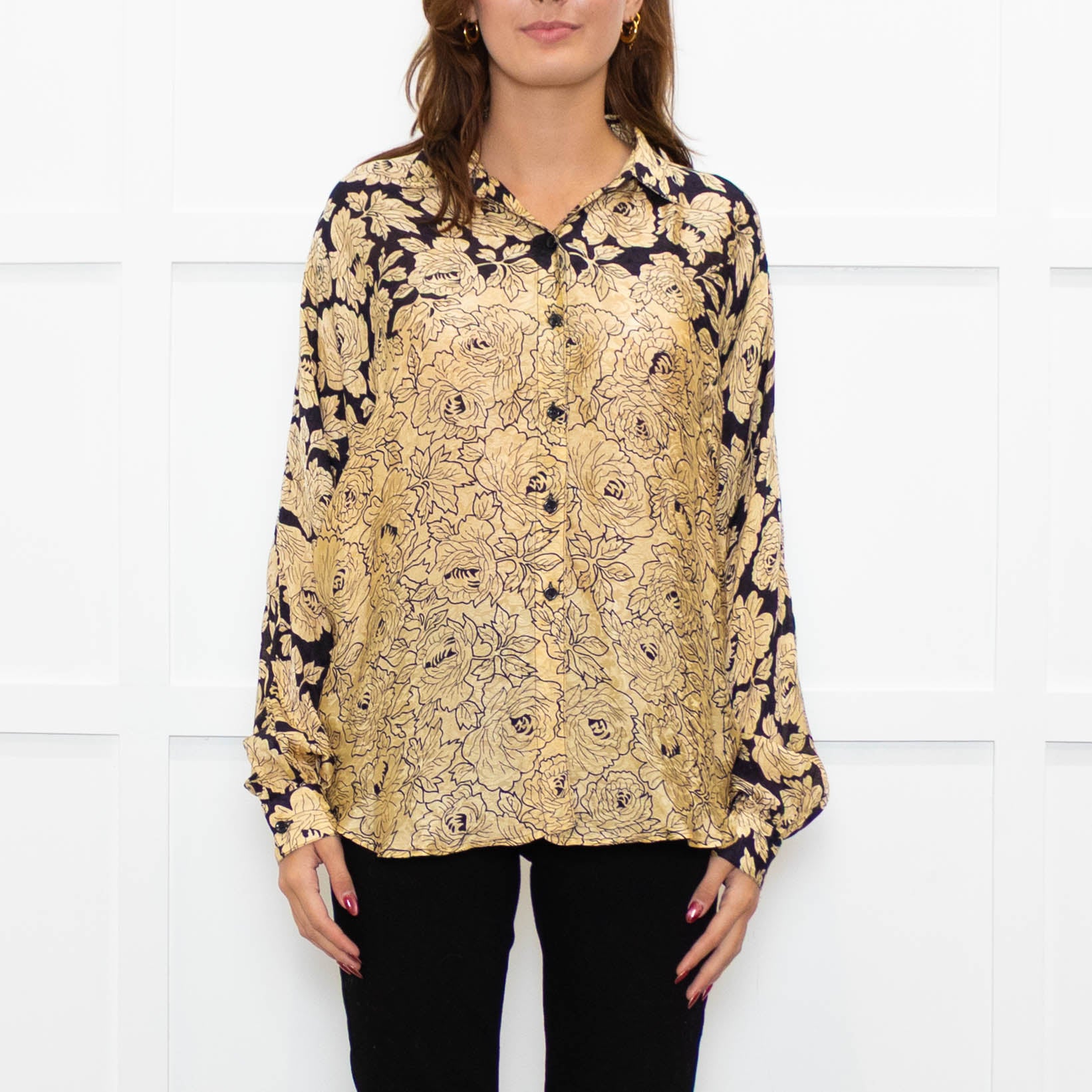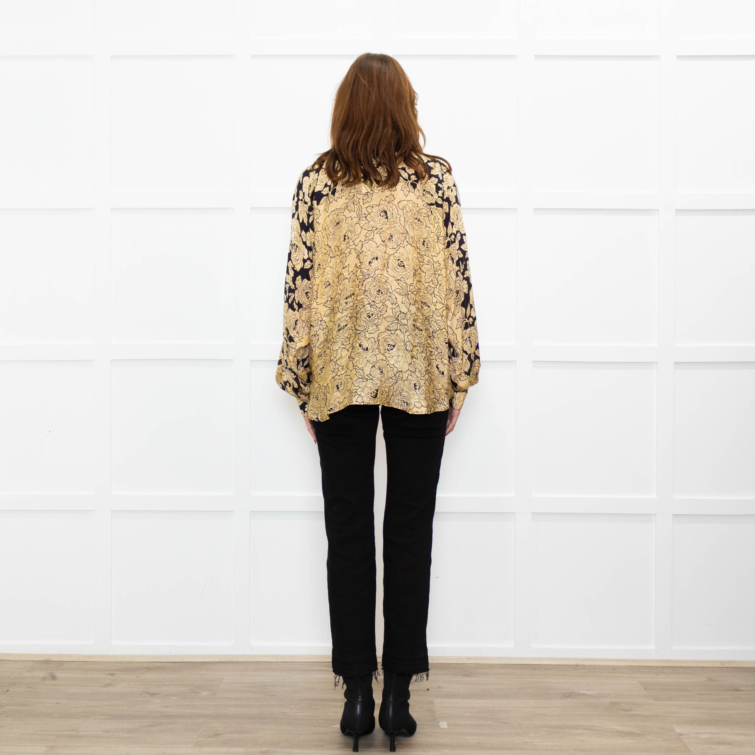 Mes Demoiselles gold and black floral blouse featuring a delicate button-up front and elegant, lightweight design.