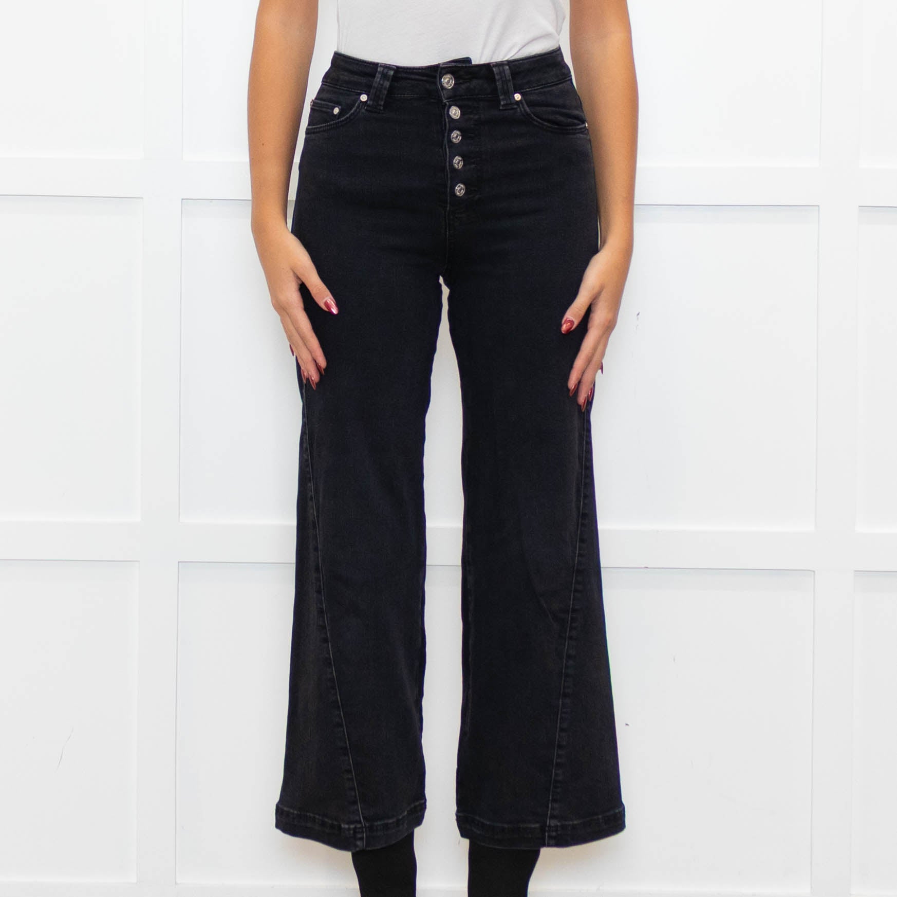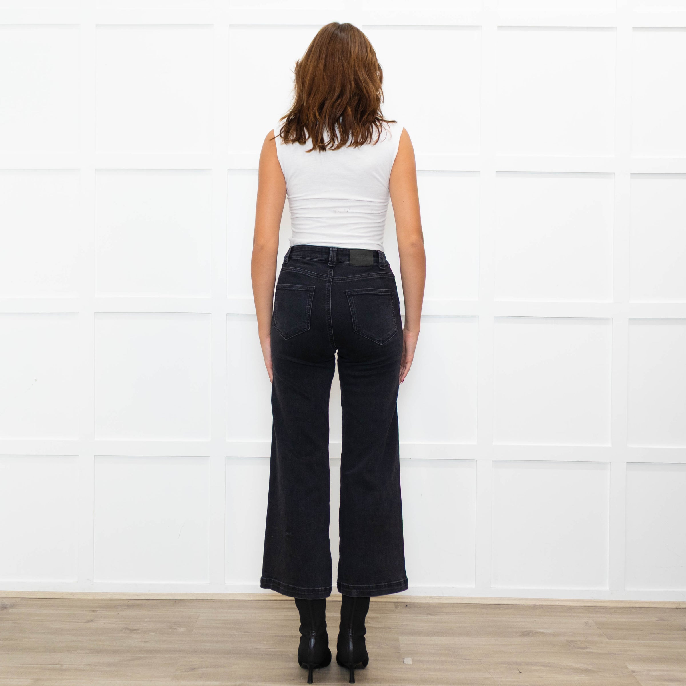 Paige black denim Anessa twisted seam cropped jeans with belt loops, silver-tone hardware detailing, five pockets, and an exposed button fly.