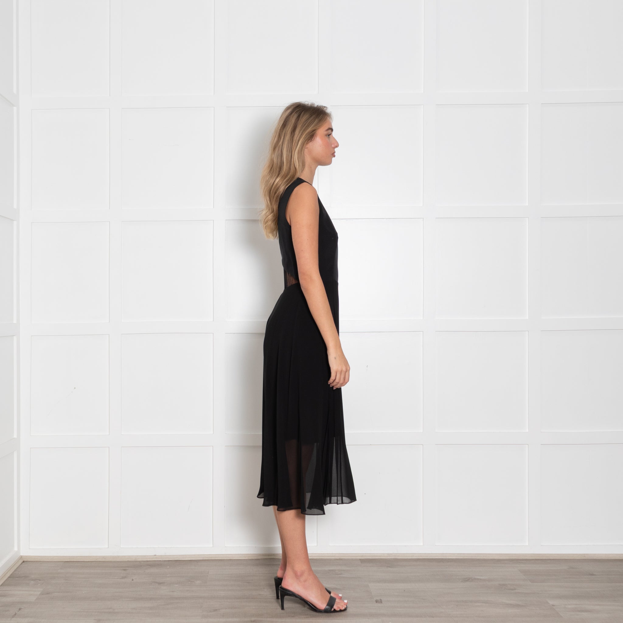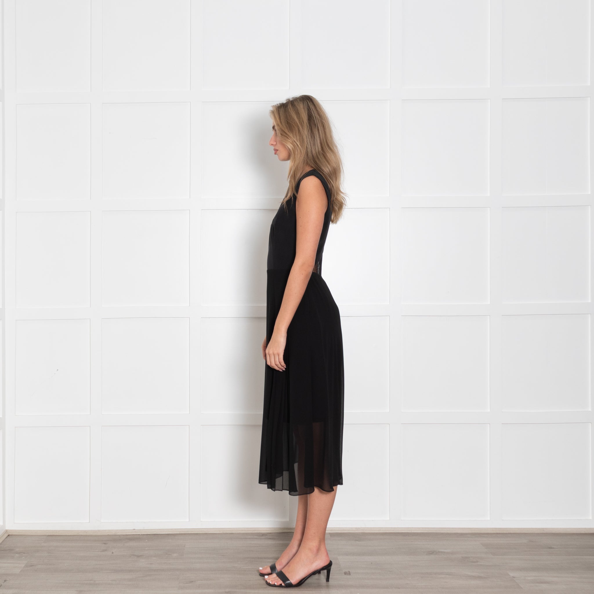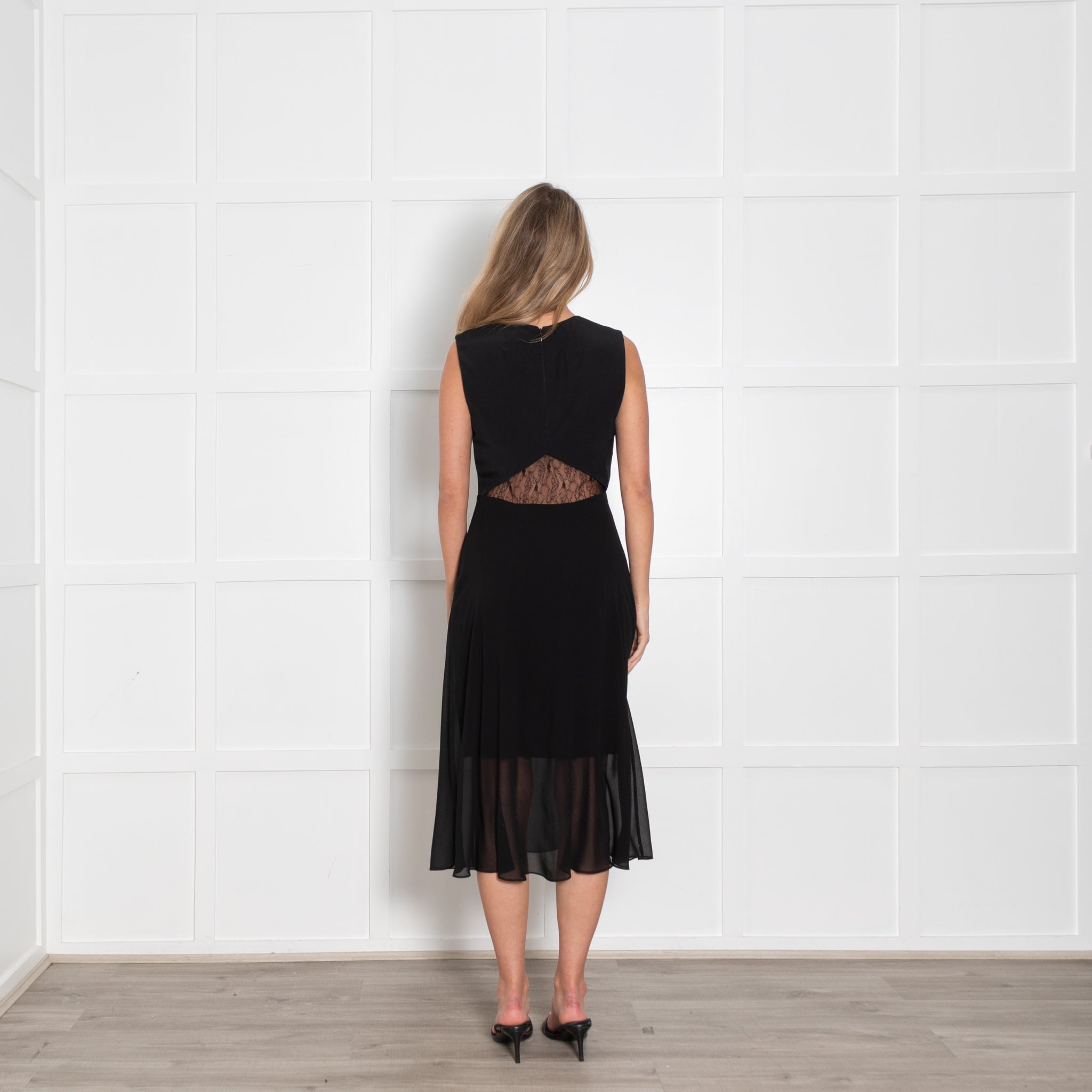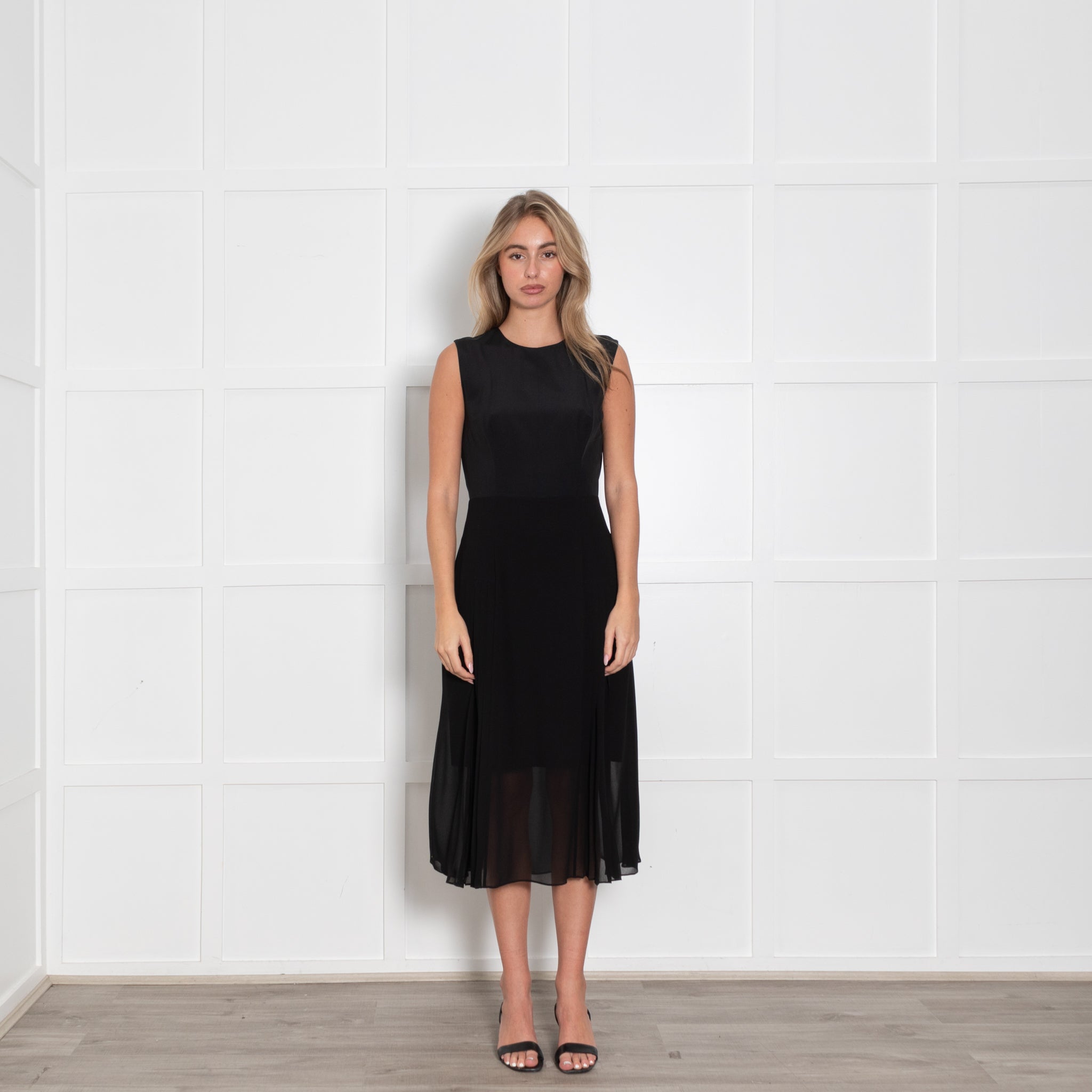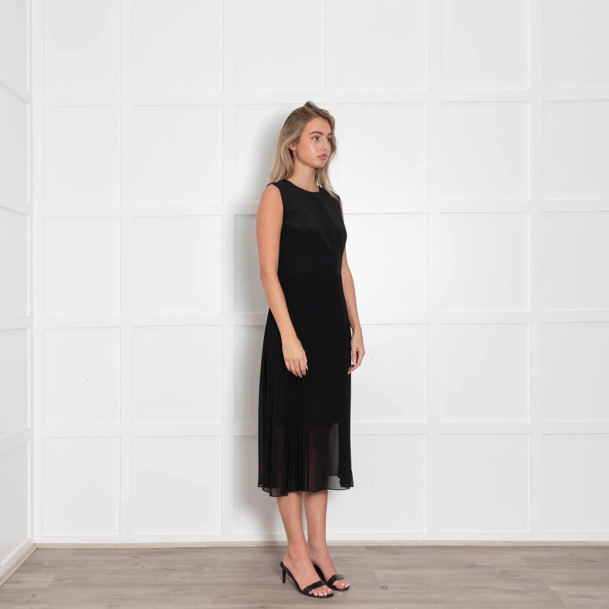 Paul Smith black sleeveless dress, crafted with a soft silk fabric, featuring a pleated skirt, and a back lace detailed design, with a classic rounded neckline and a back and side zip-up closure.