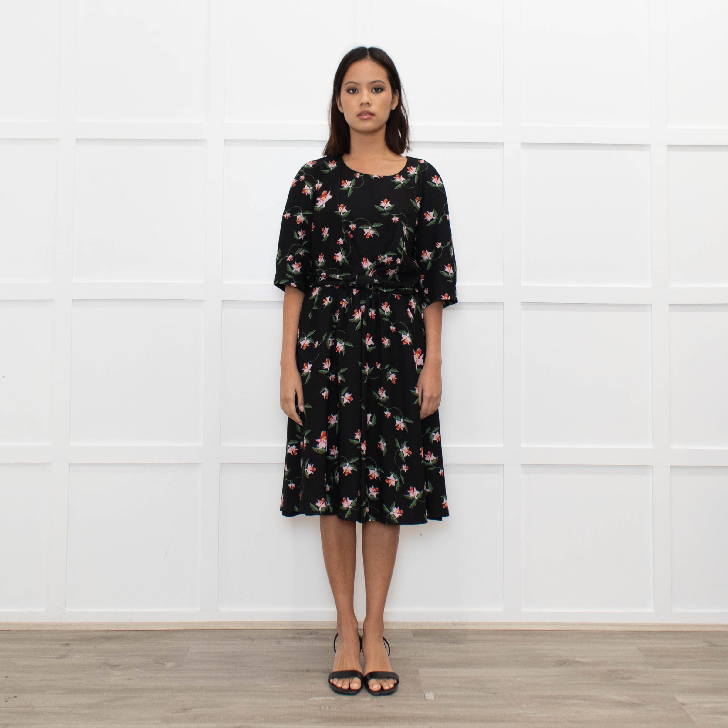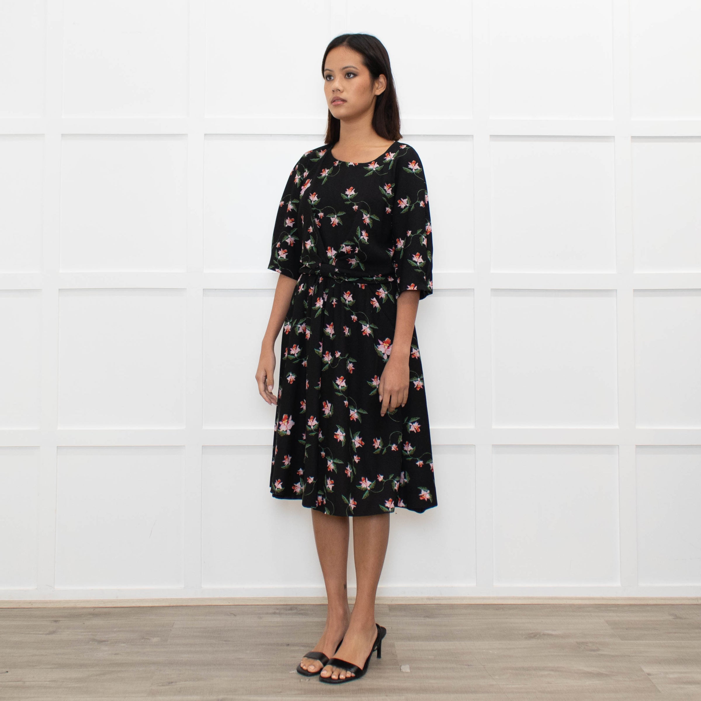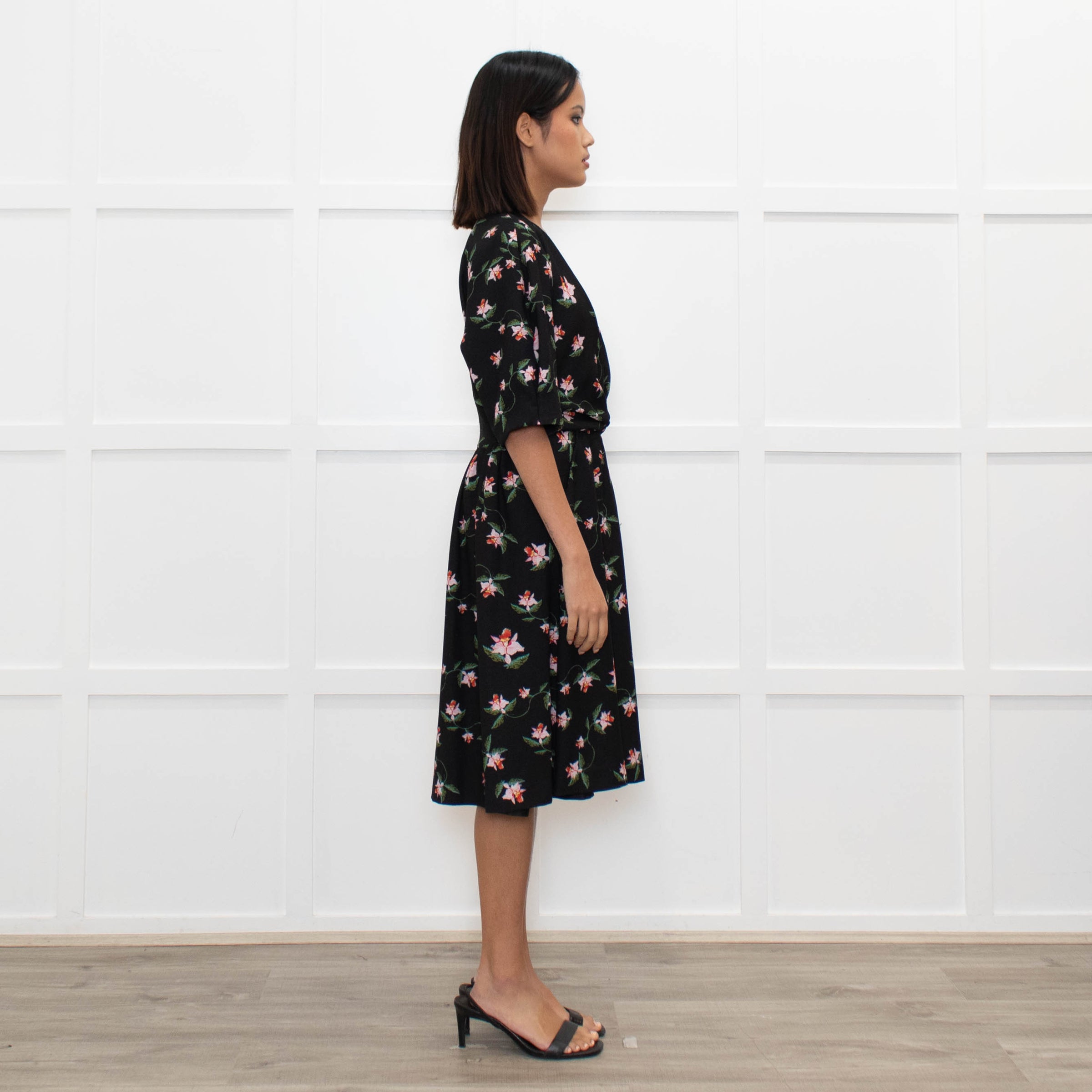 Preen By Thornton Bregazzi black and pink floral midi dress with a bow-style waist and two side slip pockets.