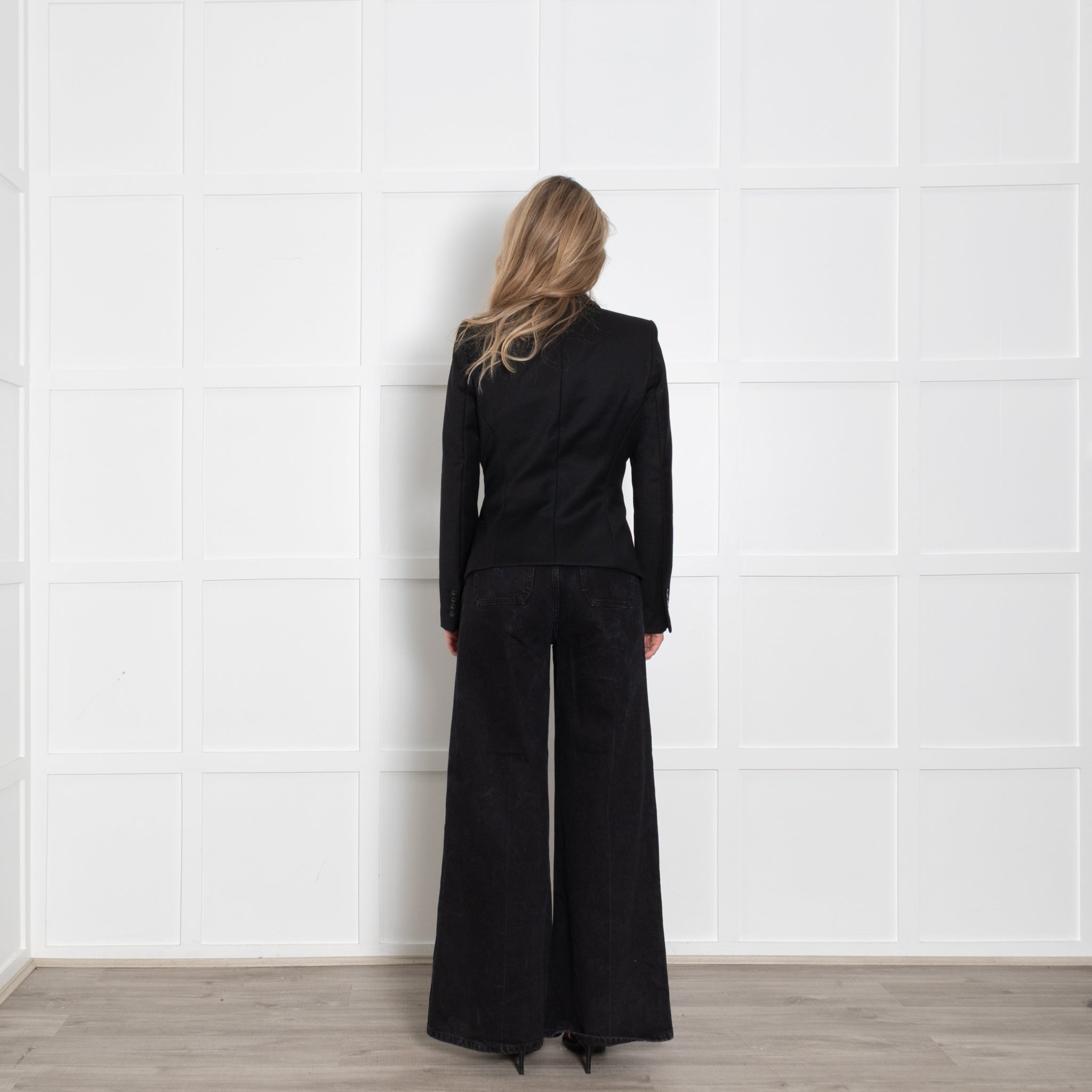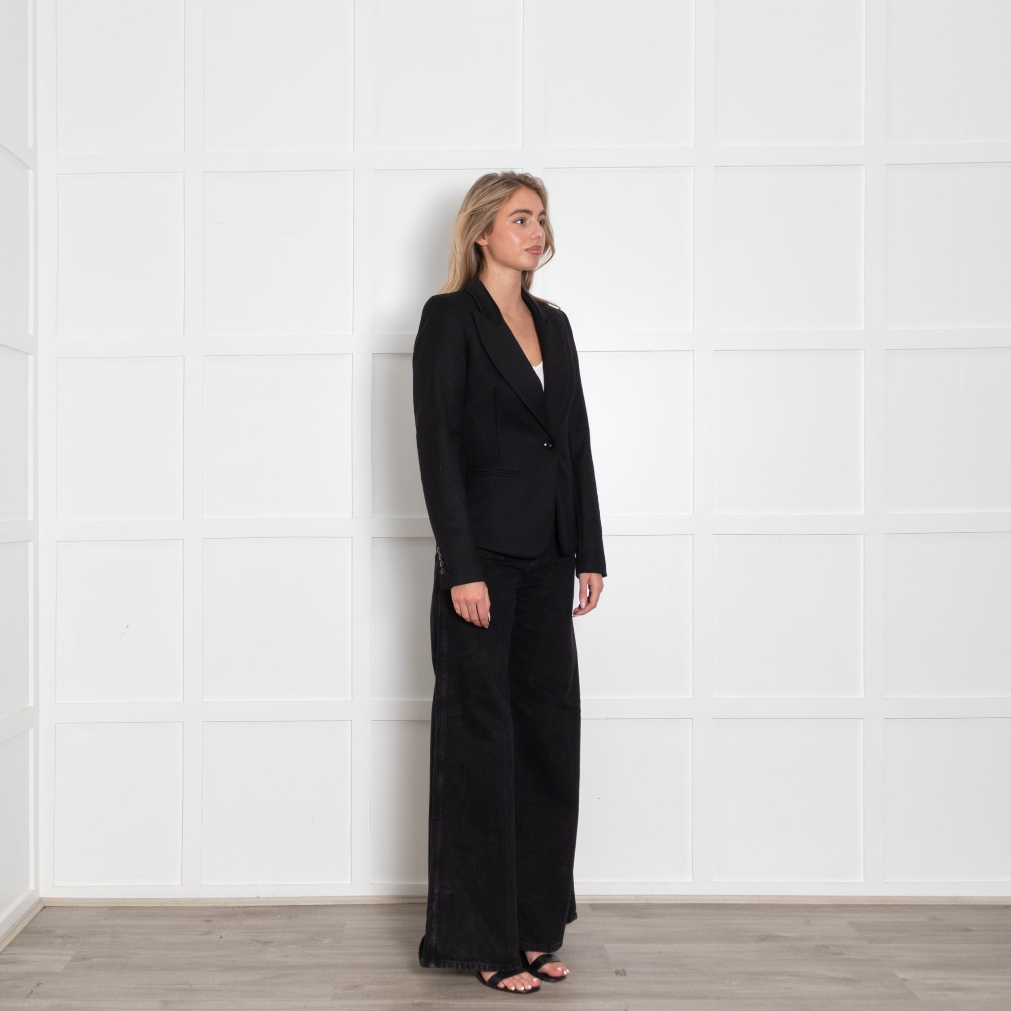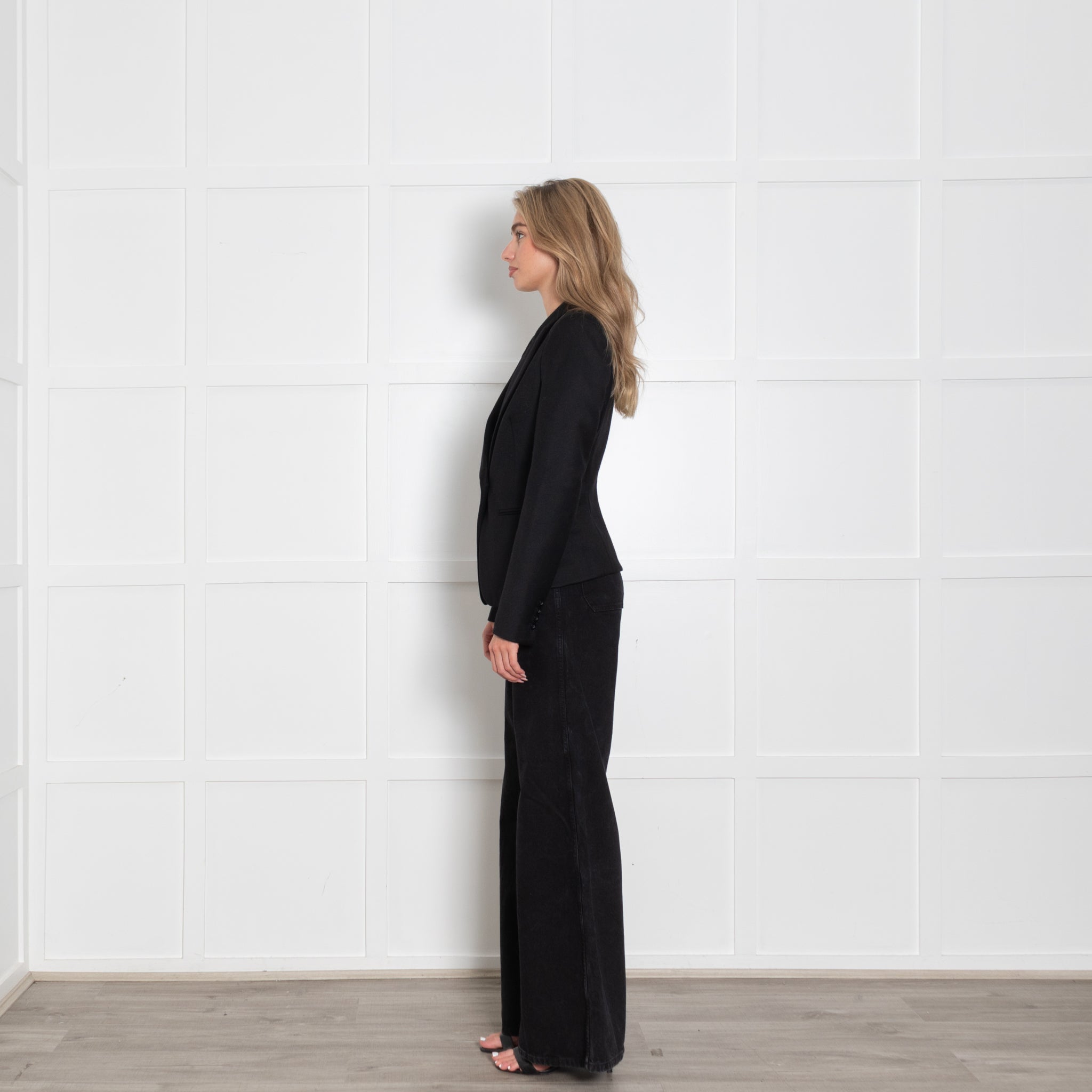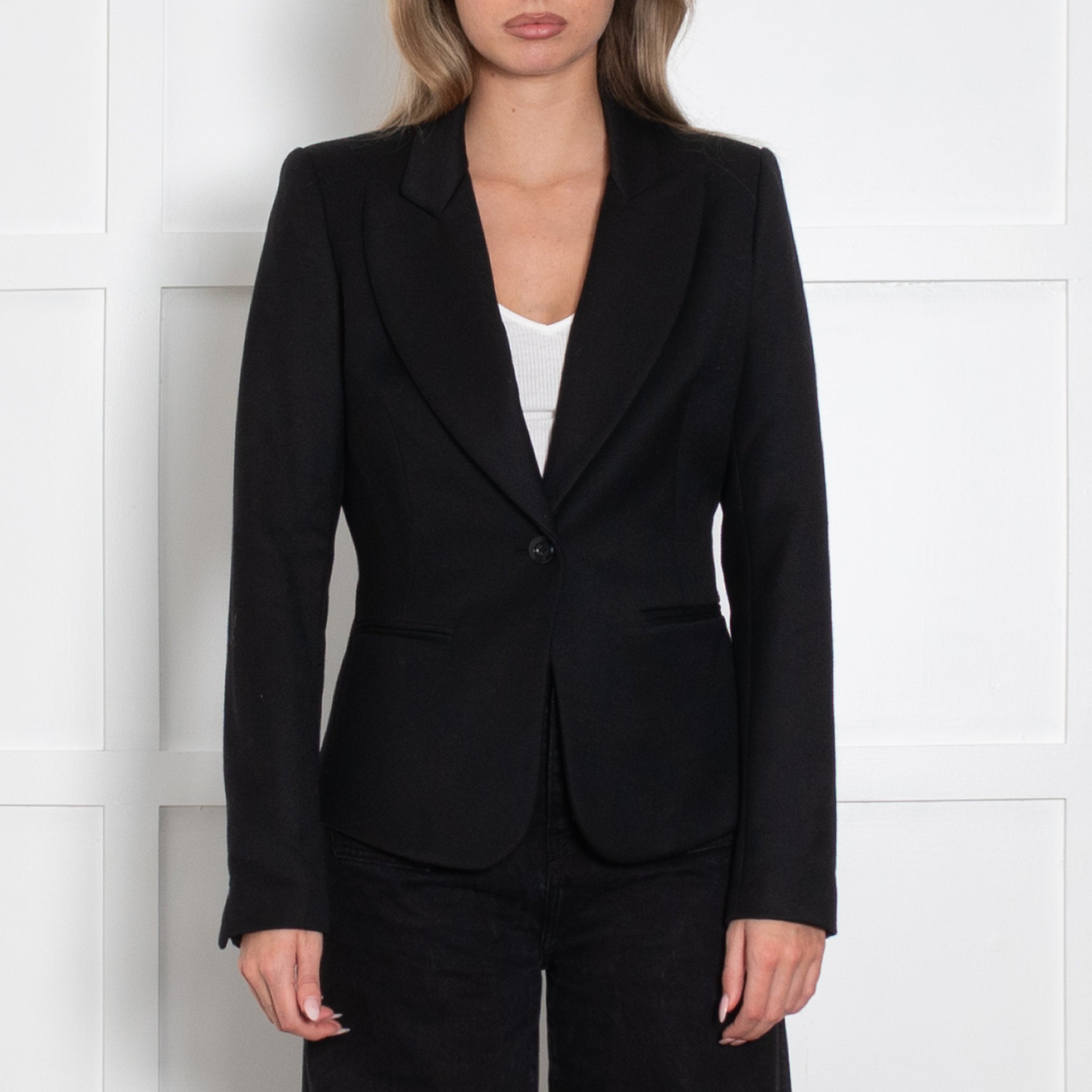 Rachel Zoe wool black blazer jacket with a single button closure to create an elegant look.