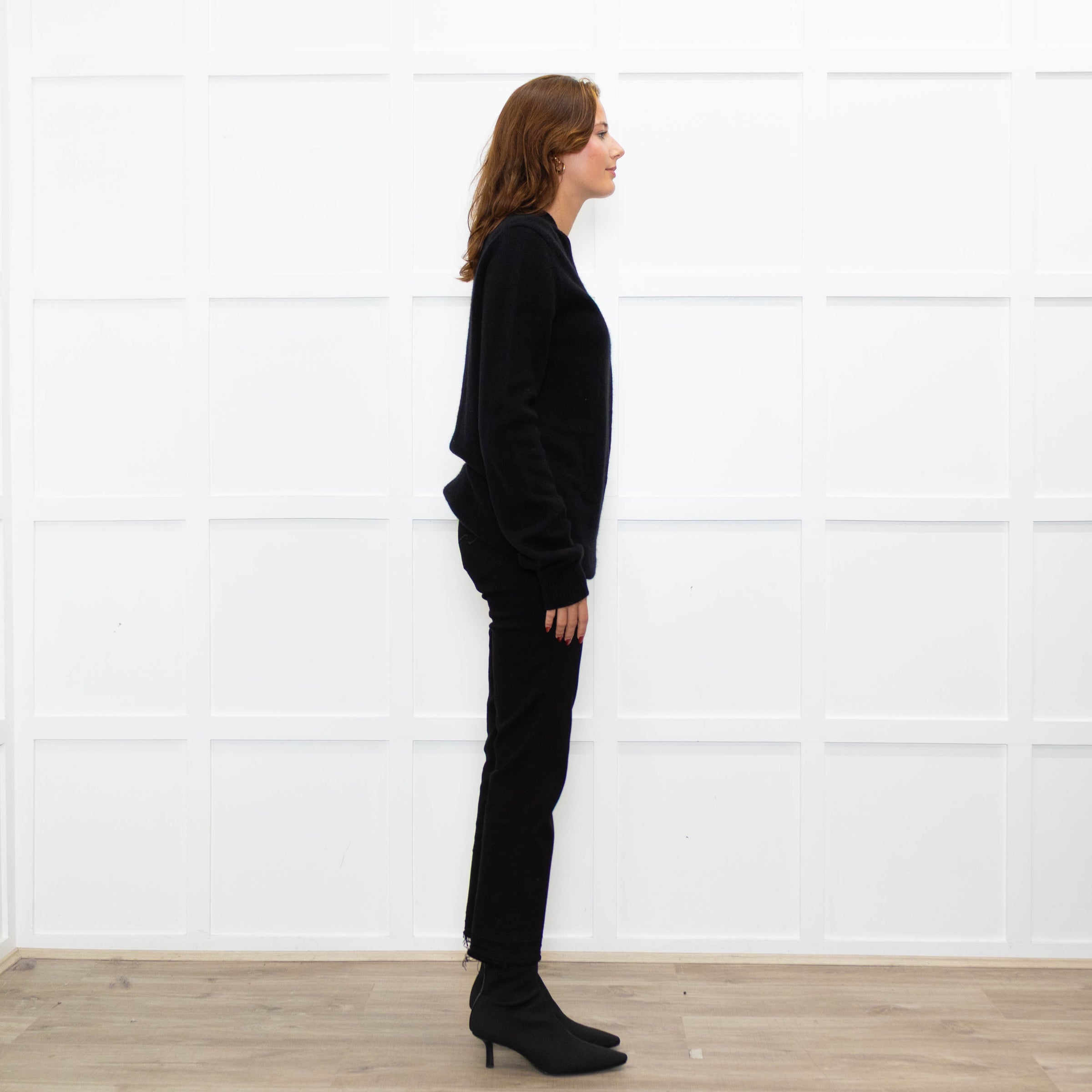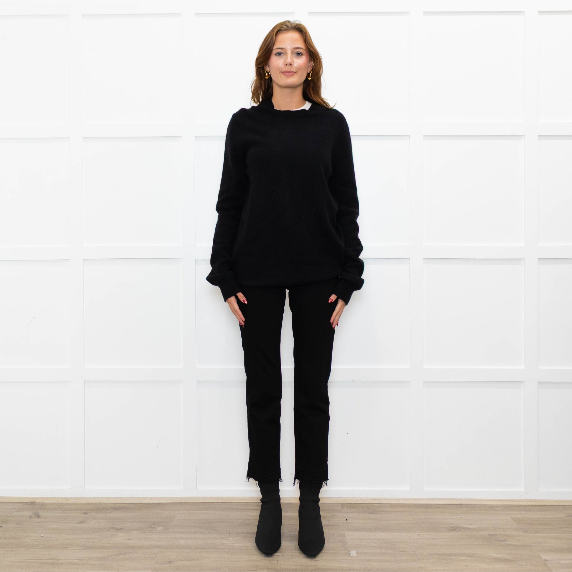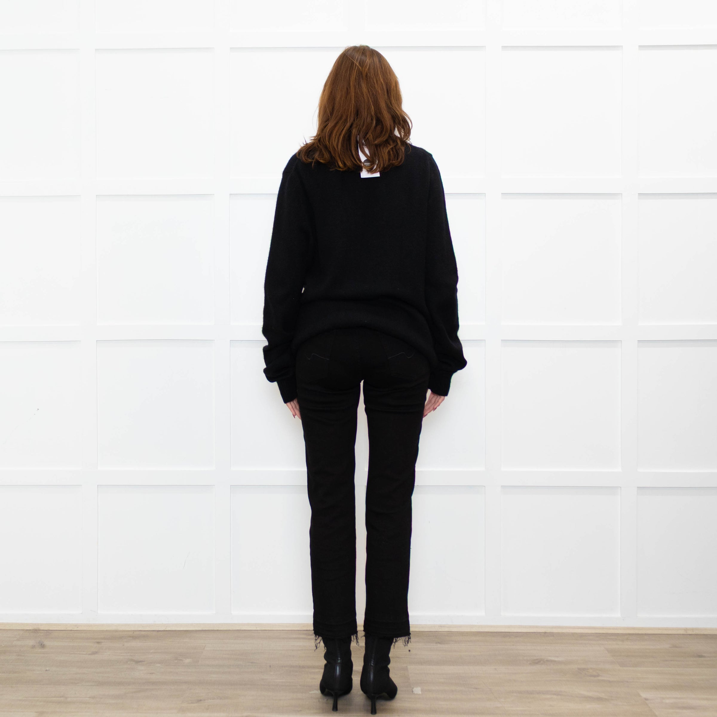Raey black cashmere blend oversized longline jumper with a rounded neckline, long sleeves, and ribbed trims.