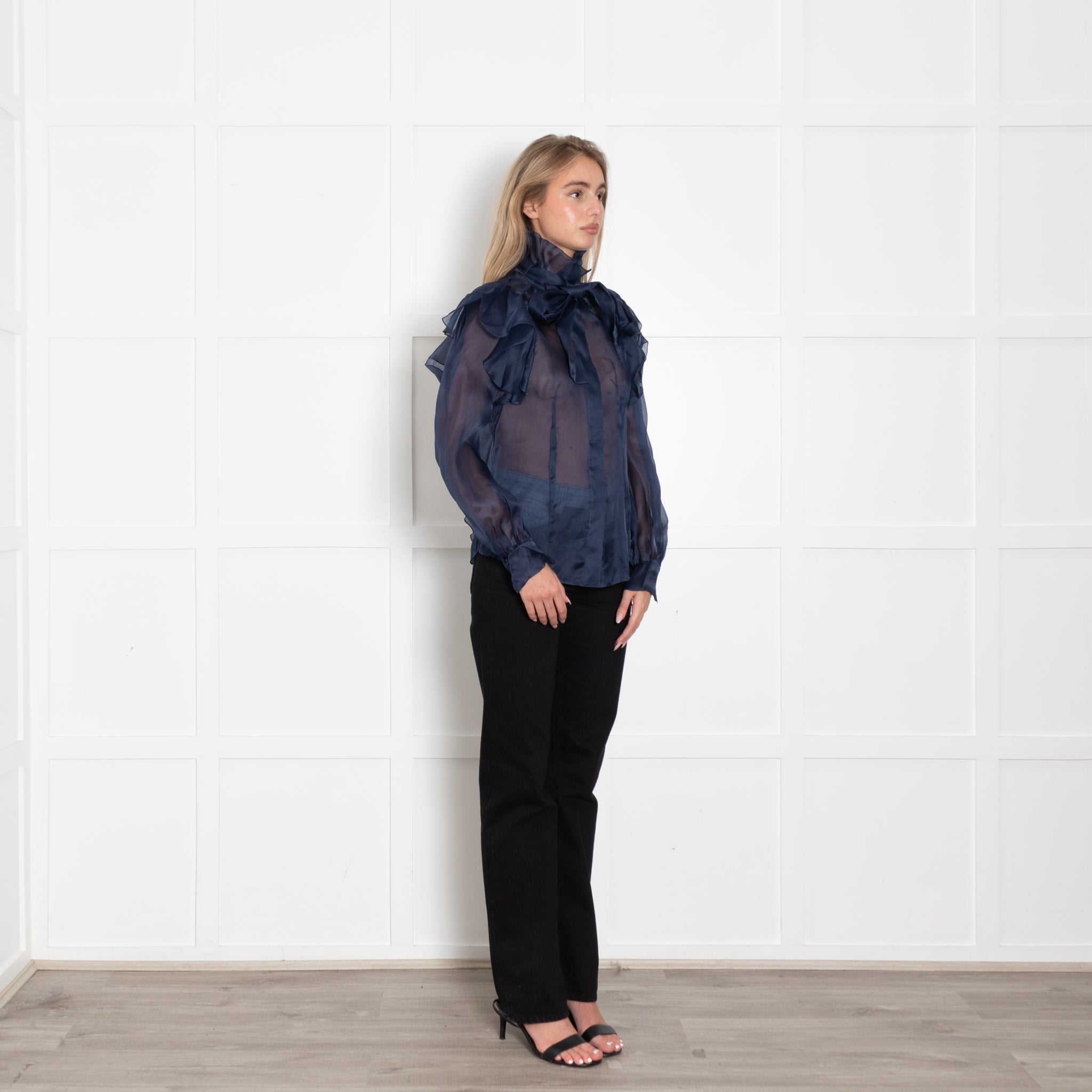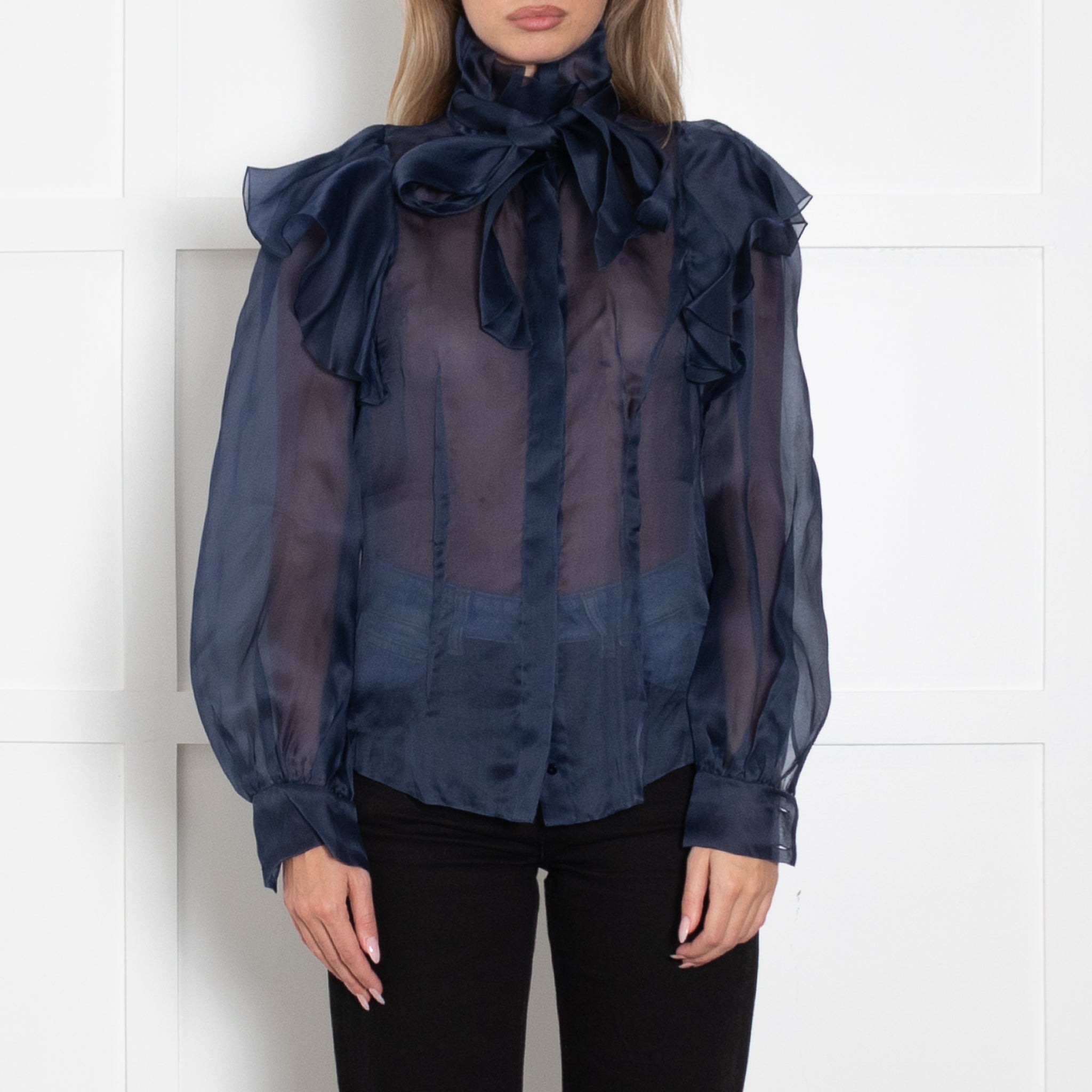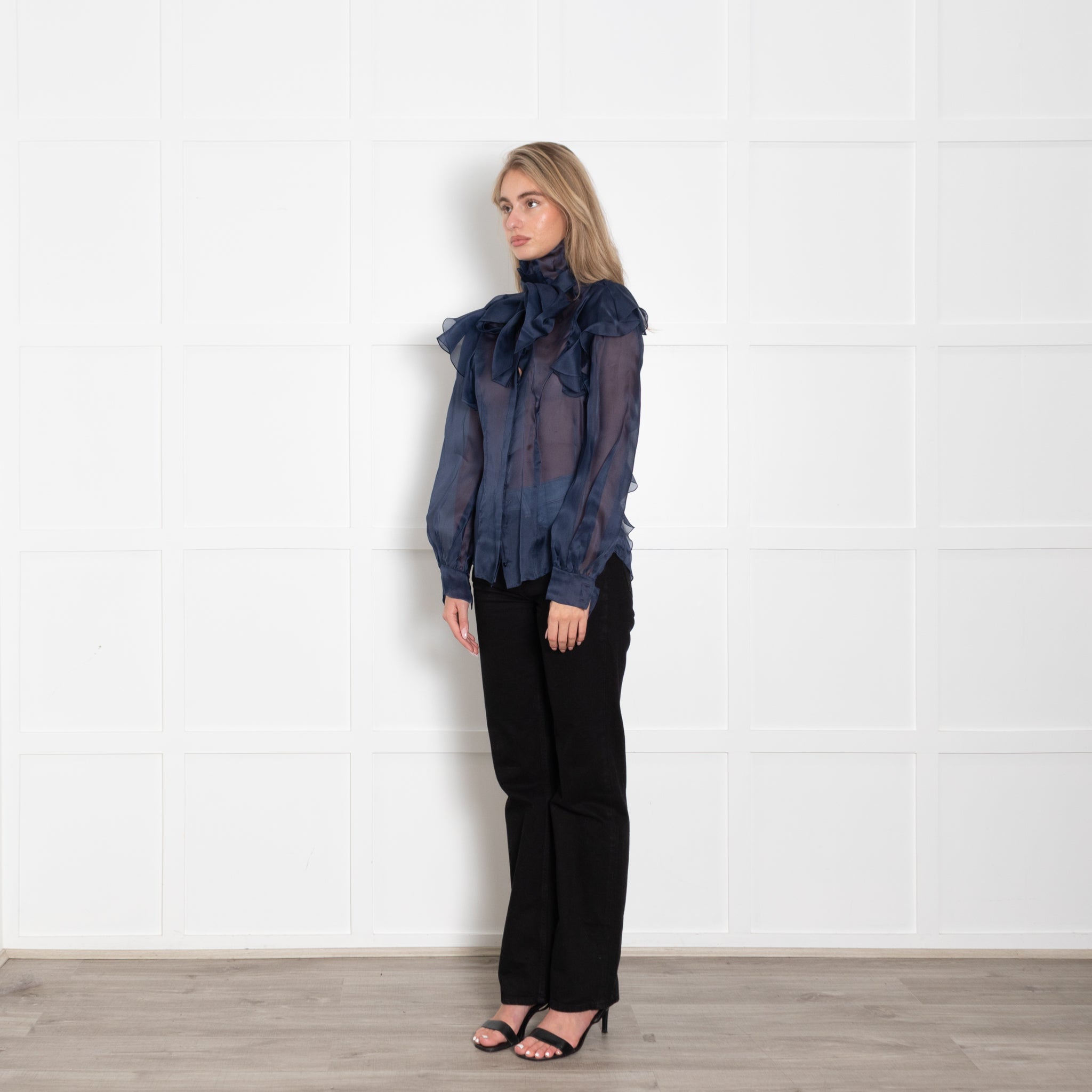 Ralph & Russo long-sleeve blue blouse, crafted with a stunning silk fabric, with an organza ruffle design, a high neckline, and a button-up front closure. This blouse features a gorgeous blue silk adjustable neck tie.