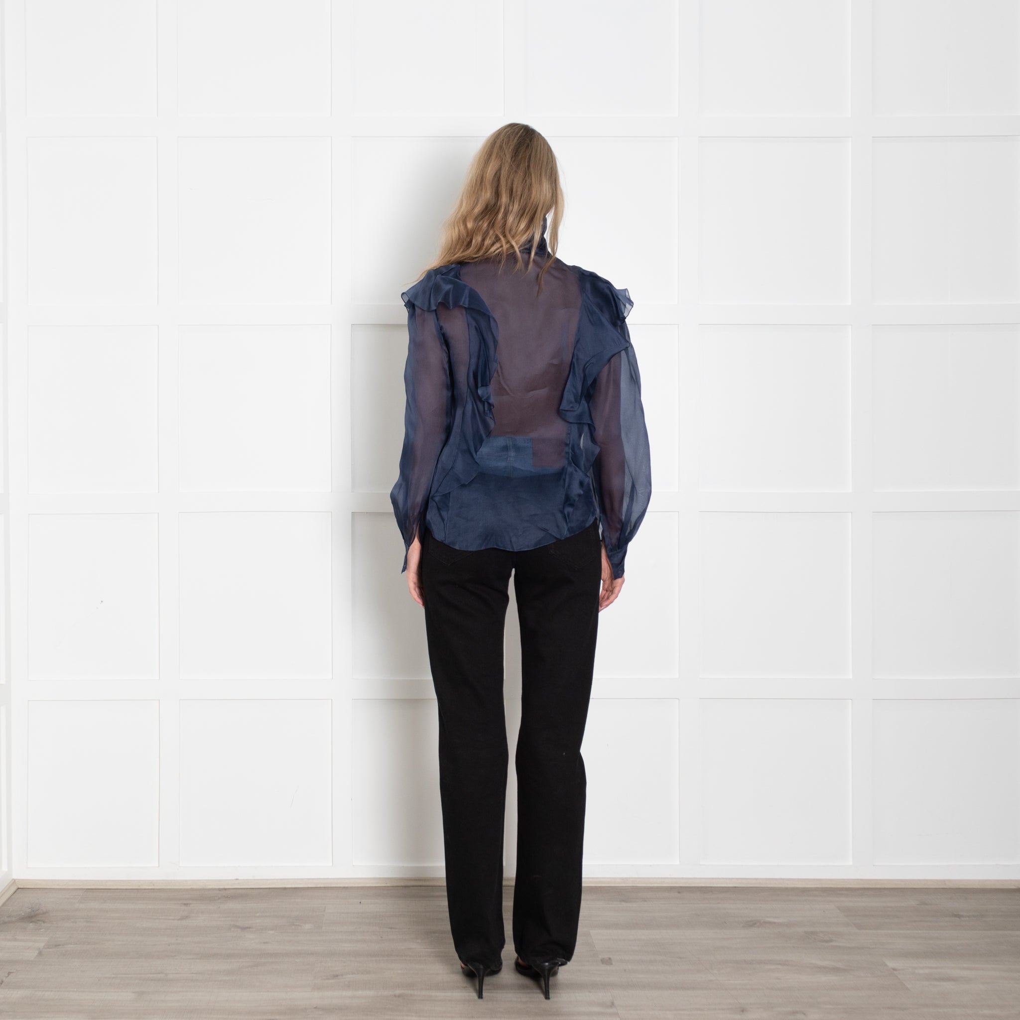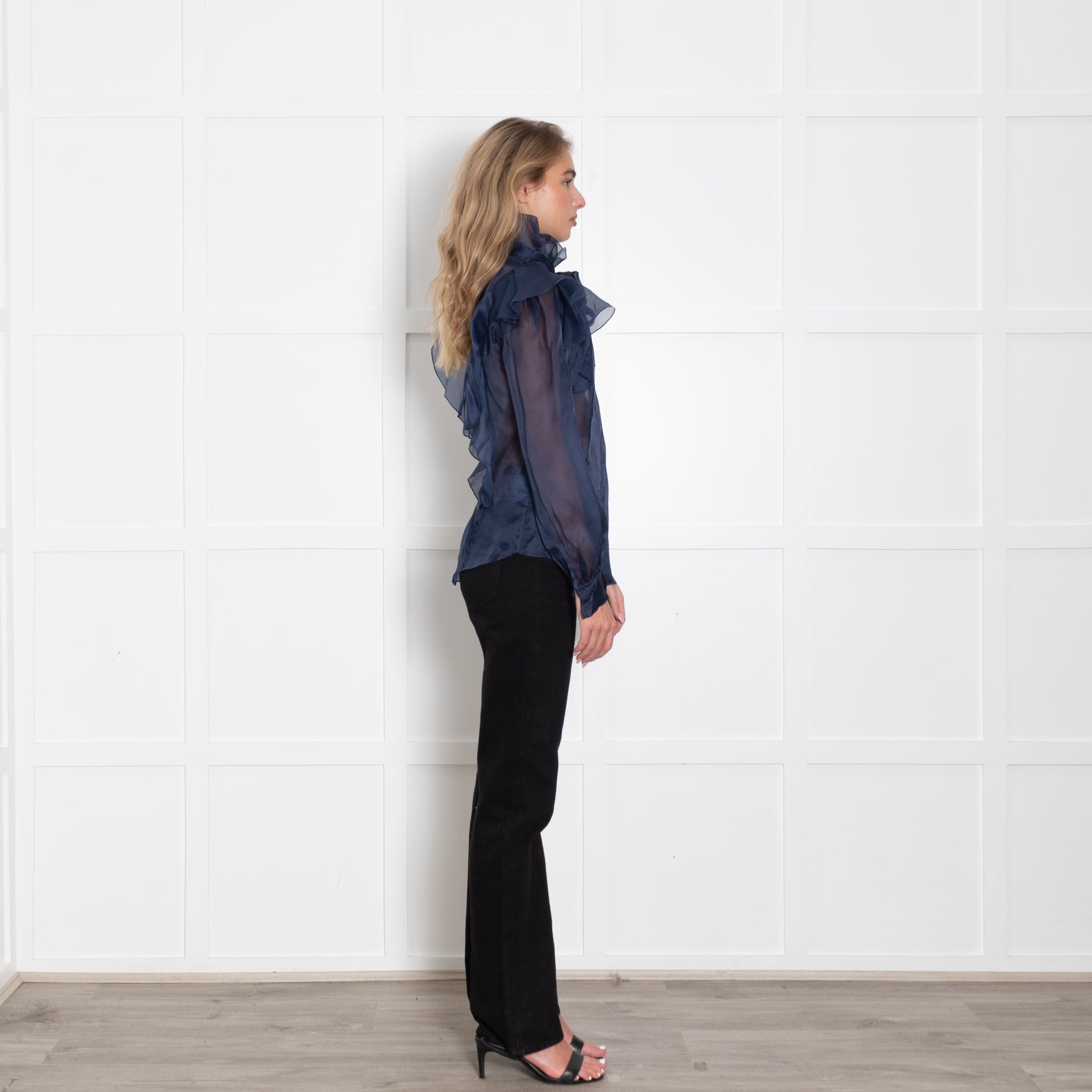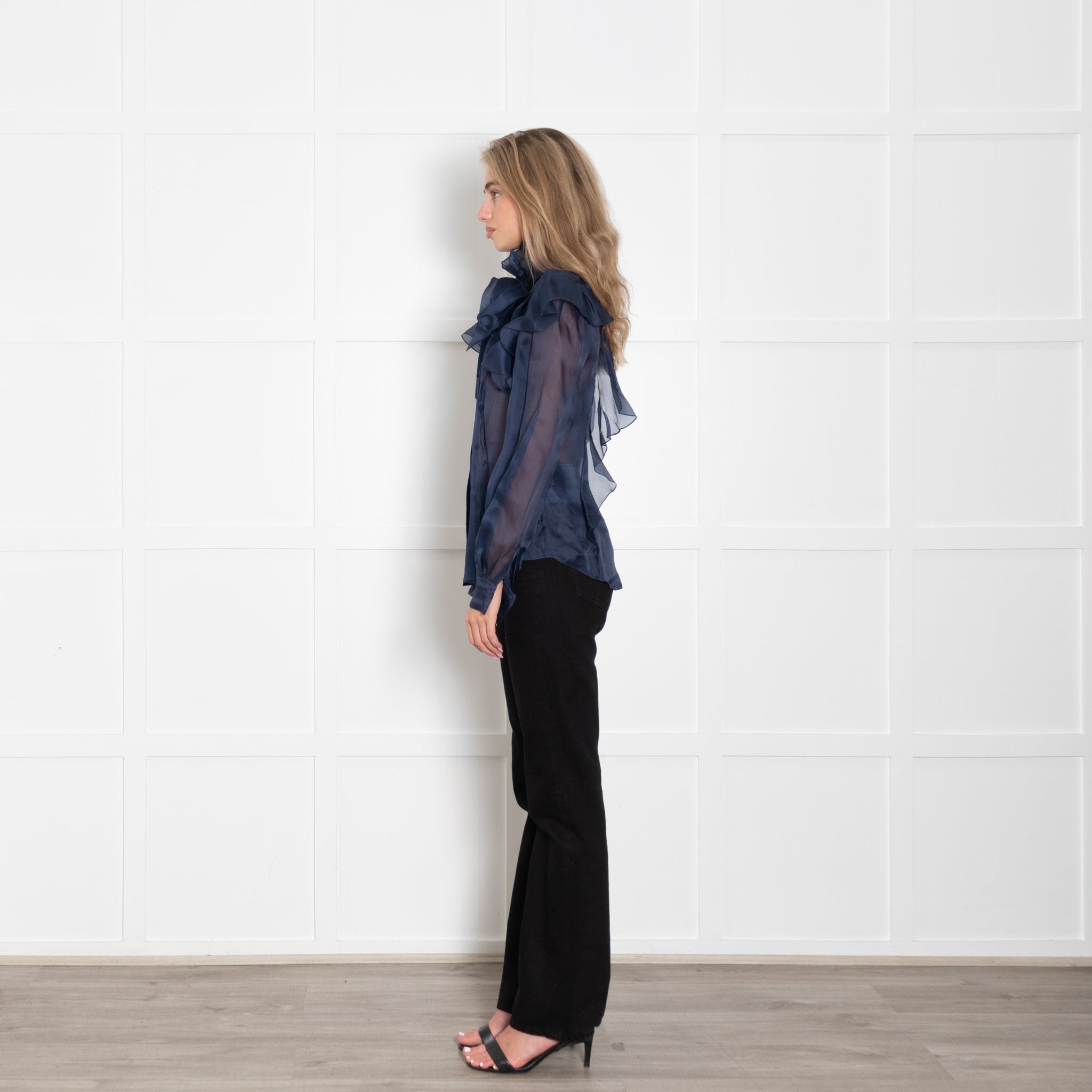 Ralph & Russo long-sleeve blue blouse, crafted with a stunning silk fabric, with an organza ruffle design, a high neckline, and a button-up front closure. This blouse features a gorgeous blue silk adjustable neck tie.