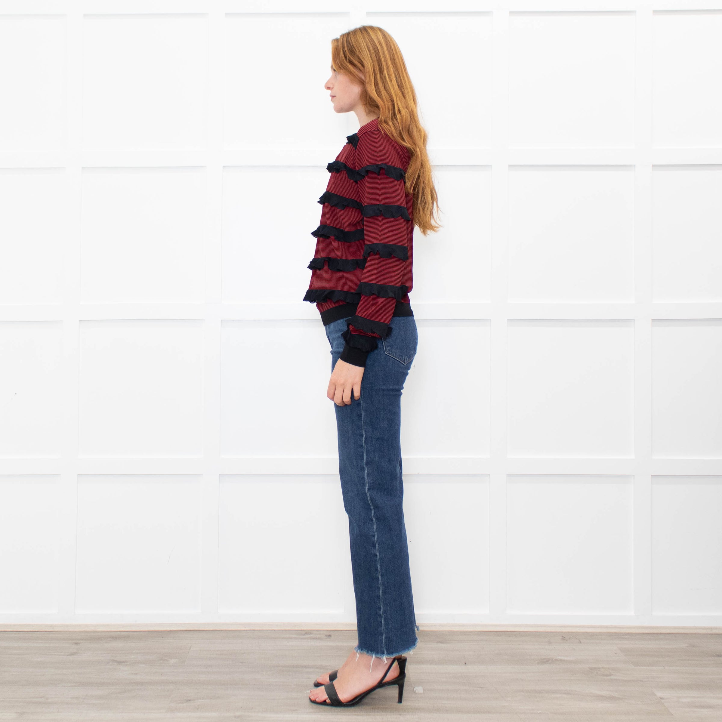 Red Valentino black and red striped knit jumper with frilled stripe detailing, long sleeves, a rounded neckline, and ribbed trim detailing.
