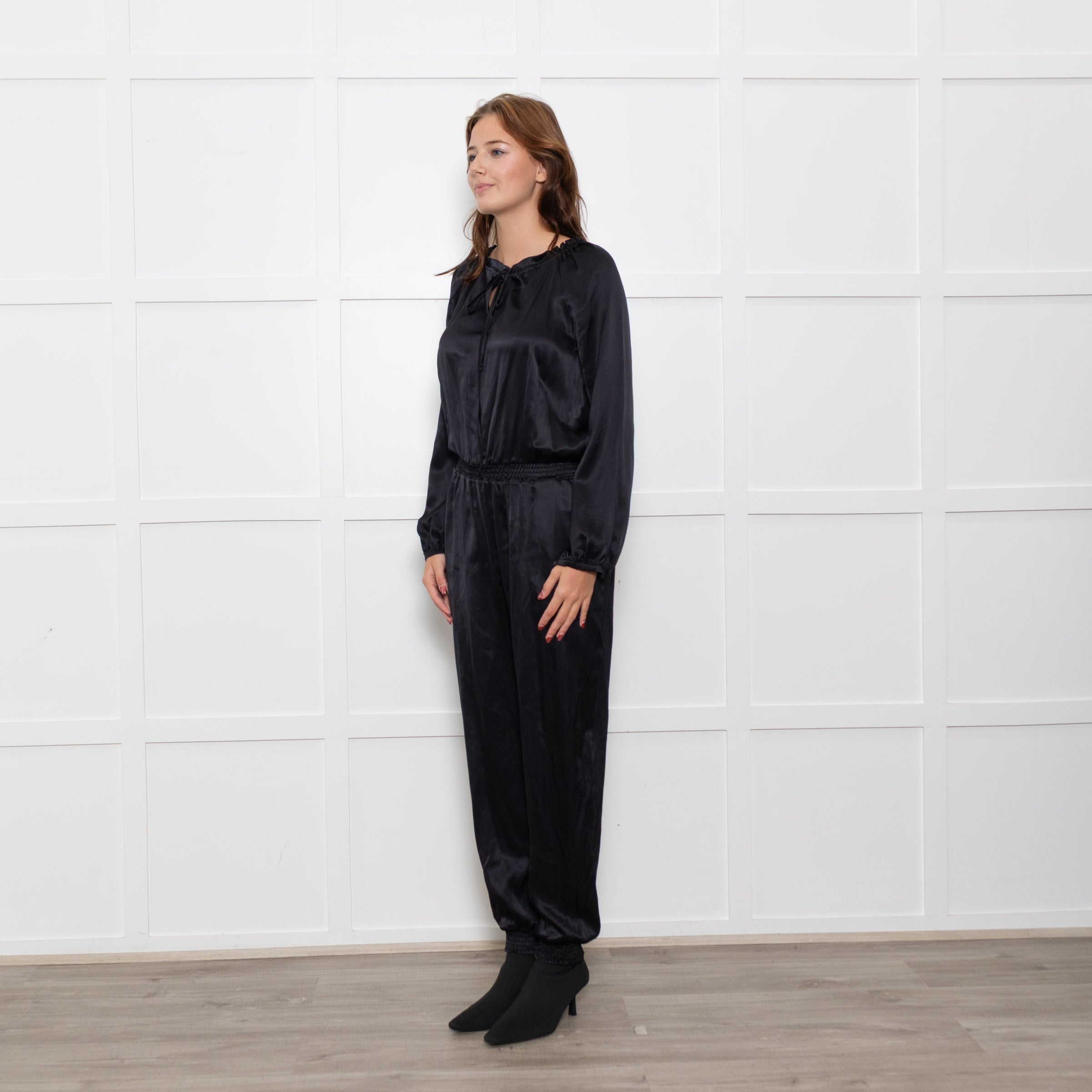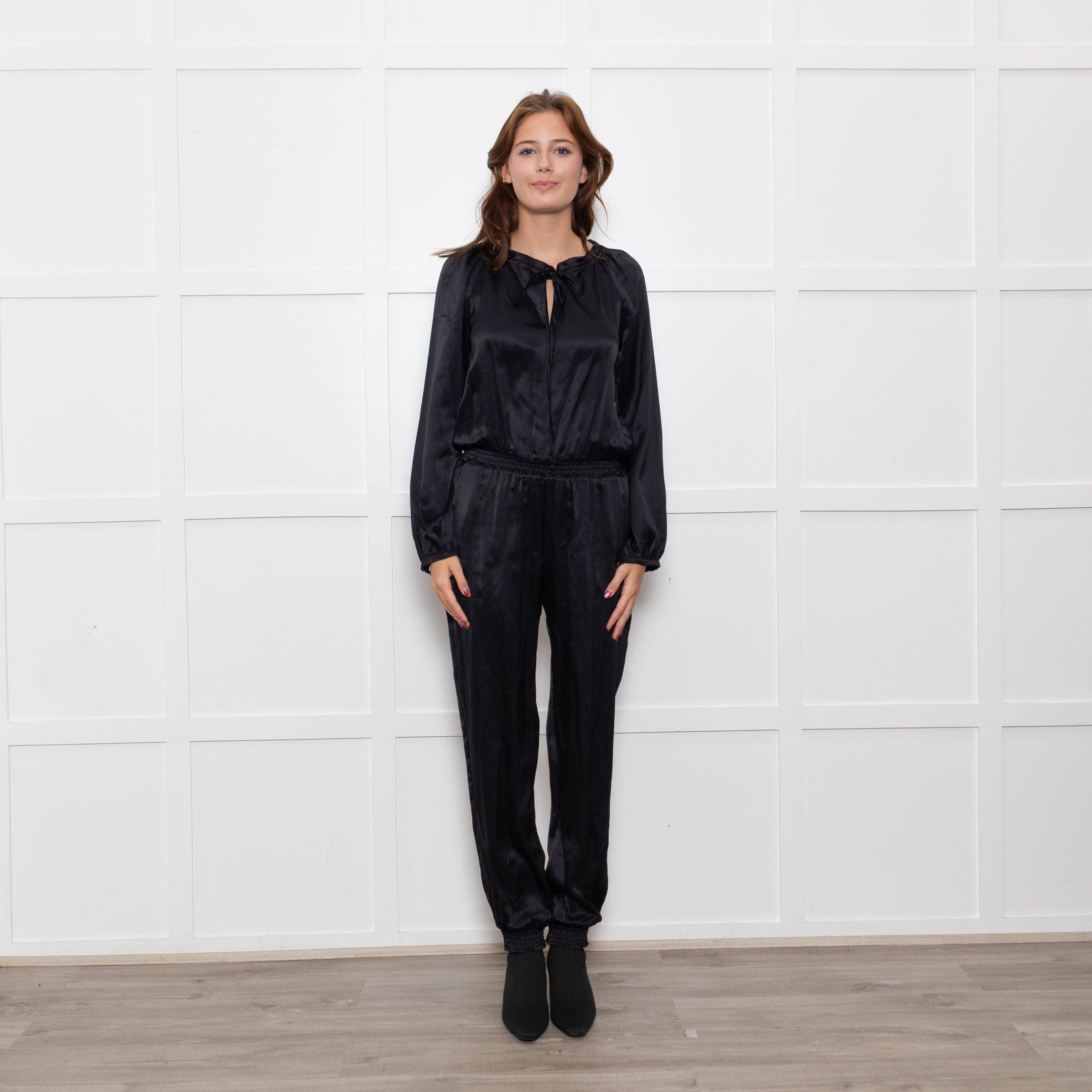 Ridley black silk jumpsuit, featuring an elasticated, ruched waist for a flattering silhouette and a delicate tie detail at the neckline for an elegant finish.