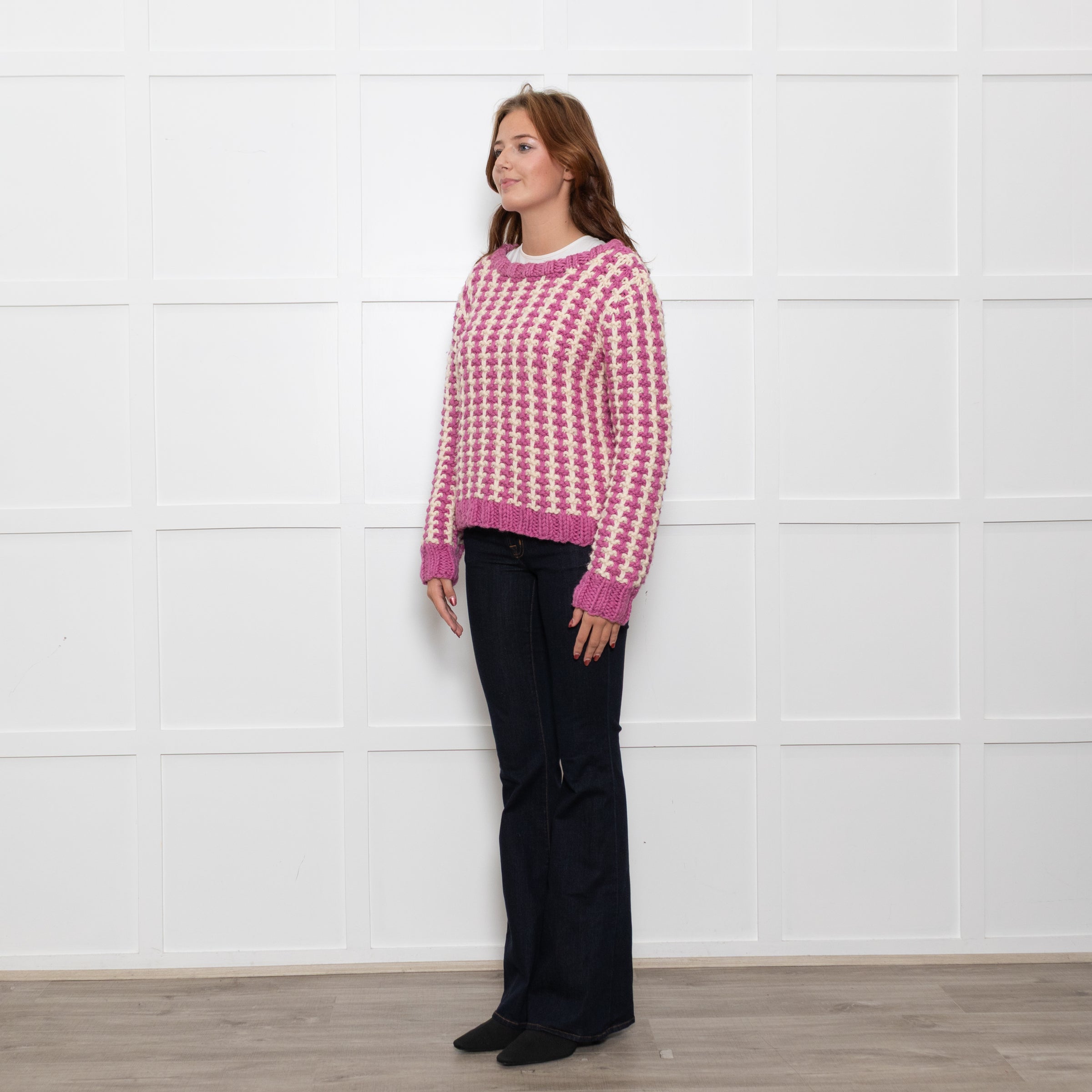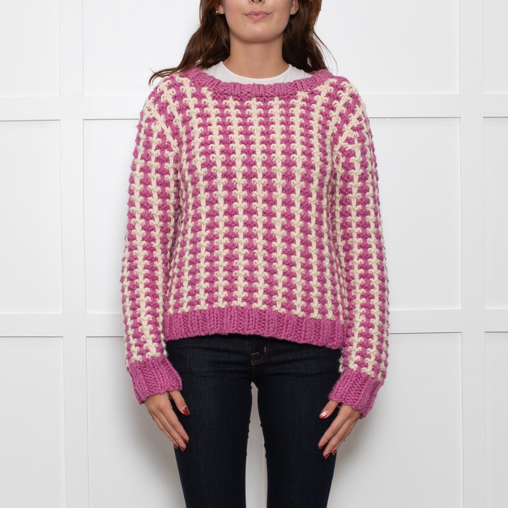 Ridley cream purple jumper with a beautiful chunky knit oversized design and a classic rounded-neck collar.