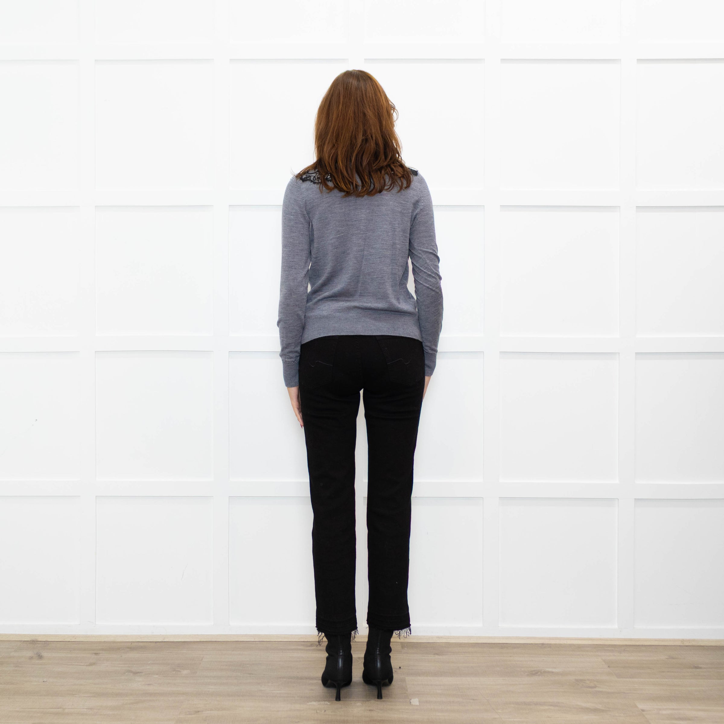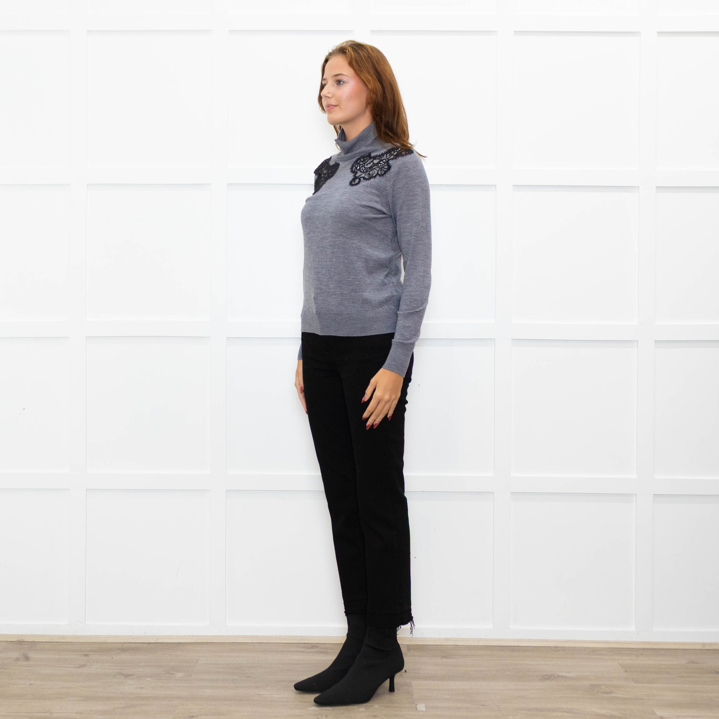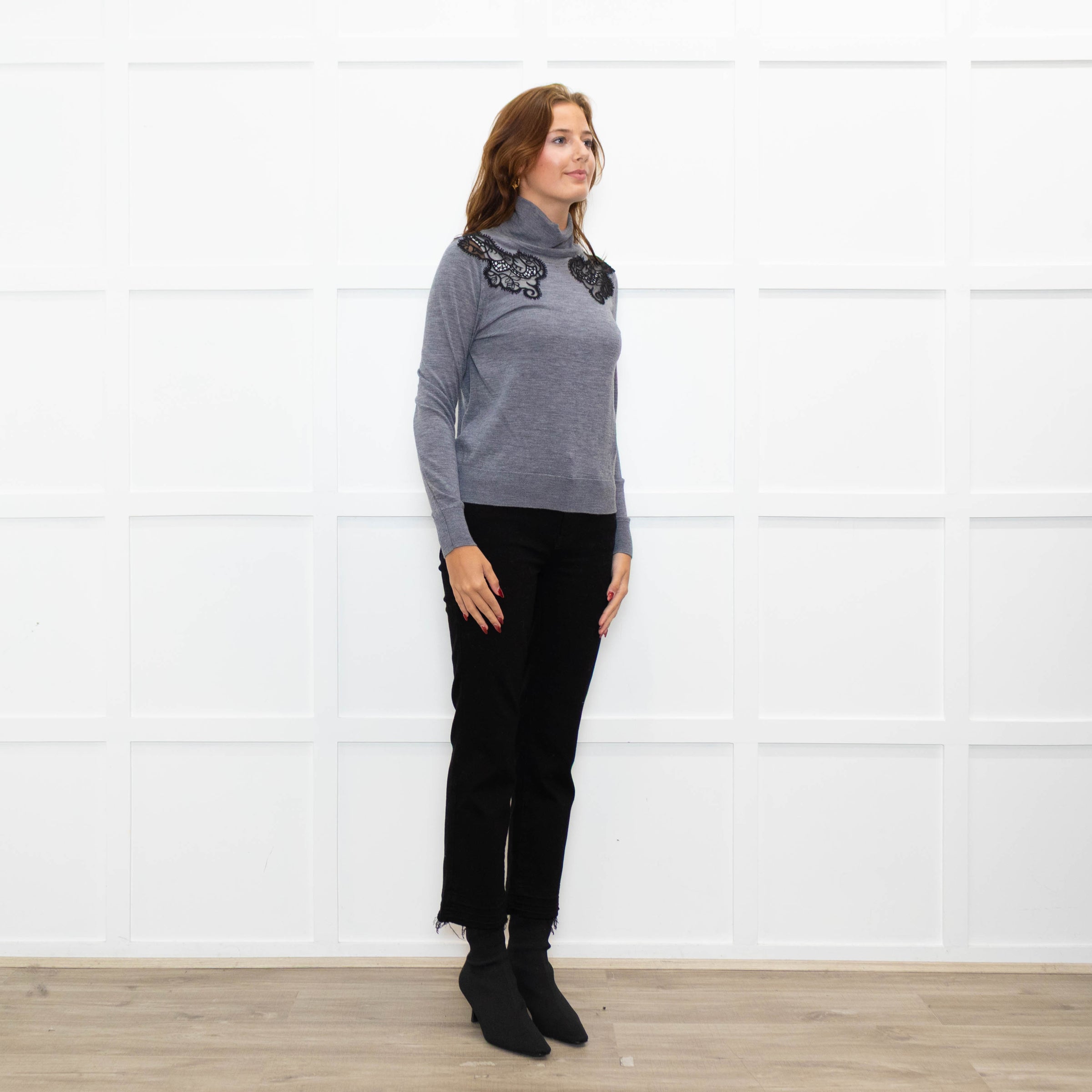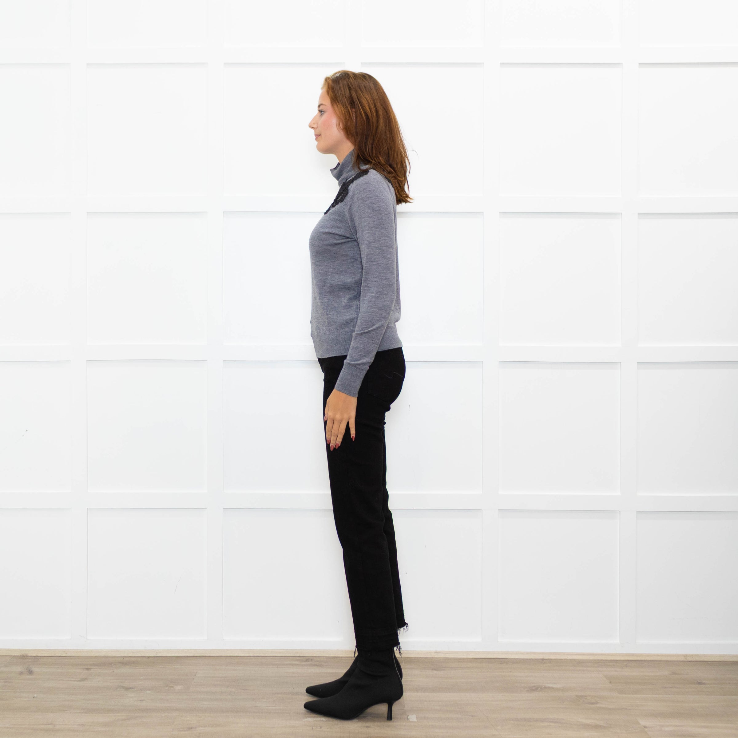 Sandro grey black lace detail fine sweater with a roll neck and ribbed trims.