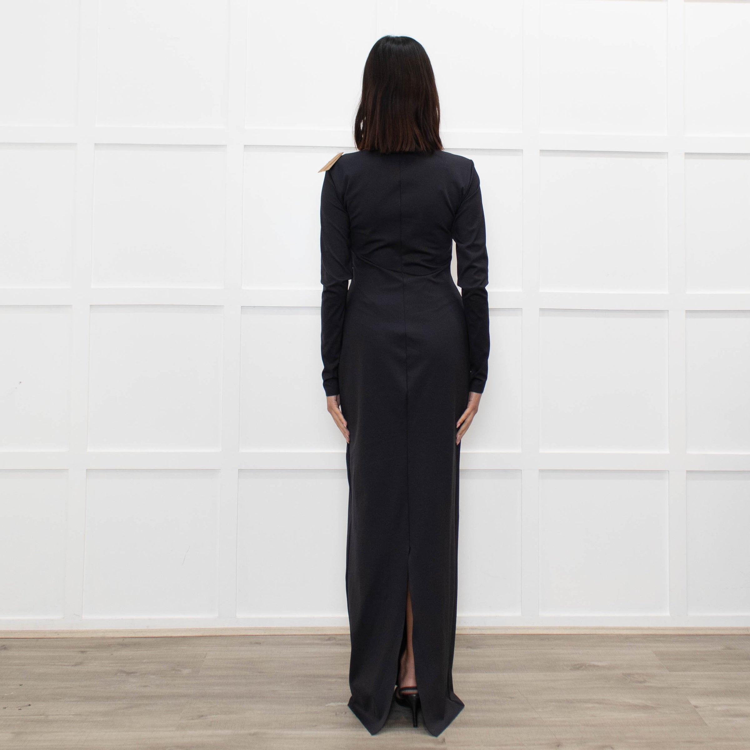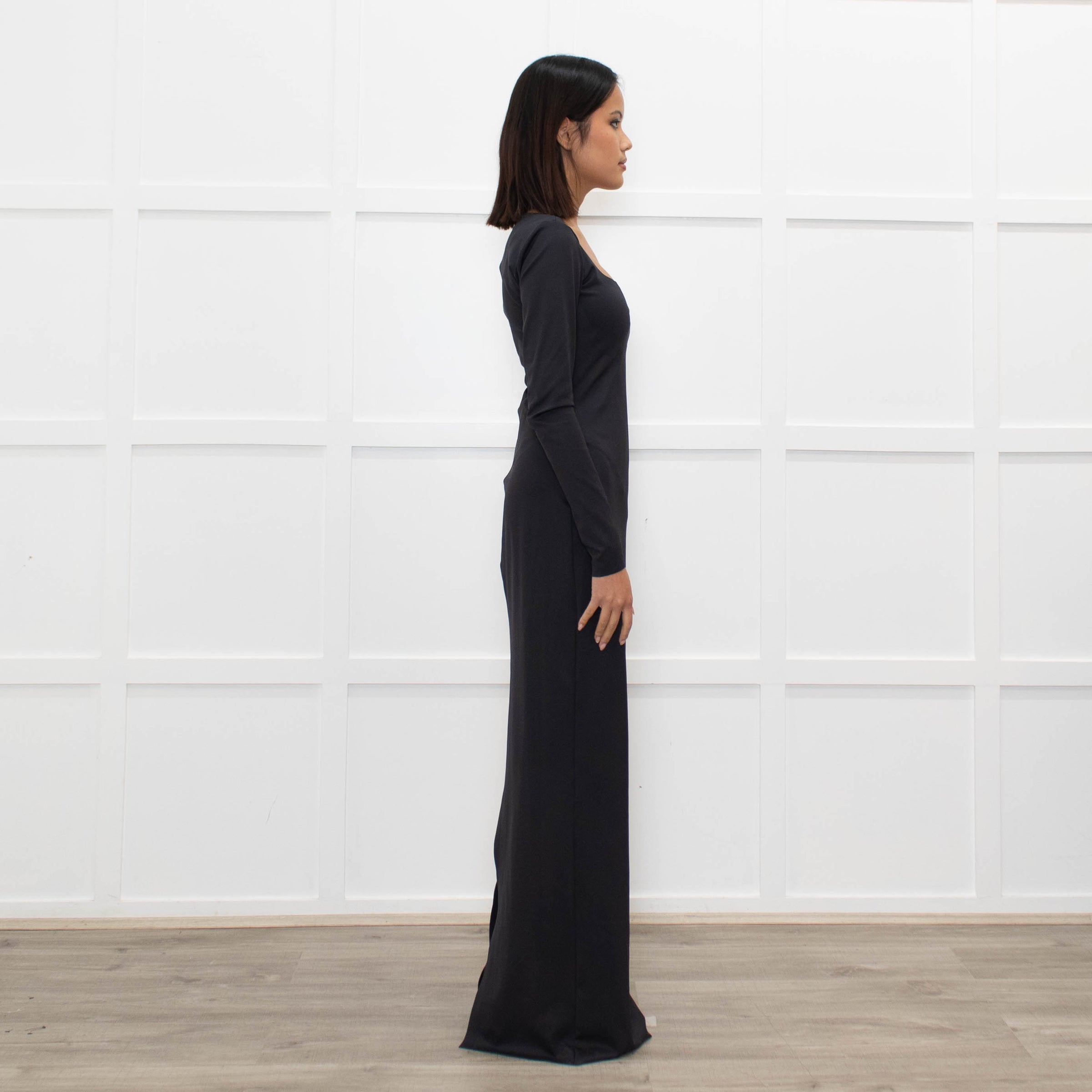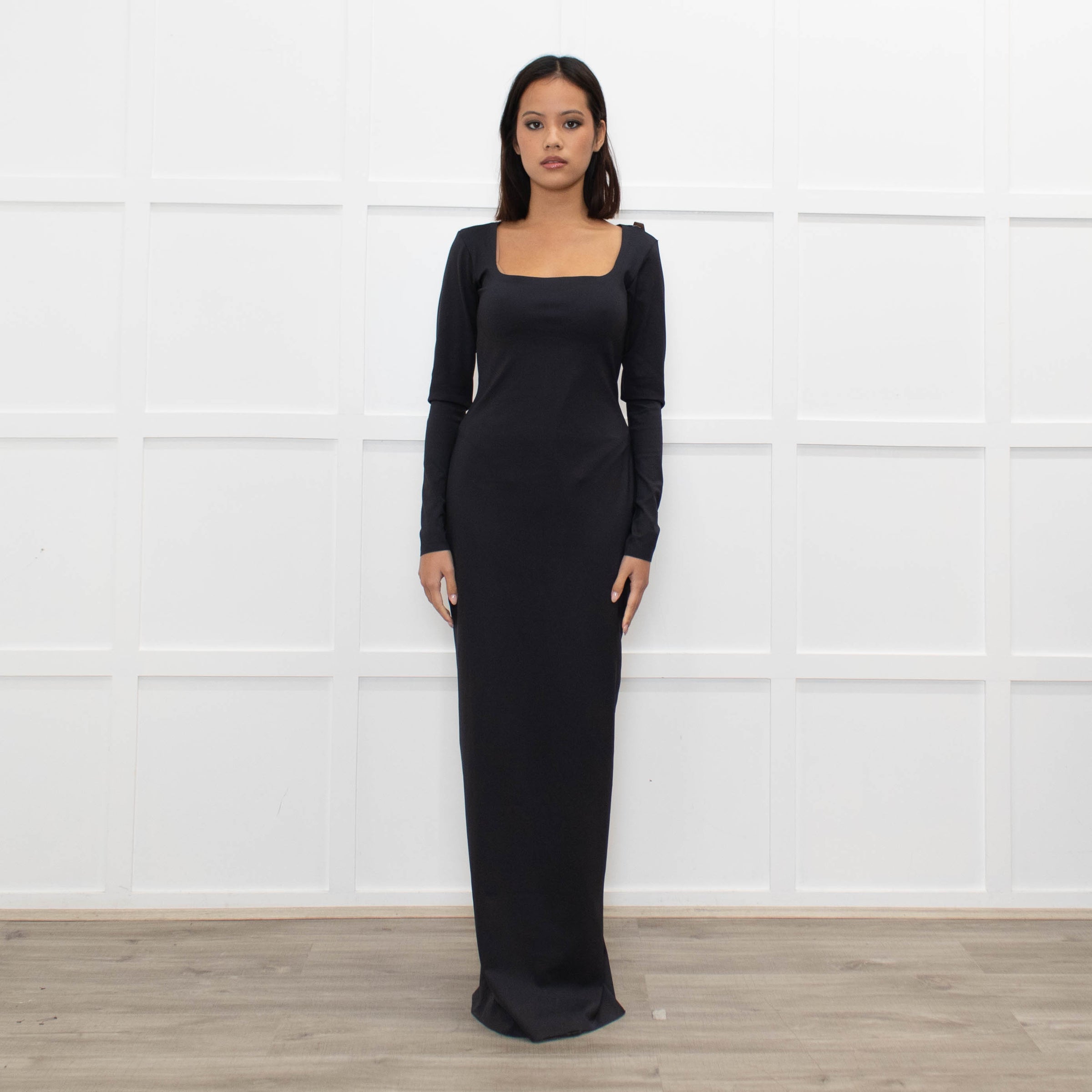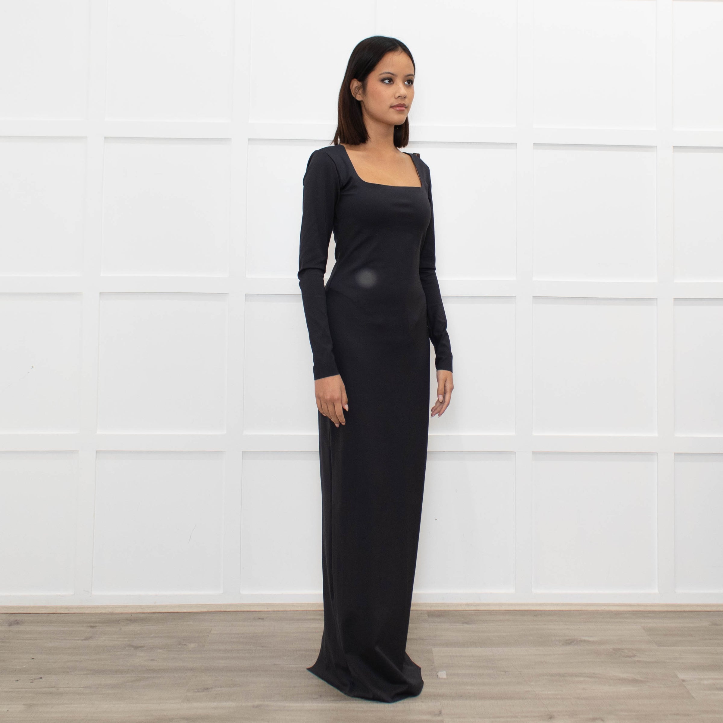 Skims black long-sleeve stretch maxi dress with a scooped neckline. Finished with raw hems. New with tags.