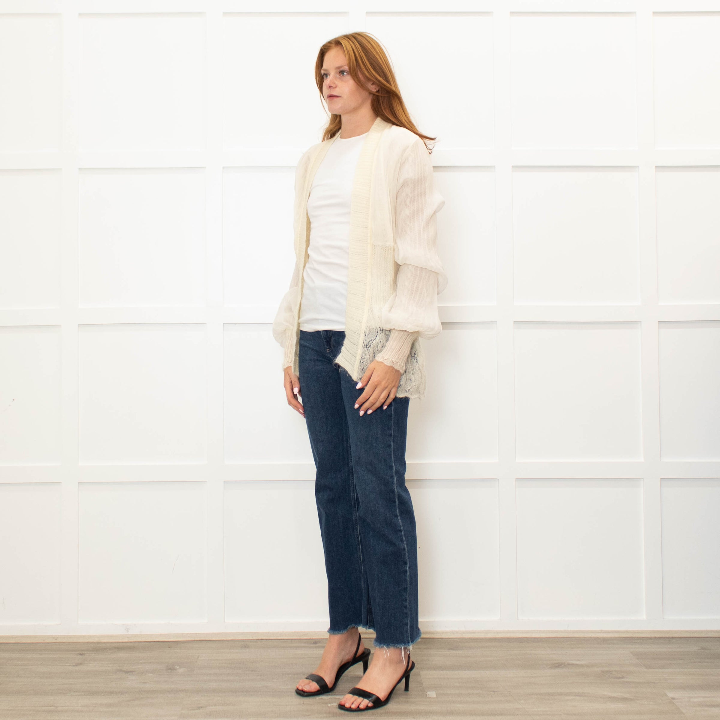 Sportmax cream mohair silk overlay cardigan with pleated balloon cuff sleeves.
