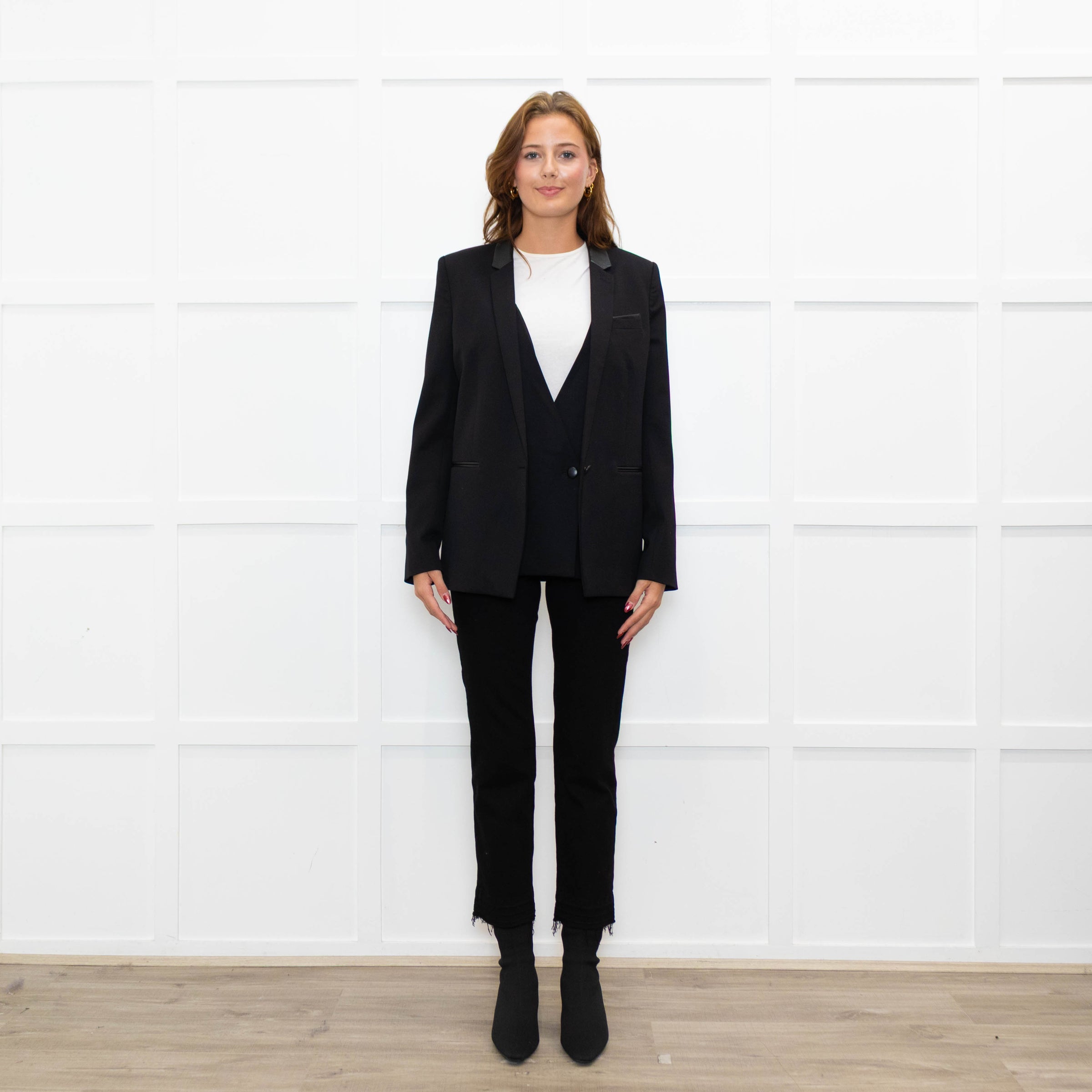The Kooples black fine wool blazer jacket with leather trim detailing, a removable waistcoat insert, padded shoulders, and three front pockets.