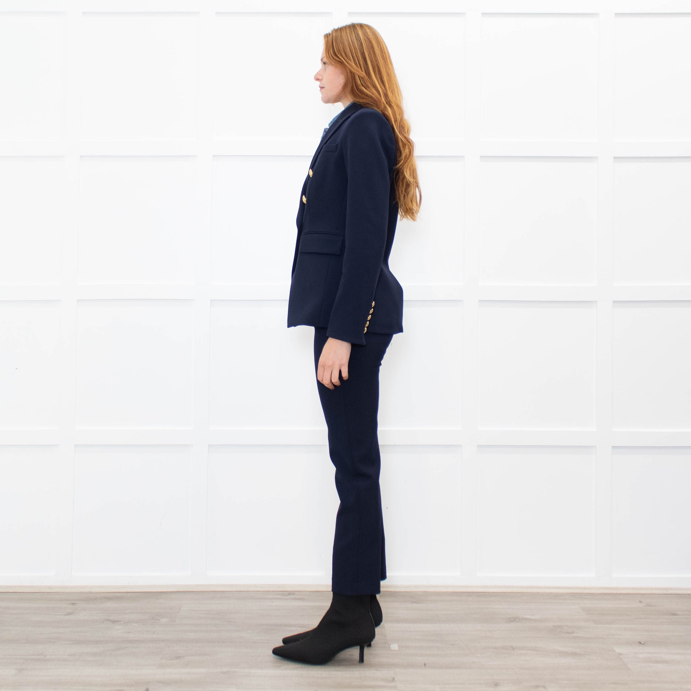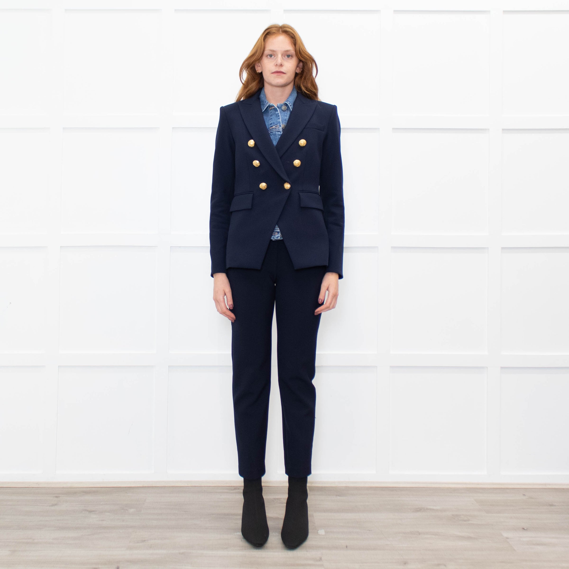 Veronica Beard navy blue Miller Dickey blazer jacket with a removable faux denim shirt insert, gold button detailing, long sleeves, buttoned cuffs, and a notch collar lapel. The matching trousers are available to purchase separately. New with tags.