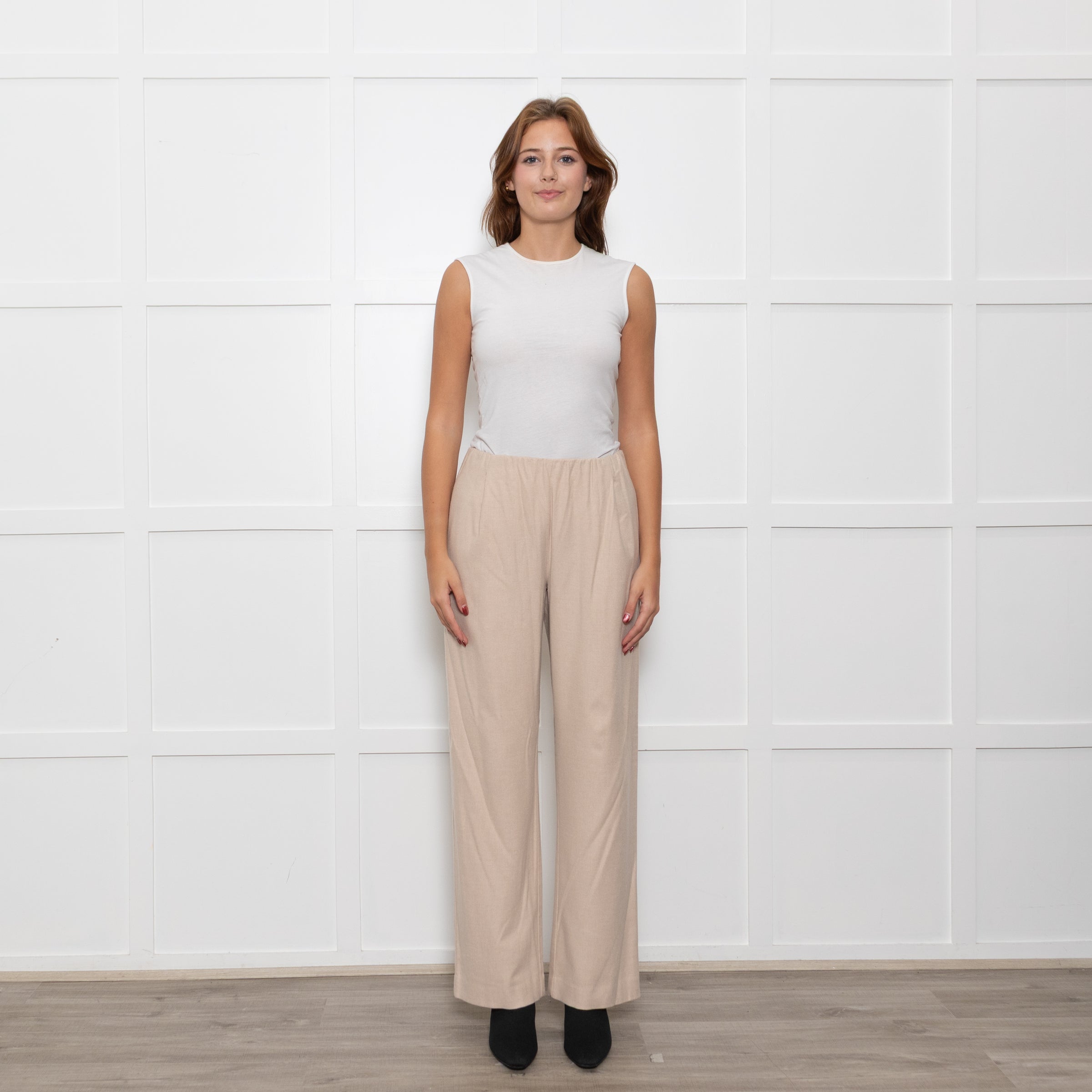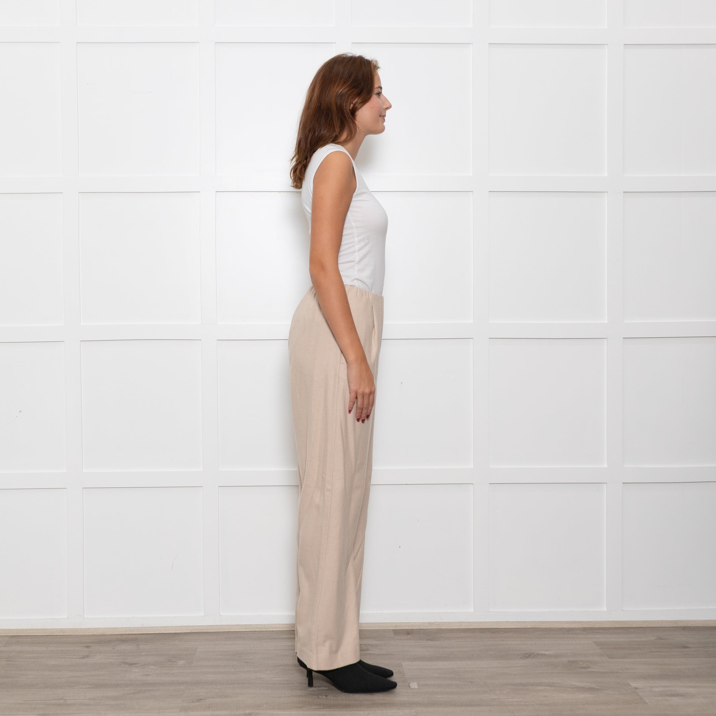 Vince cream wool trousers, featuring a stunning wide-leg design, two side pockets and an elasticated waist band for a comfortable, stylish fit.