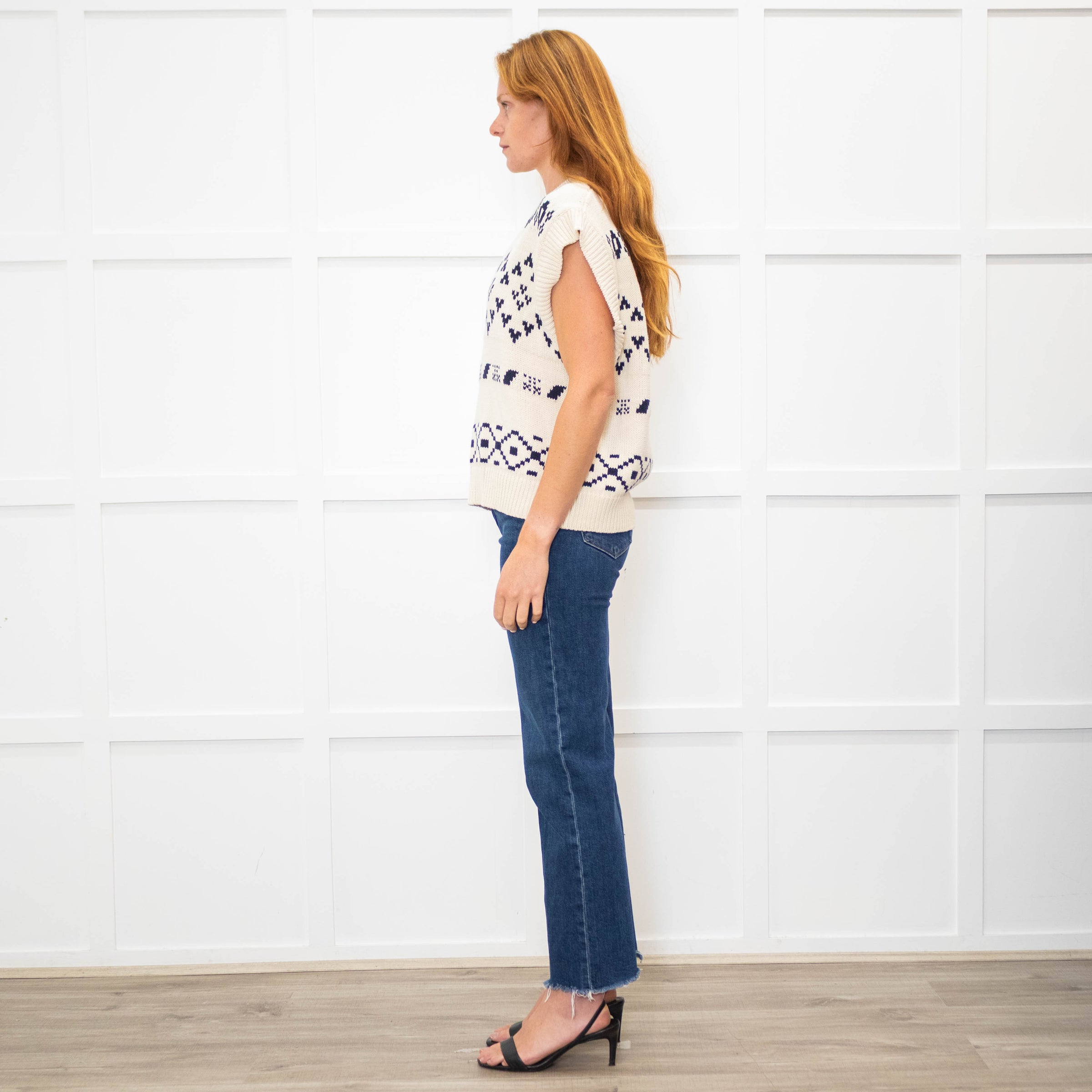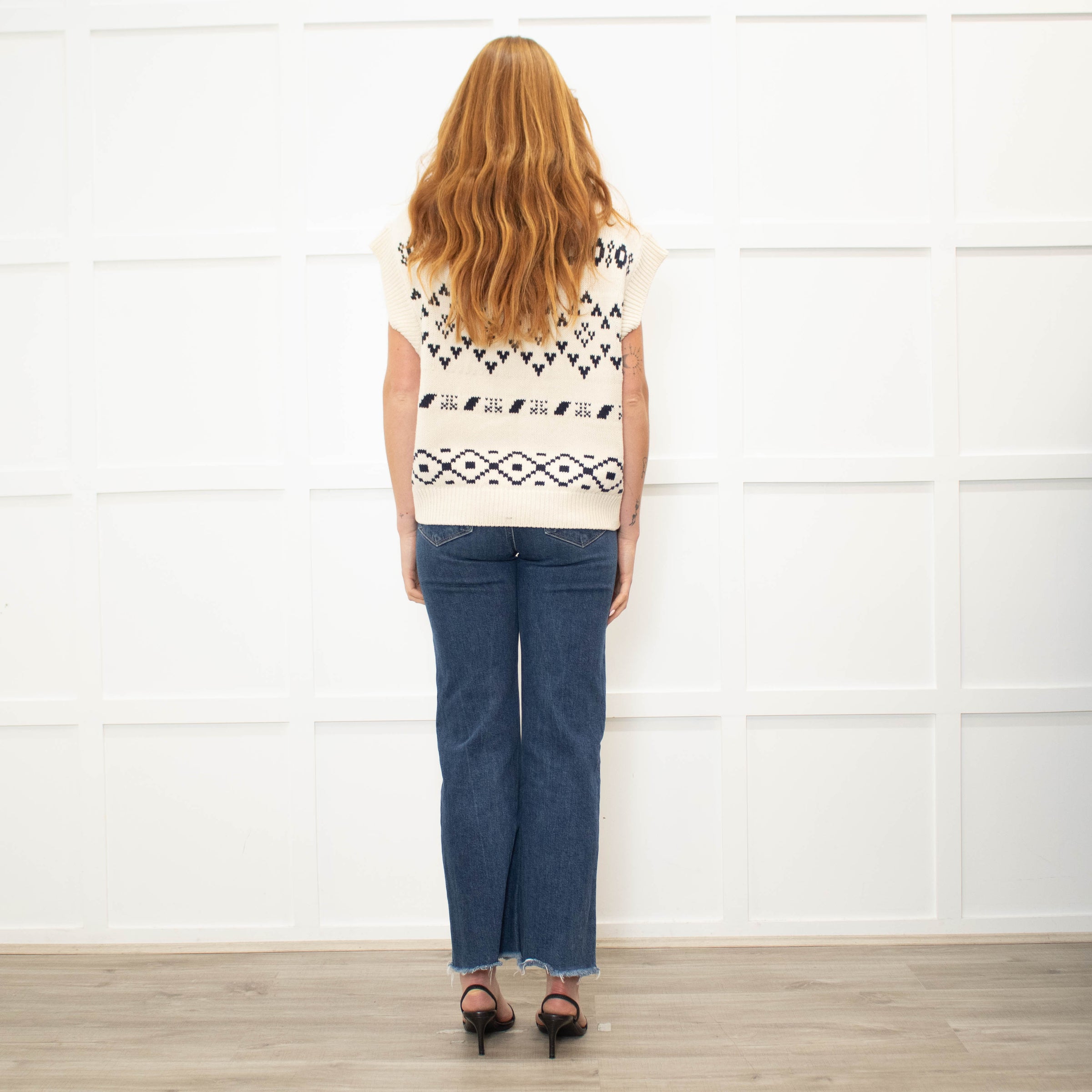 Weekend Max Mara cream and black geometric motif intarsia knit tank top with a V-shaped neckline and ribbed trim detailing.