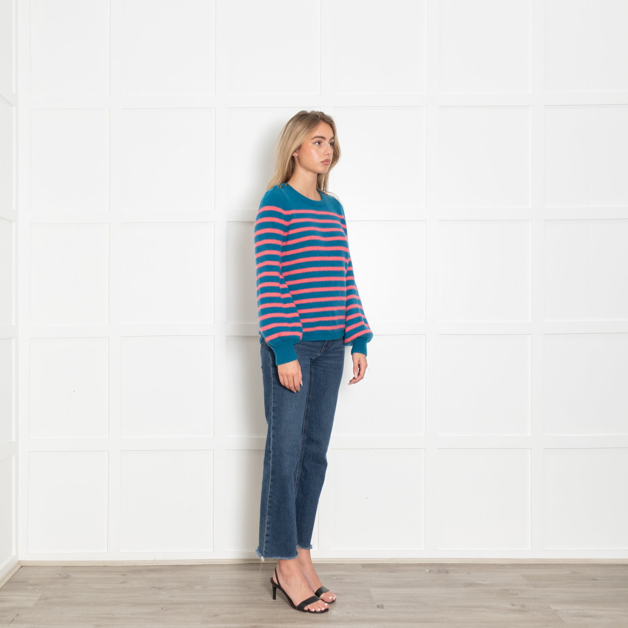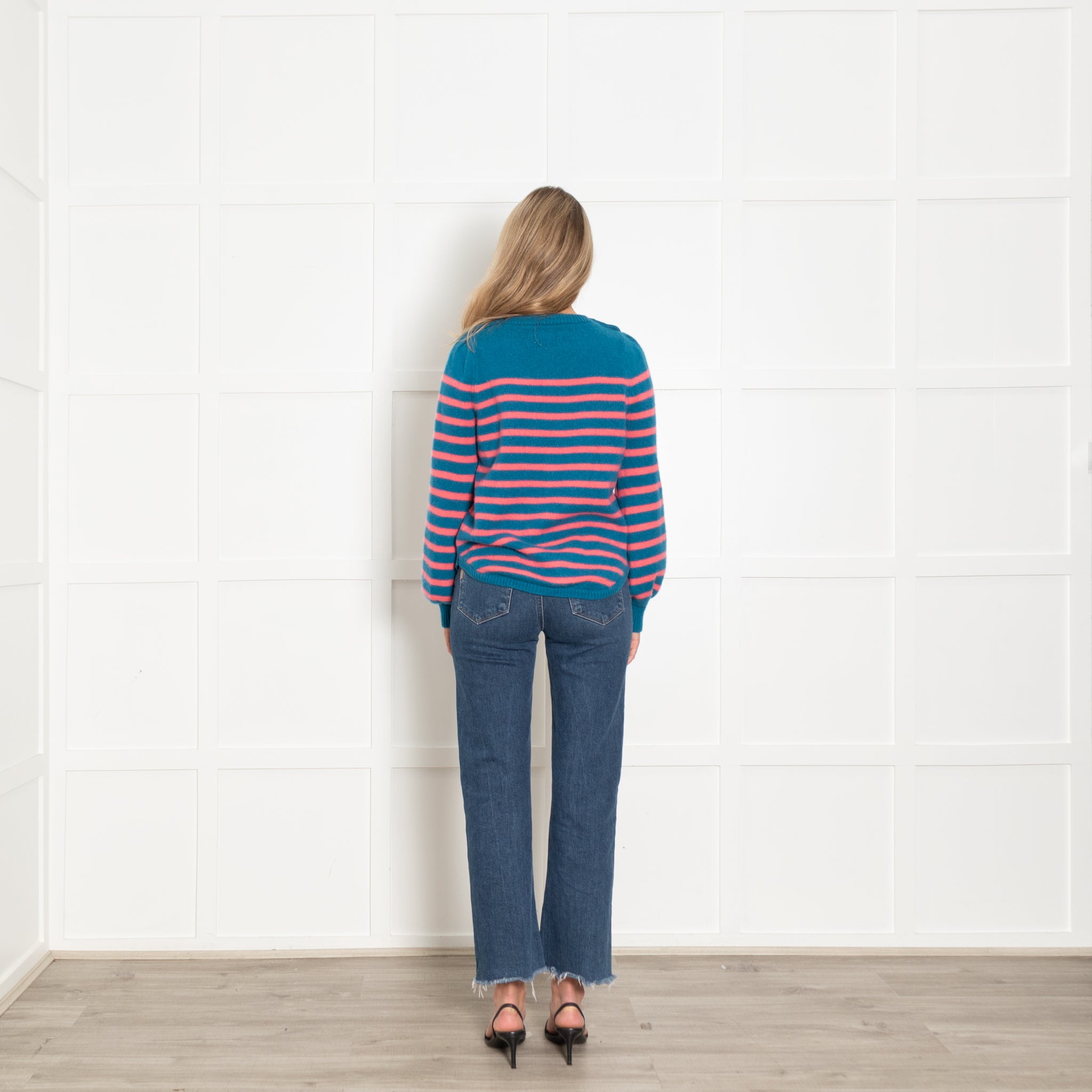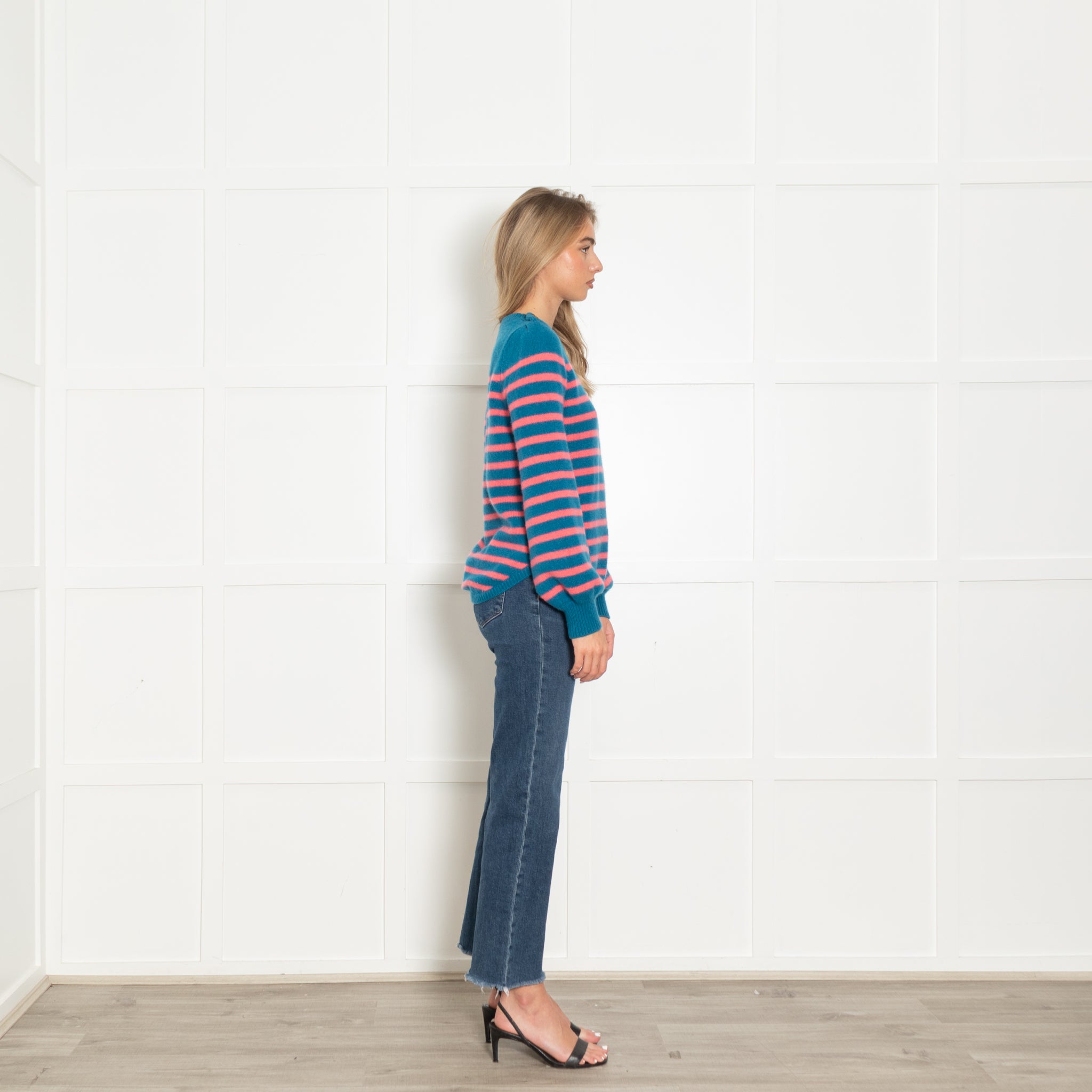 Wyse women’s round-necked knit jumper in blue and pink stripe. Made from 100% cashmere, this pullover jumper features a round neckline and long sleeves.
