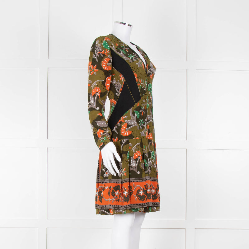 Burberry Khaki Orange Floral V-Neck Long Sleeve Dress