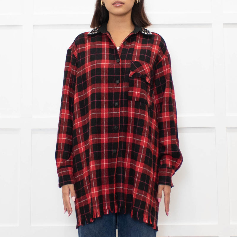 Pinko Red Black Tartan Beaded Collar Shirt