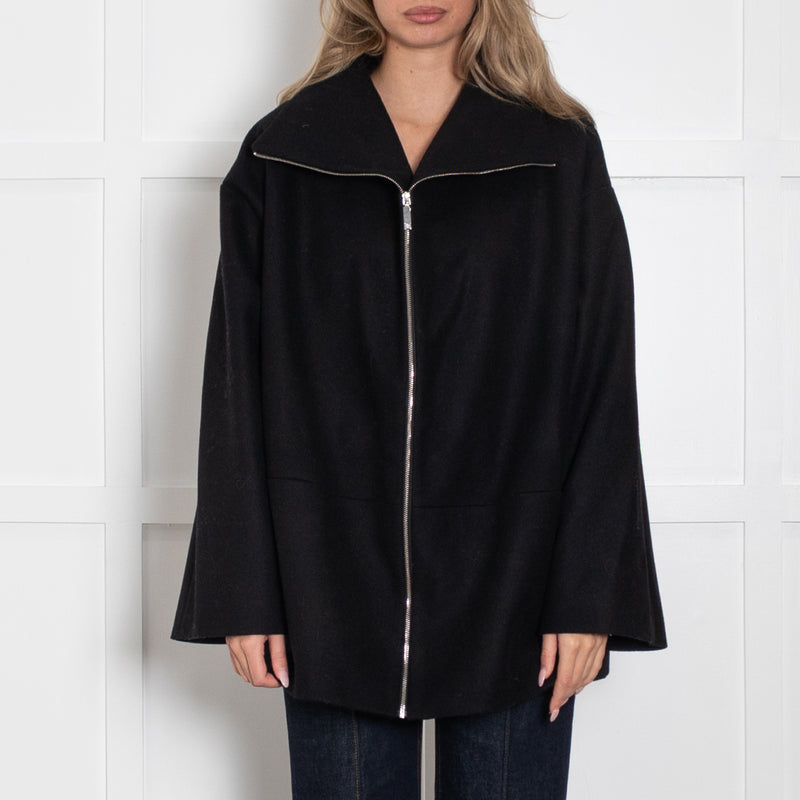 Toteme Black Zip Up Oversized Wool Funnel Neck Jacket