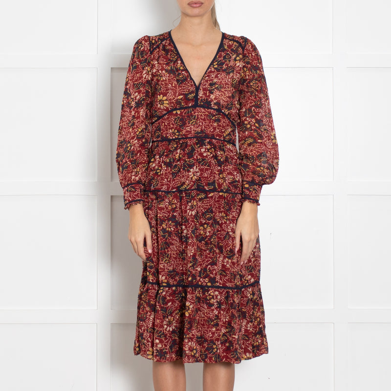 BA&SH Burgundy Navy Silver Tread Midi Long Sleeve Dress