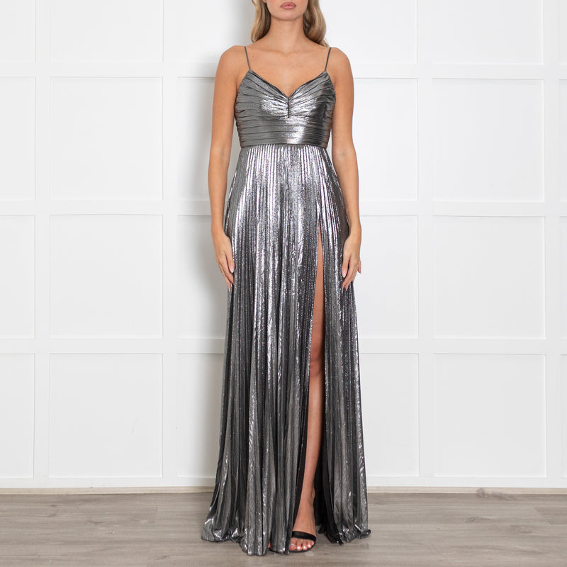 Retrofete Silver Lame Maxi Dress with Micro Pleat Skirt