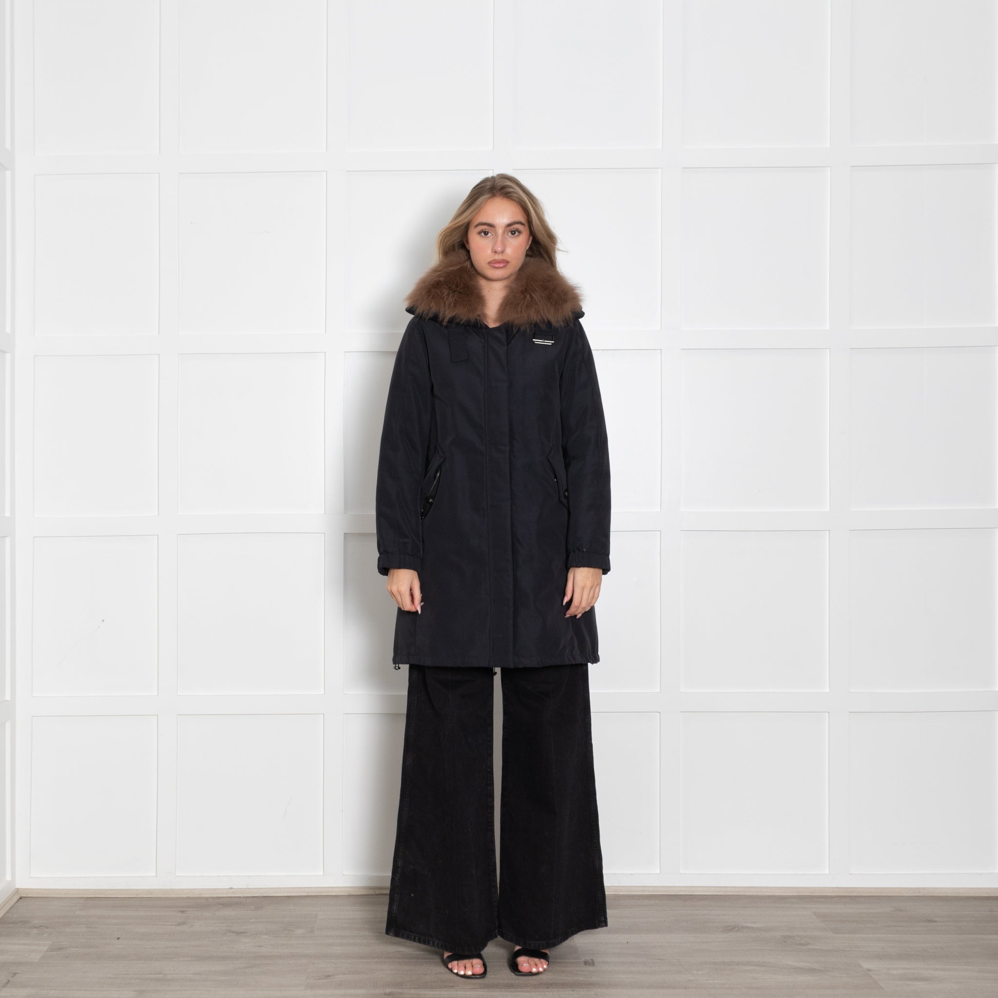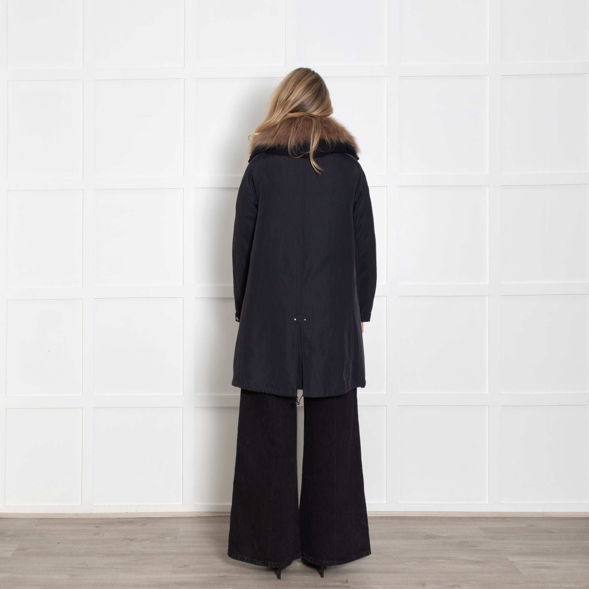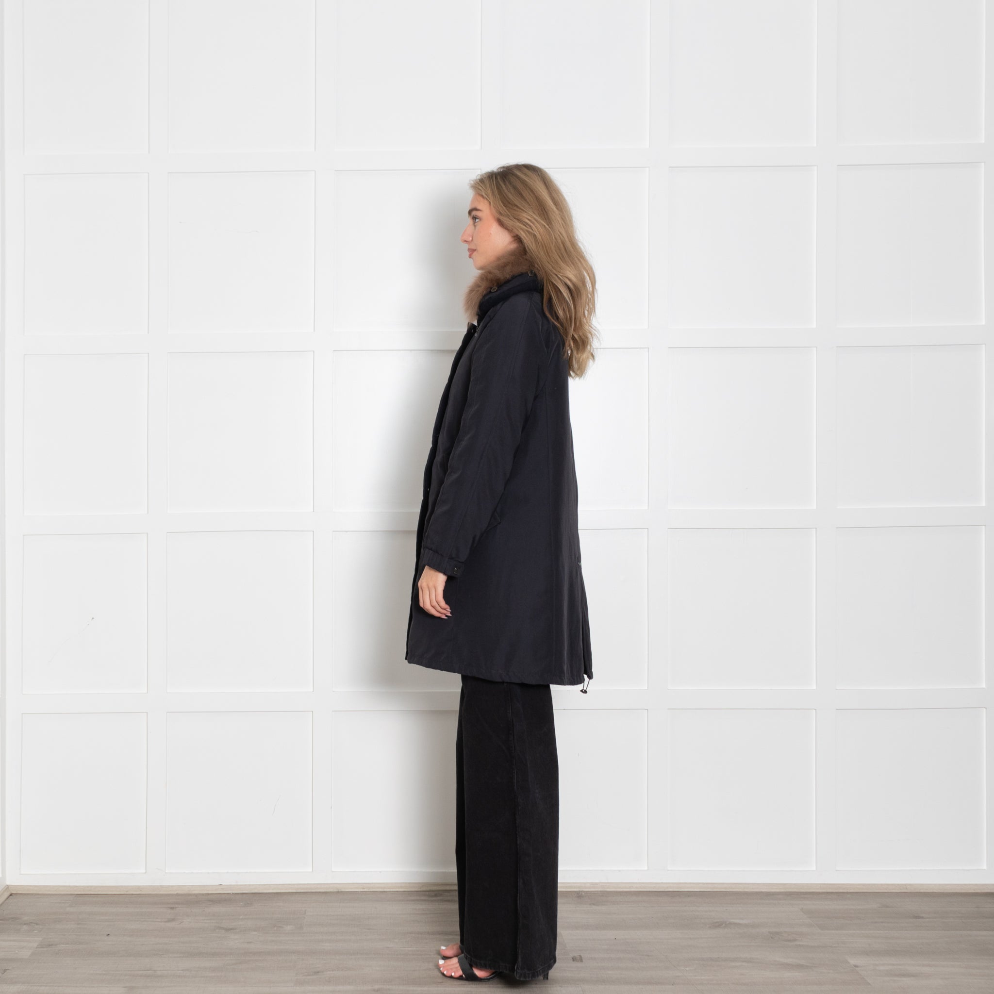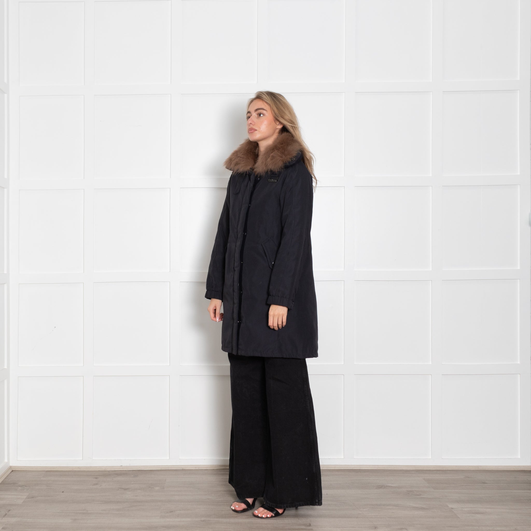 Weekend Max Mara long-sleeve coat, featuring a navy blue puffer exterior, with a stunning brown faux fur hood design, a zip and button-up front closure, as well as two front zip and button closure pockets.