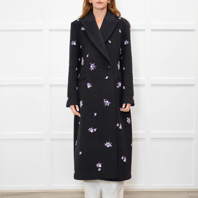 Simkhai Black Wool Blend Crystal Flower Black Sequin Detail Long Coat