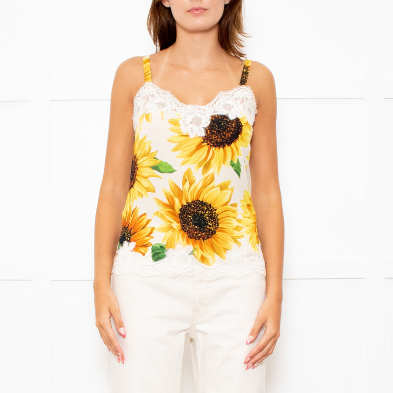 Dolce & Gabbana White Silk Mix Lace Trim Cami With Yellow Sunflower Print