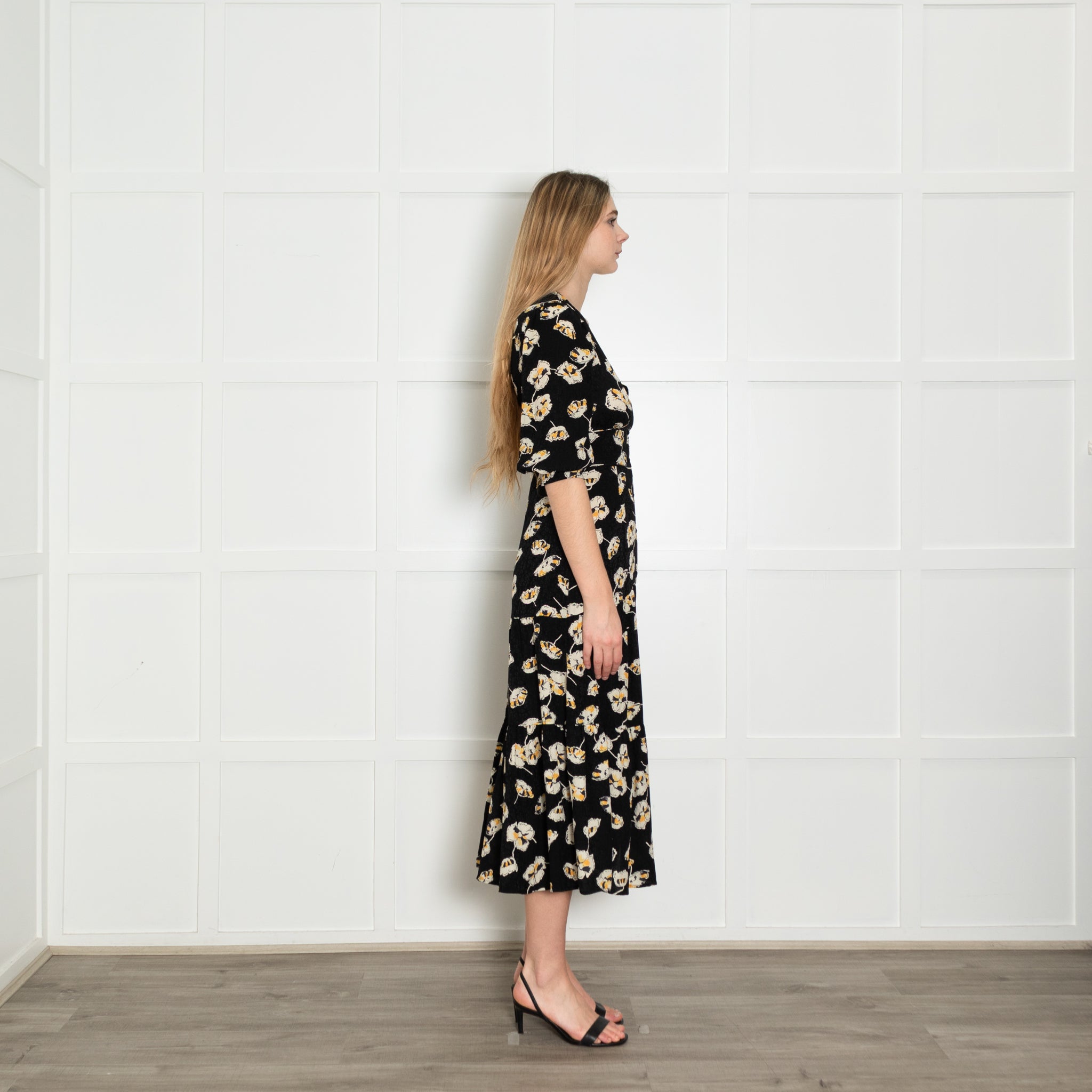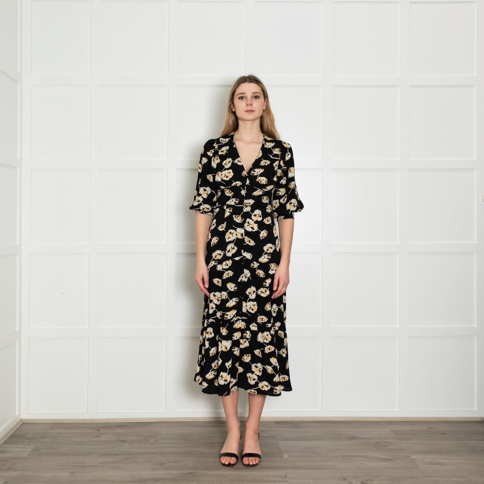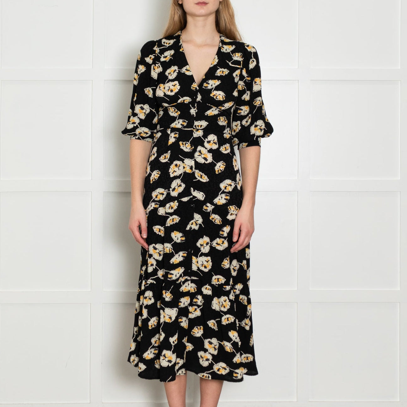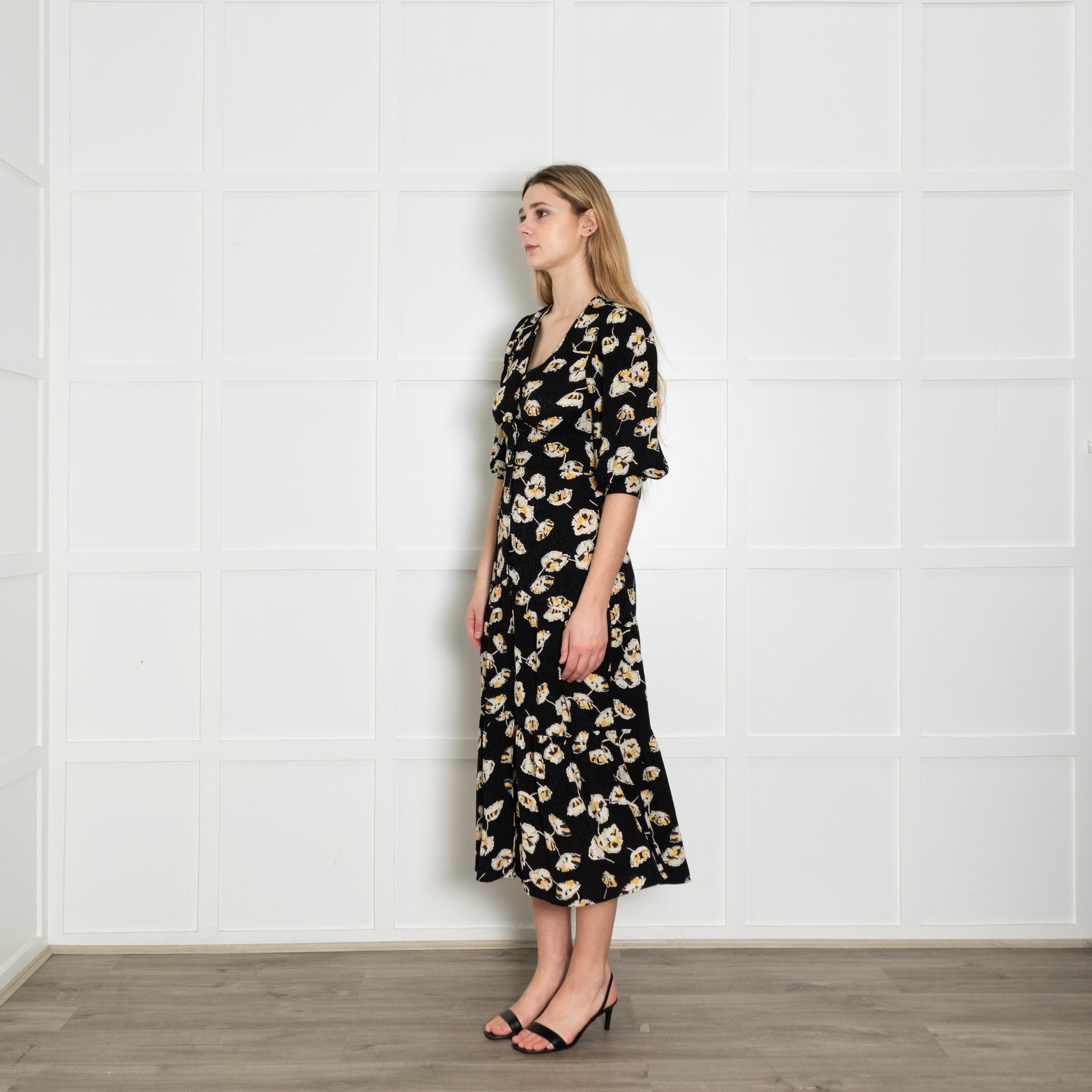 Ba&sh black, cream, and yellow floral button-up front maxi dress with 3/4 length sleeves and a V-shaped neckline.