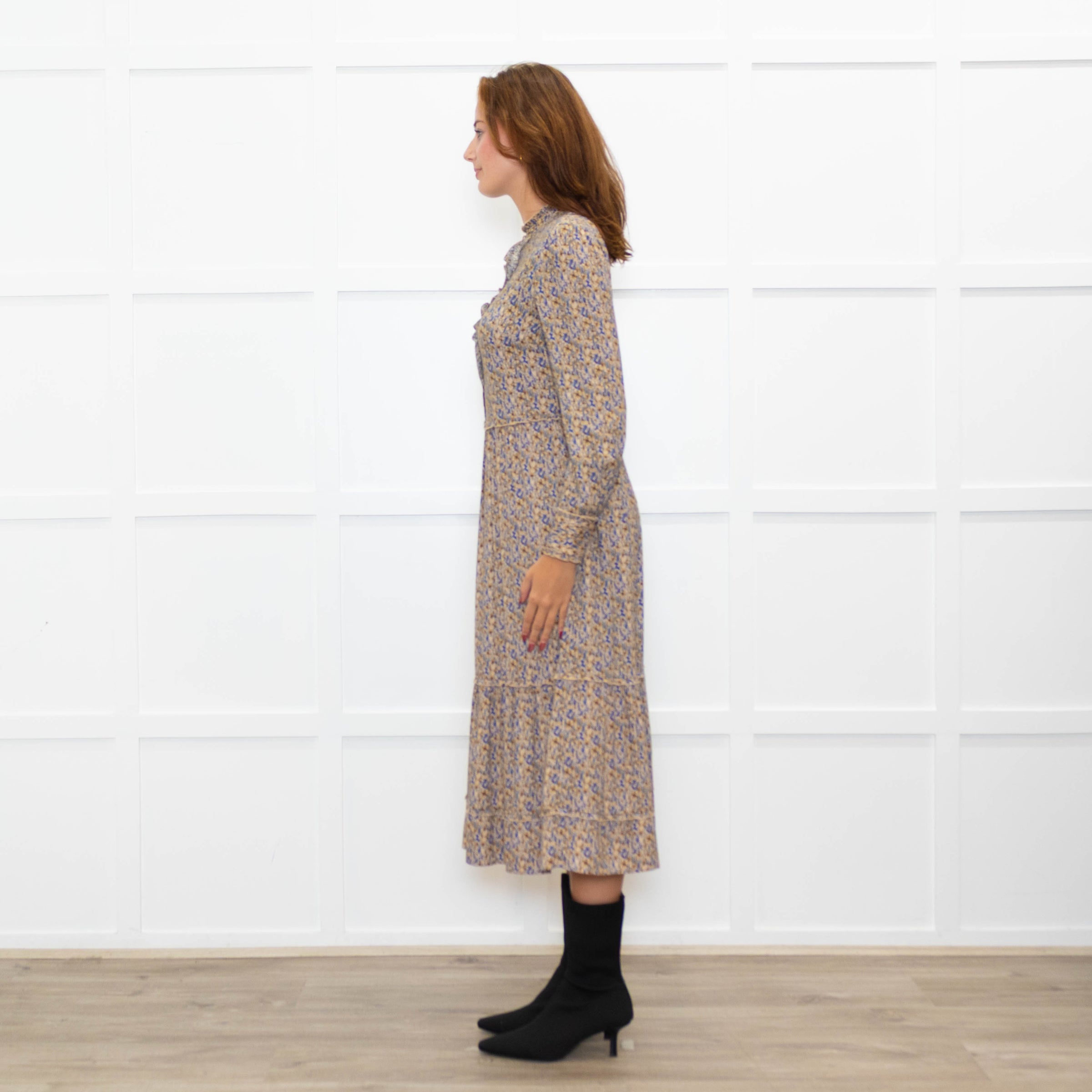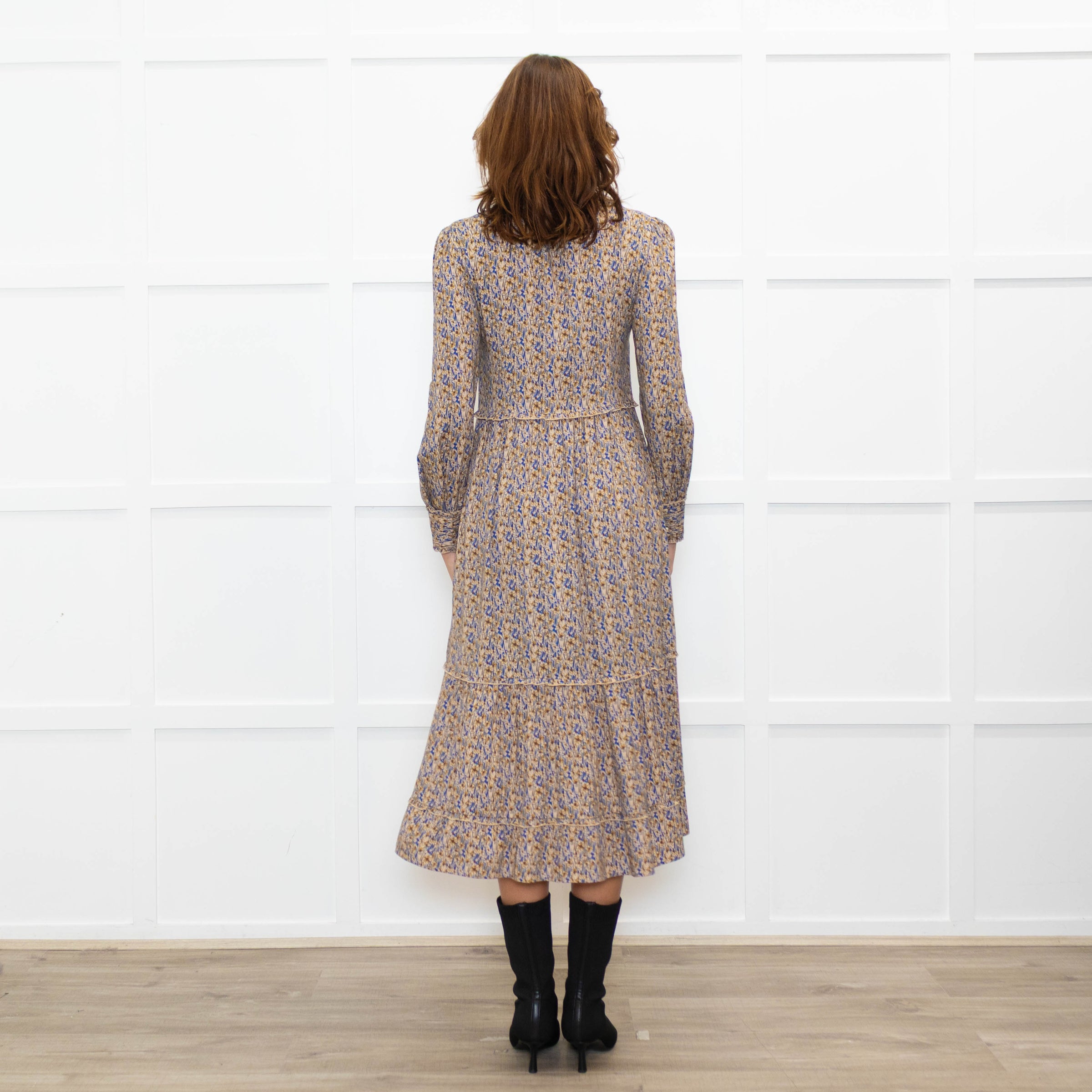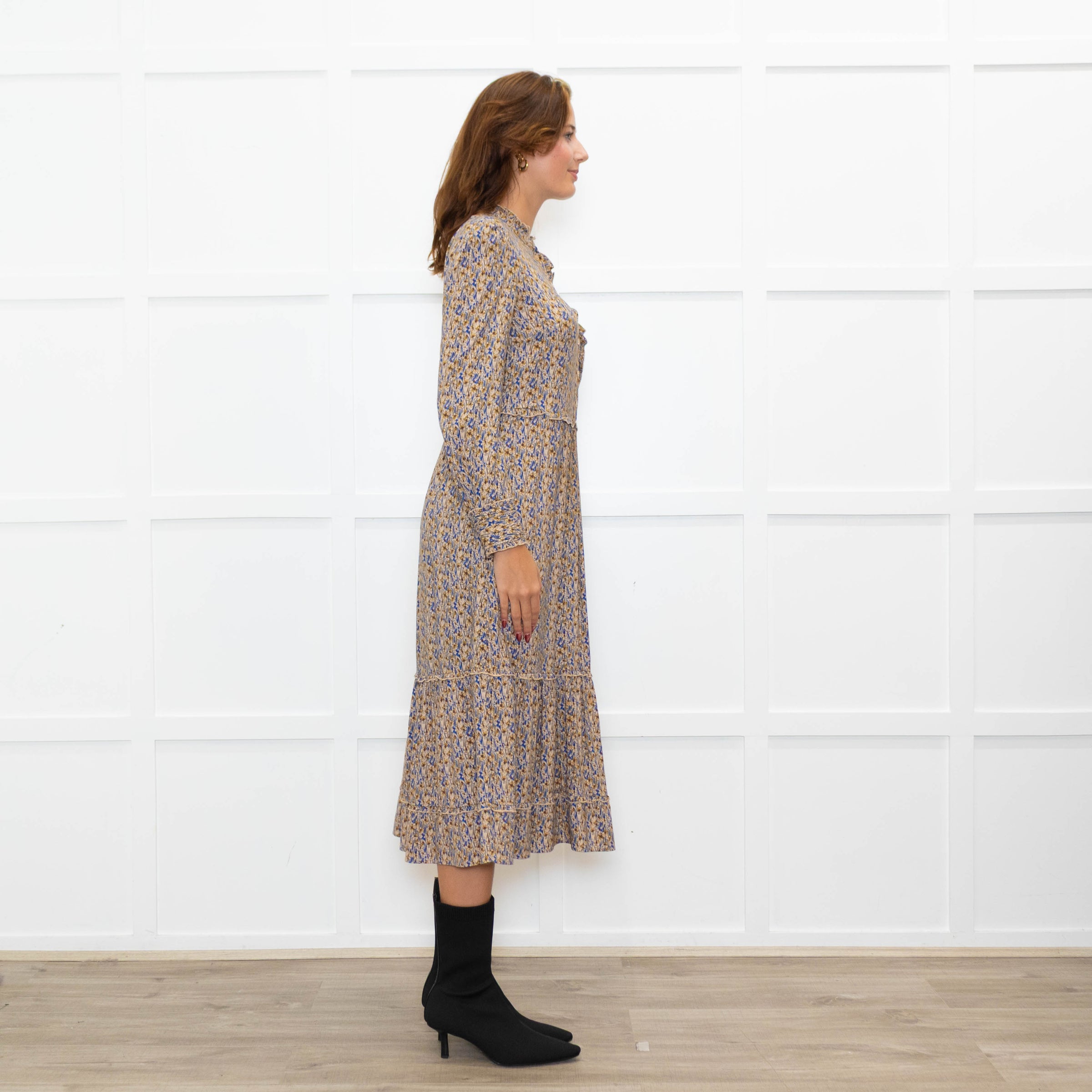Dea Kudibal blue floral frill midi dress with delicate frill detailing along the sides featuring a partially button up top.
