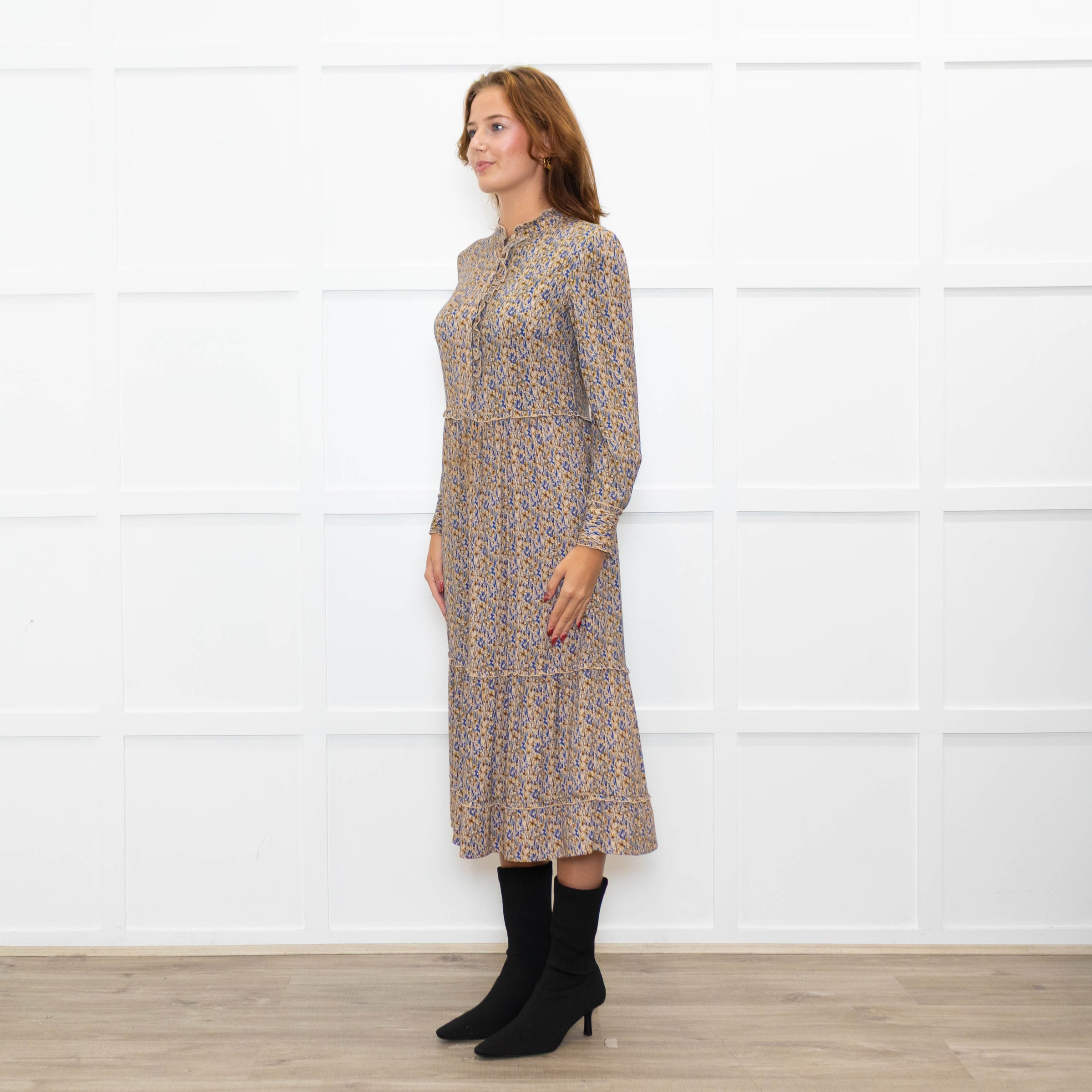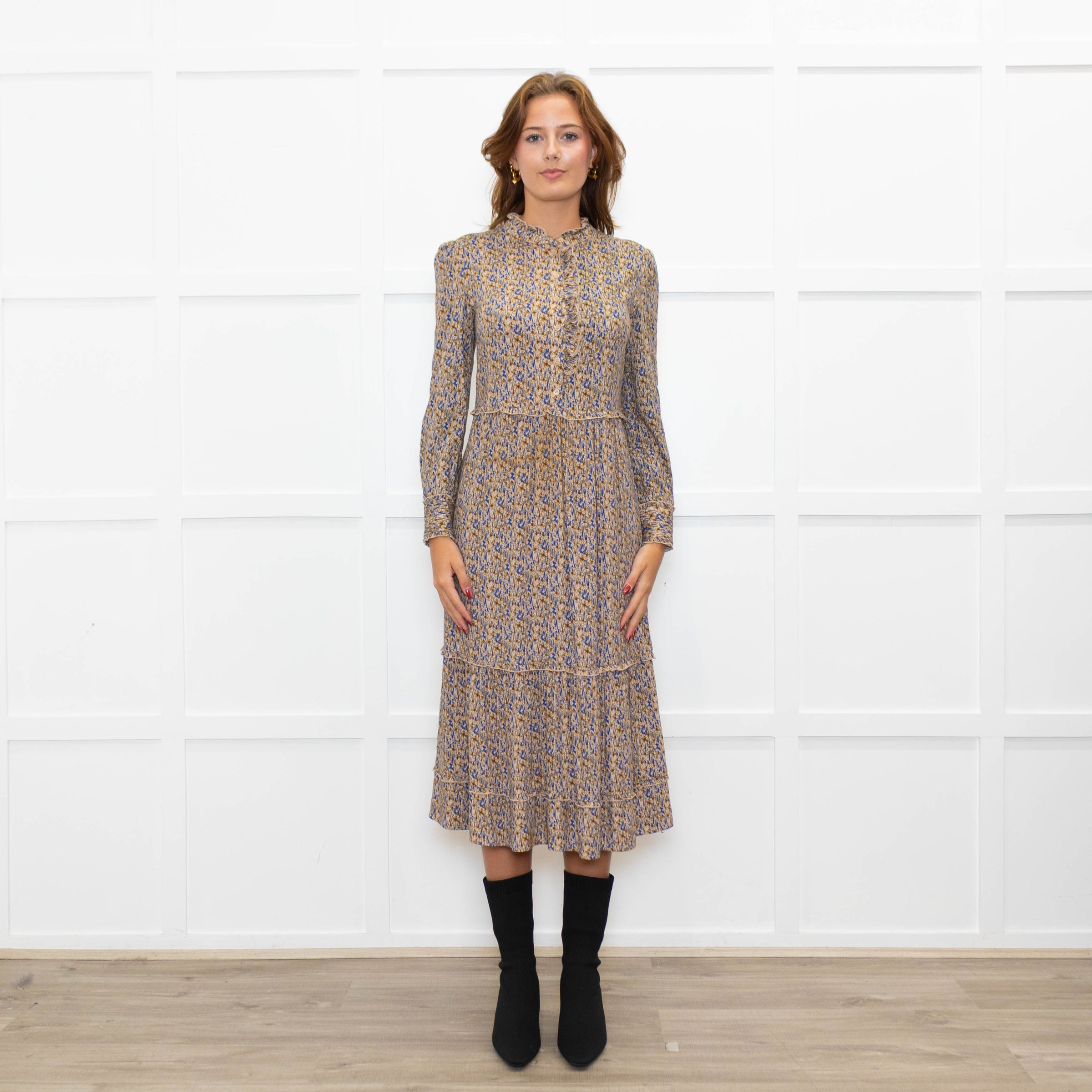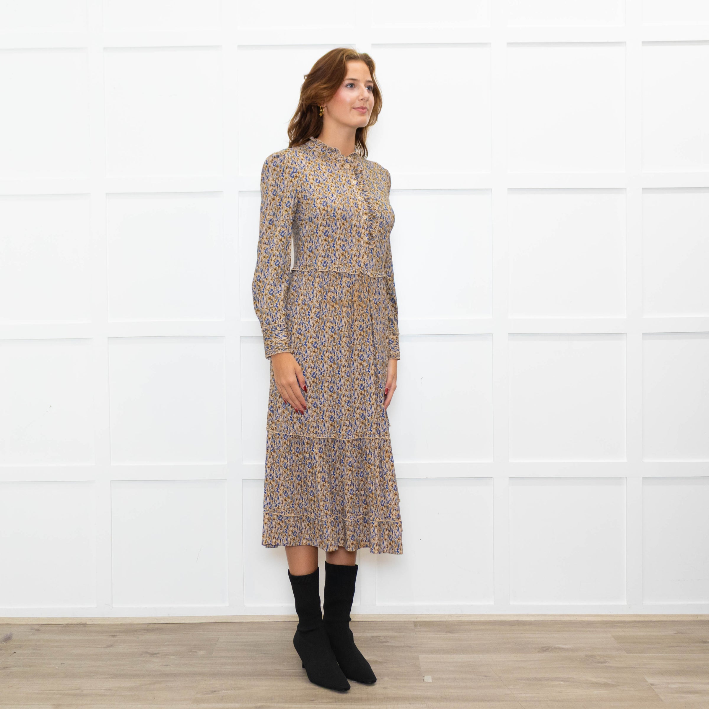 Dea Kudibal blue floral frill midi dress with delicate frill detailing along the sides featuring a partially button up top.