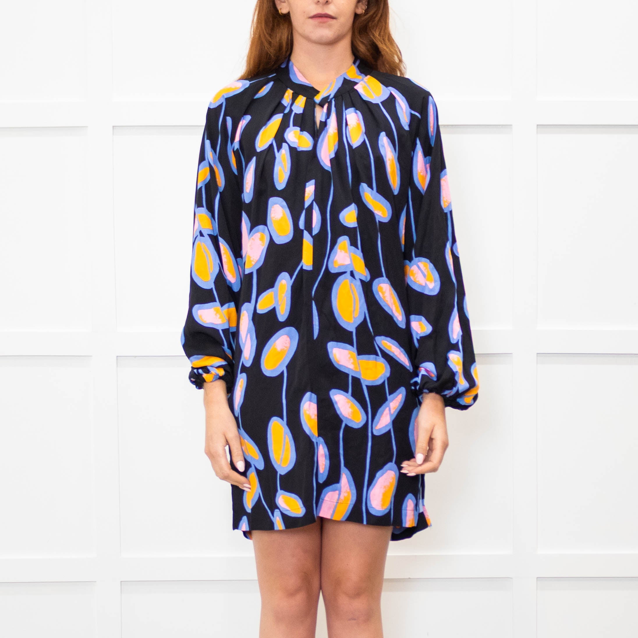 Diane Von Furstenberg black, orange and blue abstract print tunic dress with a rounded neckline, long sleeves gathered into elasticated cuffs, side slip pockets, and pleating into the neck.