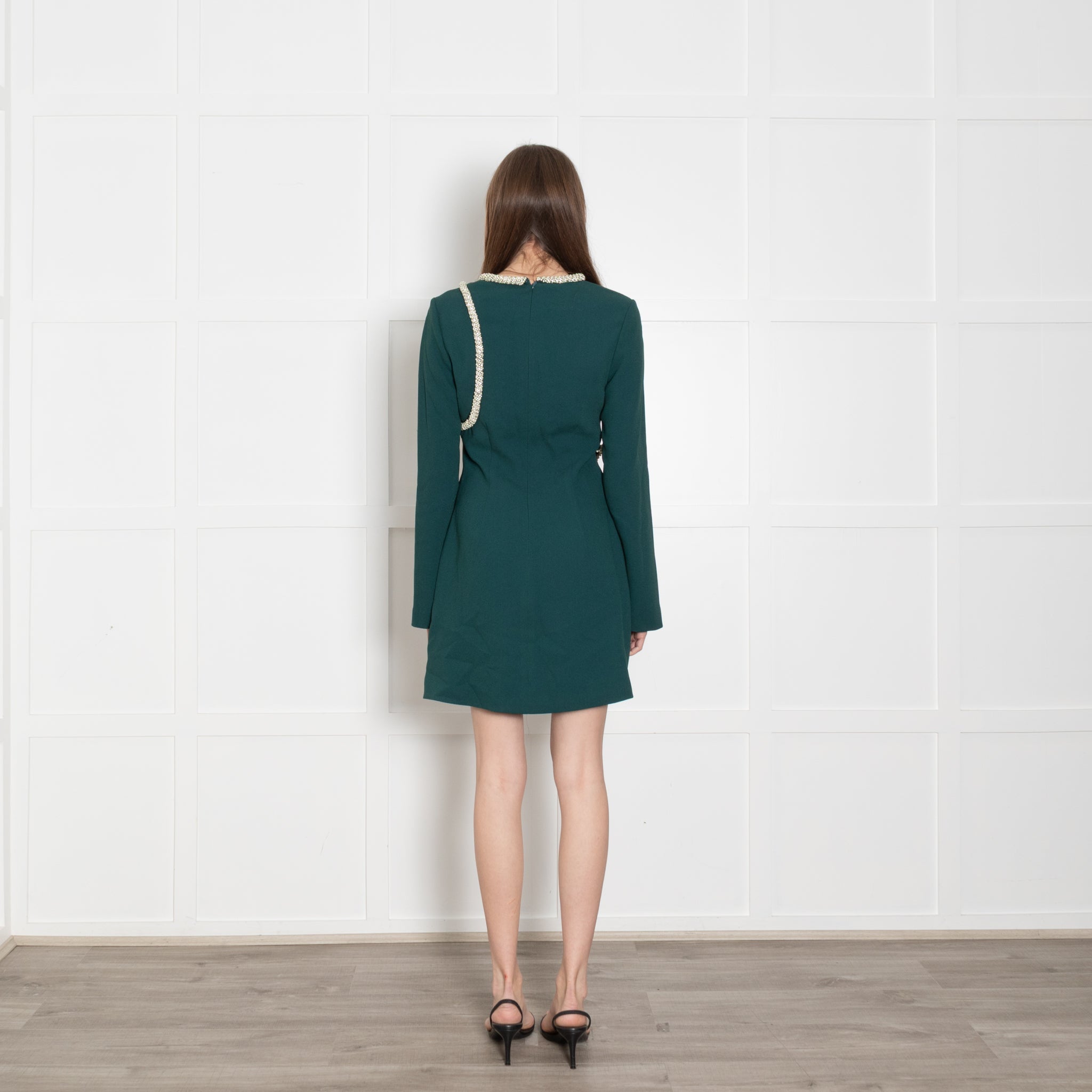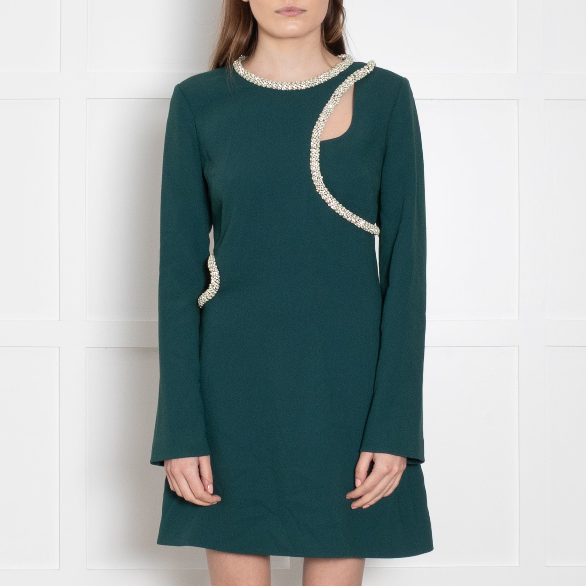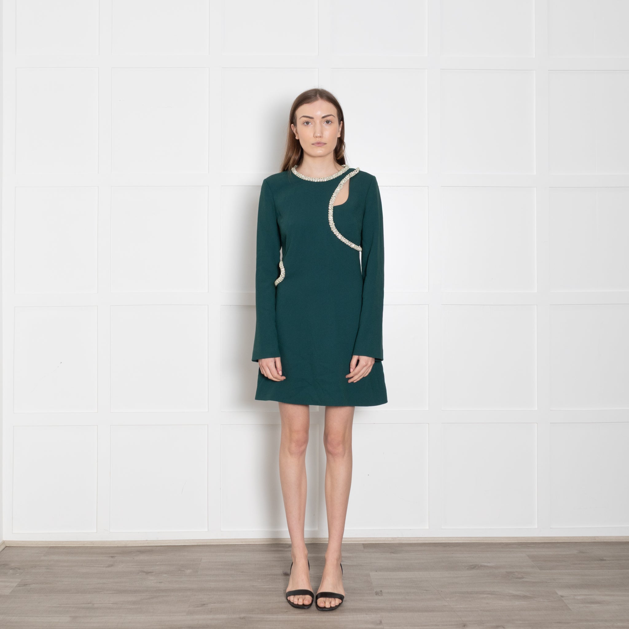 Jonathan Simkhai long-sleeve green mini dress, crafted with gorgeous white and shiny silver beads at the hemlines, creating an elegant look, featuring a rounded beaded neckline, and a zip-up back closure.