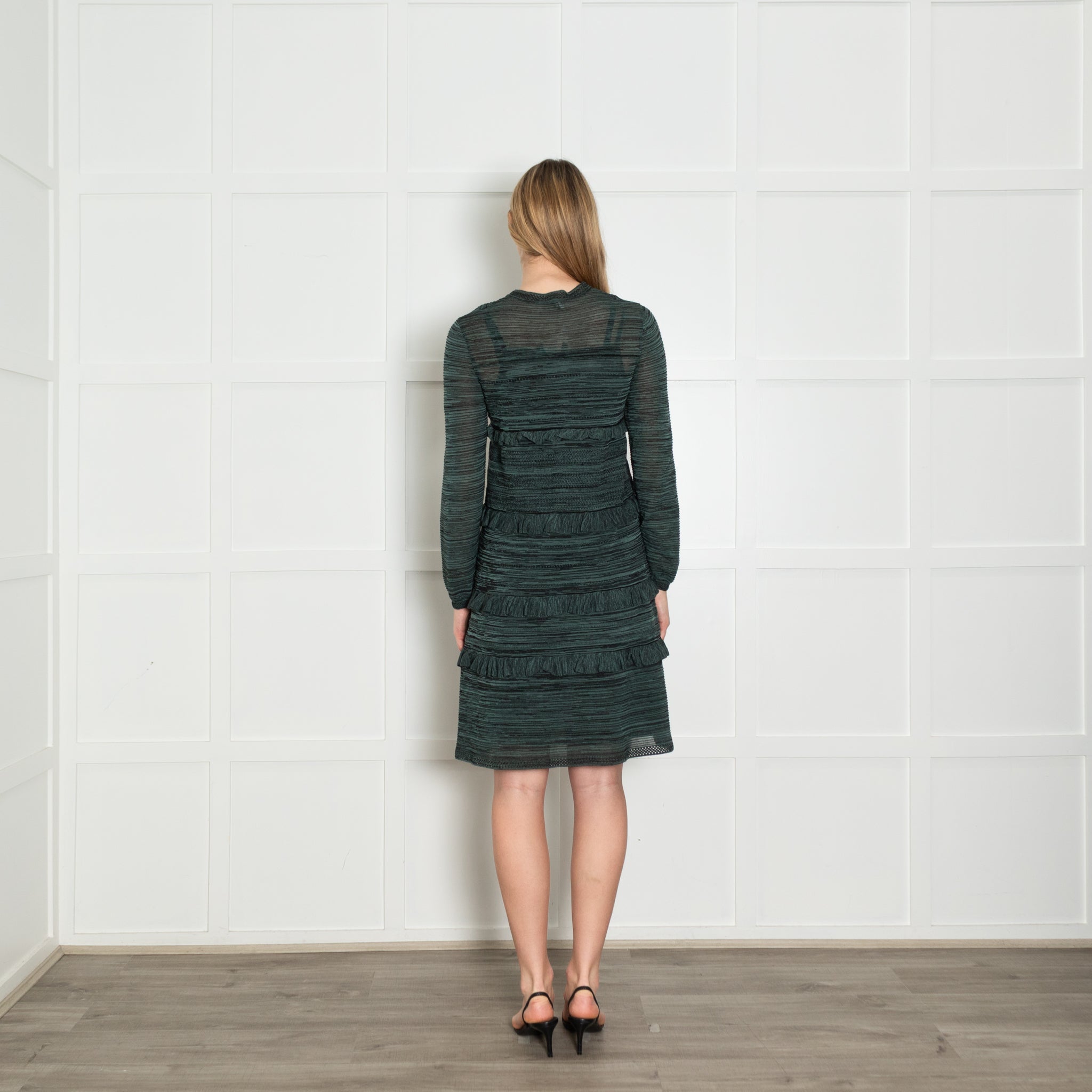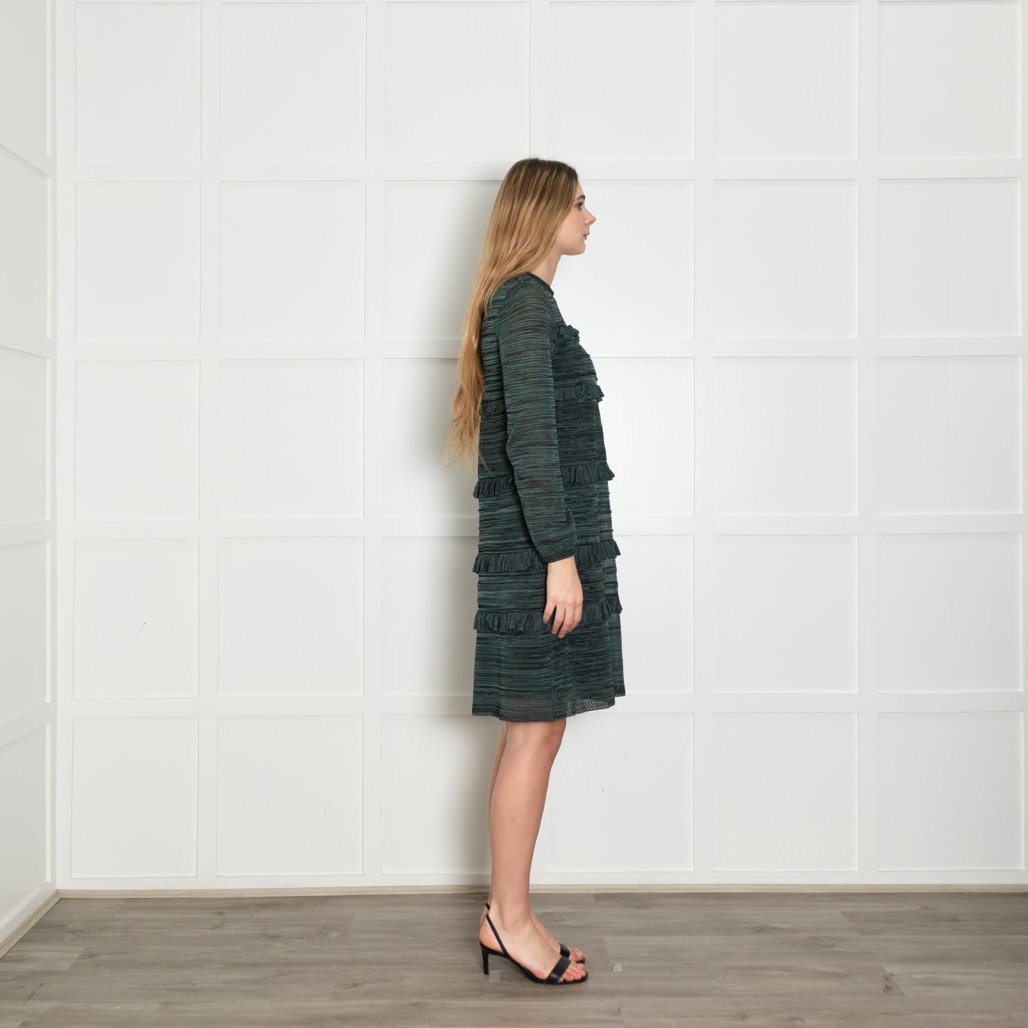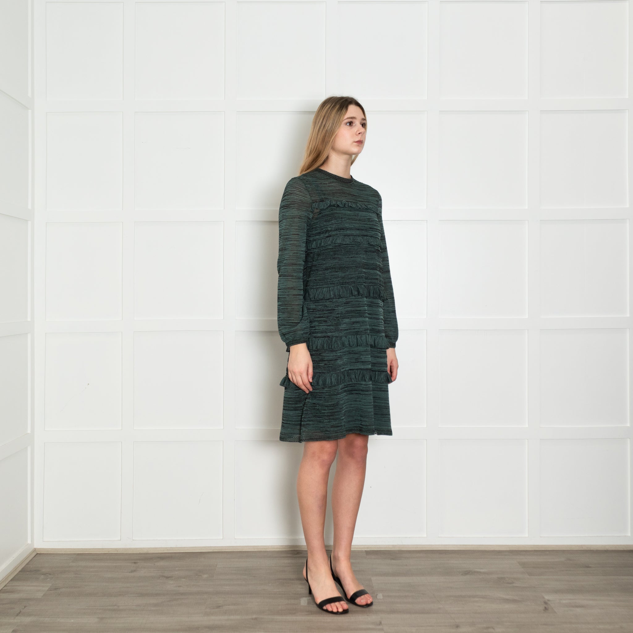 M Missoni teal and black knit frilled trim long sleeve dress with a slip and a round neckline.