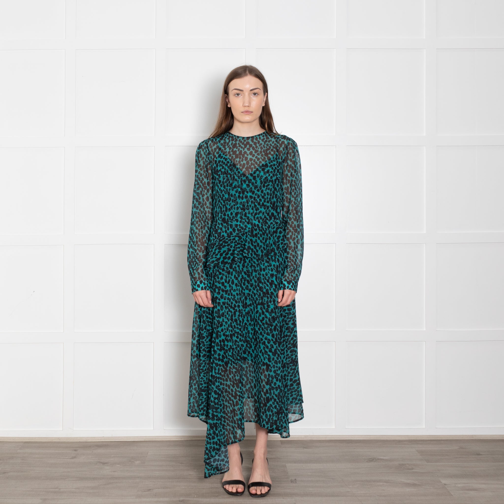 Markus Lupfer teal and black animal print long sleeve dress with slip. Sheer ruffled dress with matching slip to go underneath.