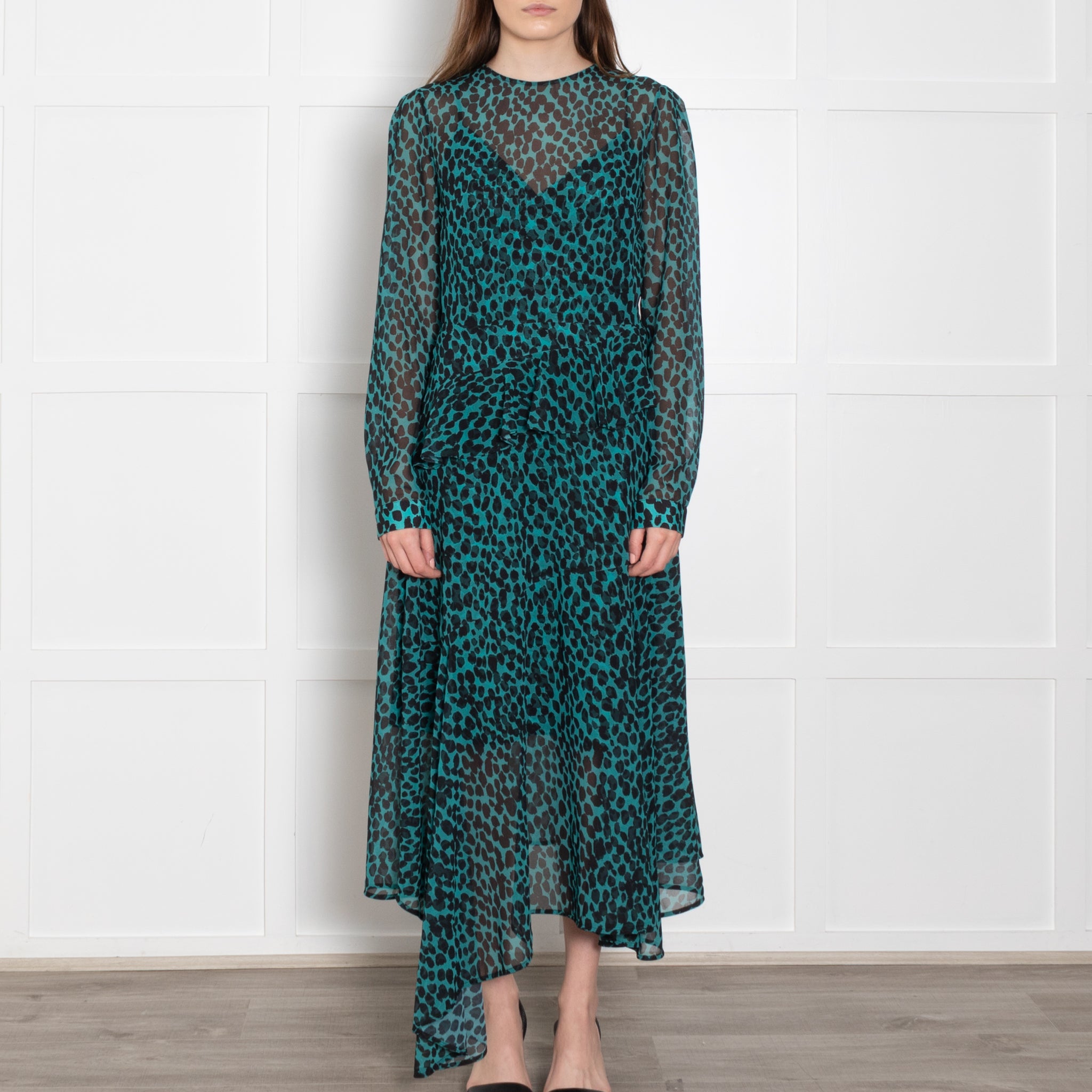 Markus Lupfer Teal Black Animal Print Long Sleeve Dress With Slip