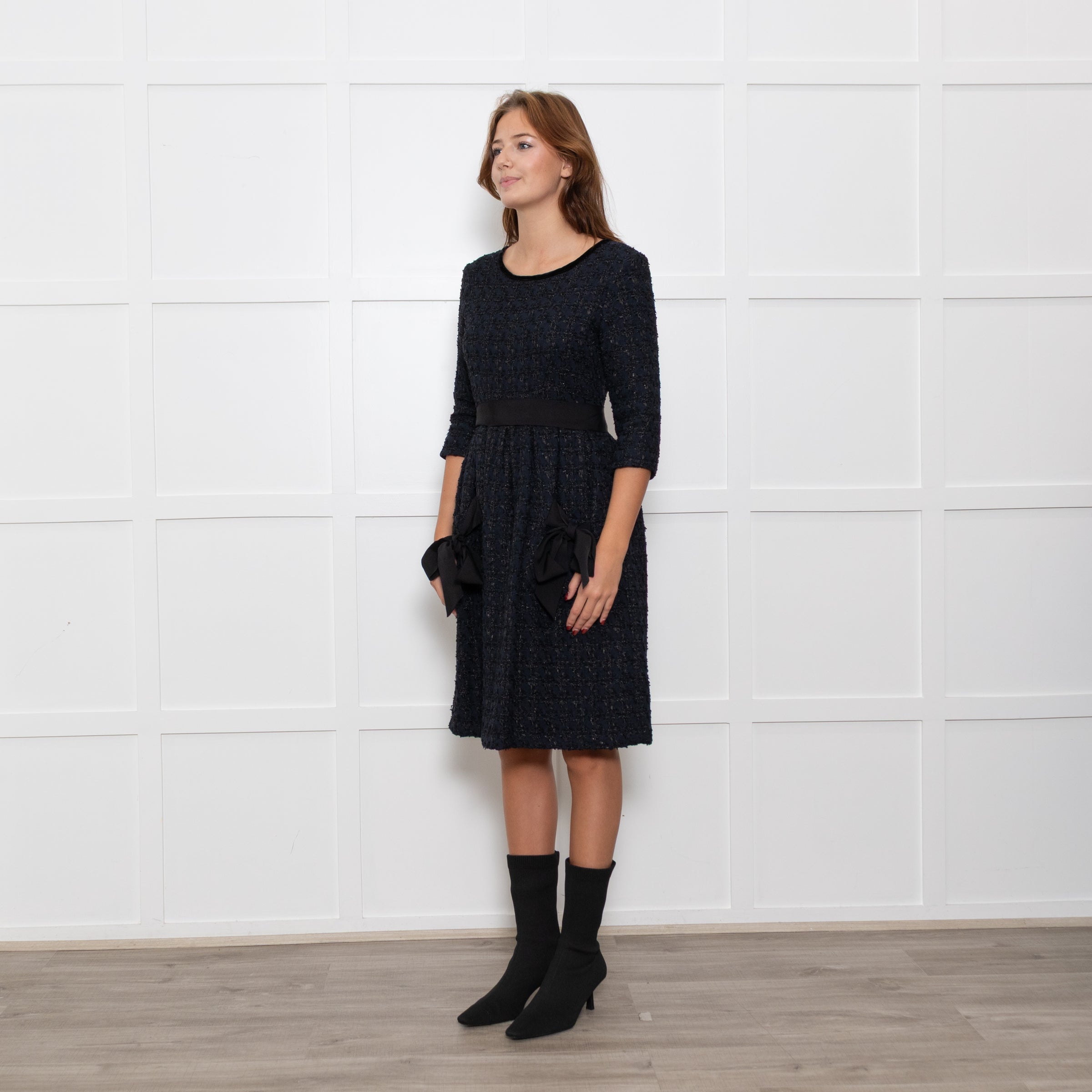 Moloh gorgeous midnight blue boucle knit dress, featuring grosgrain ribbon trims, a stunning satin lining, two spacious pockets, completed with a zip-up back.
