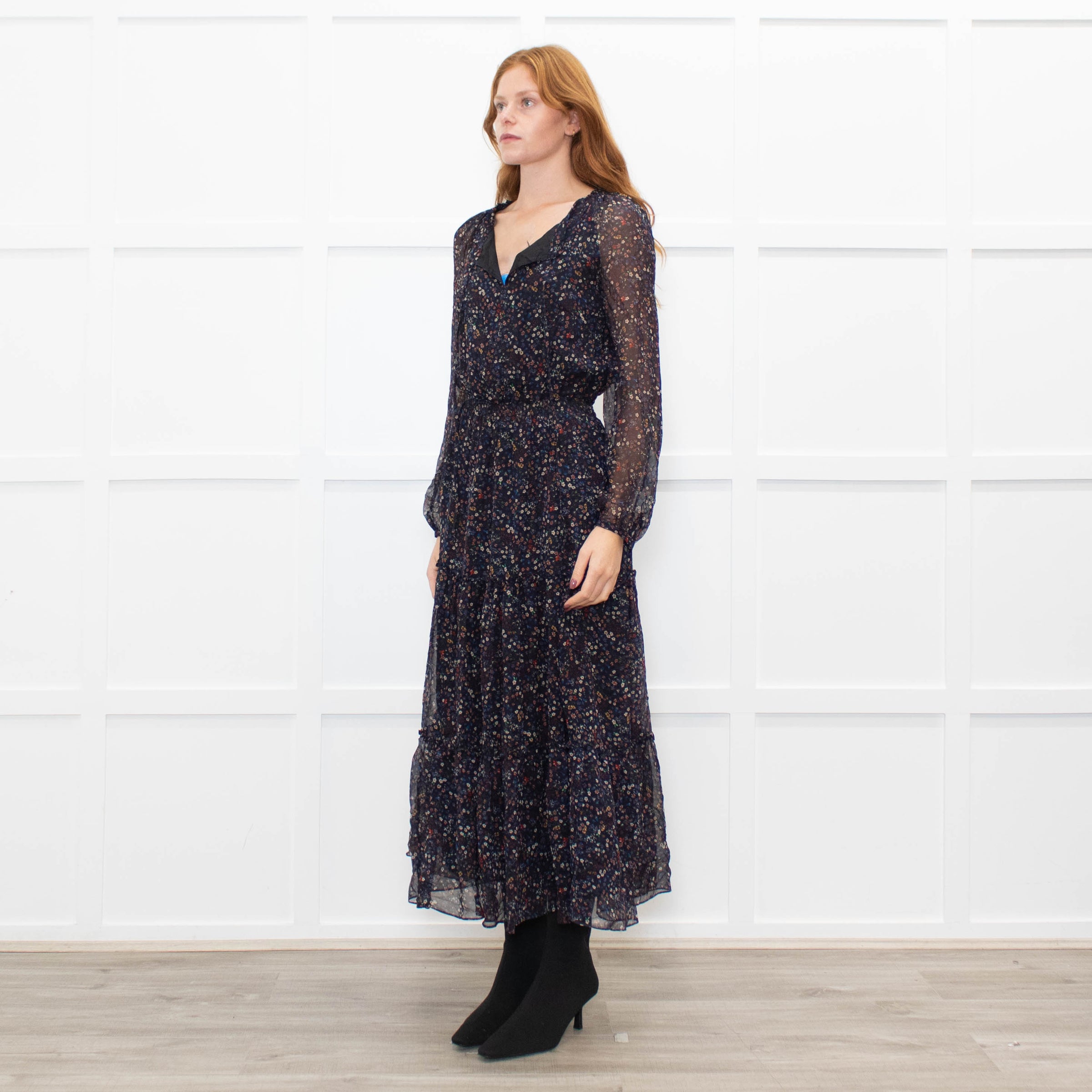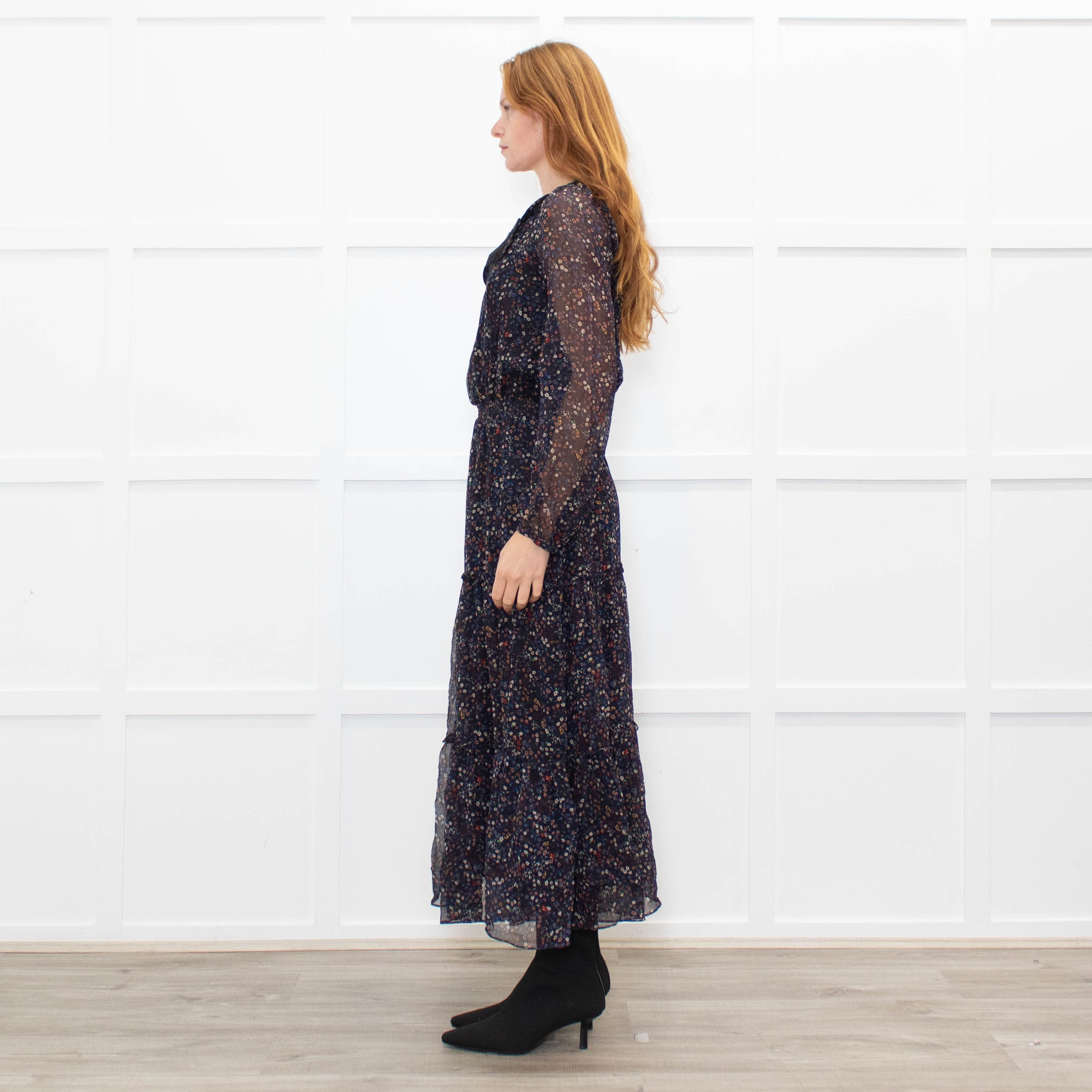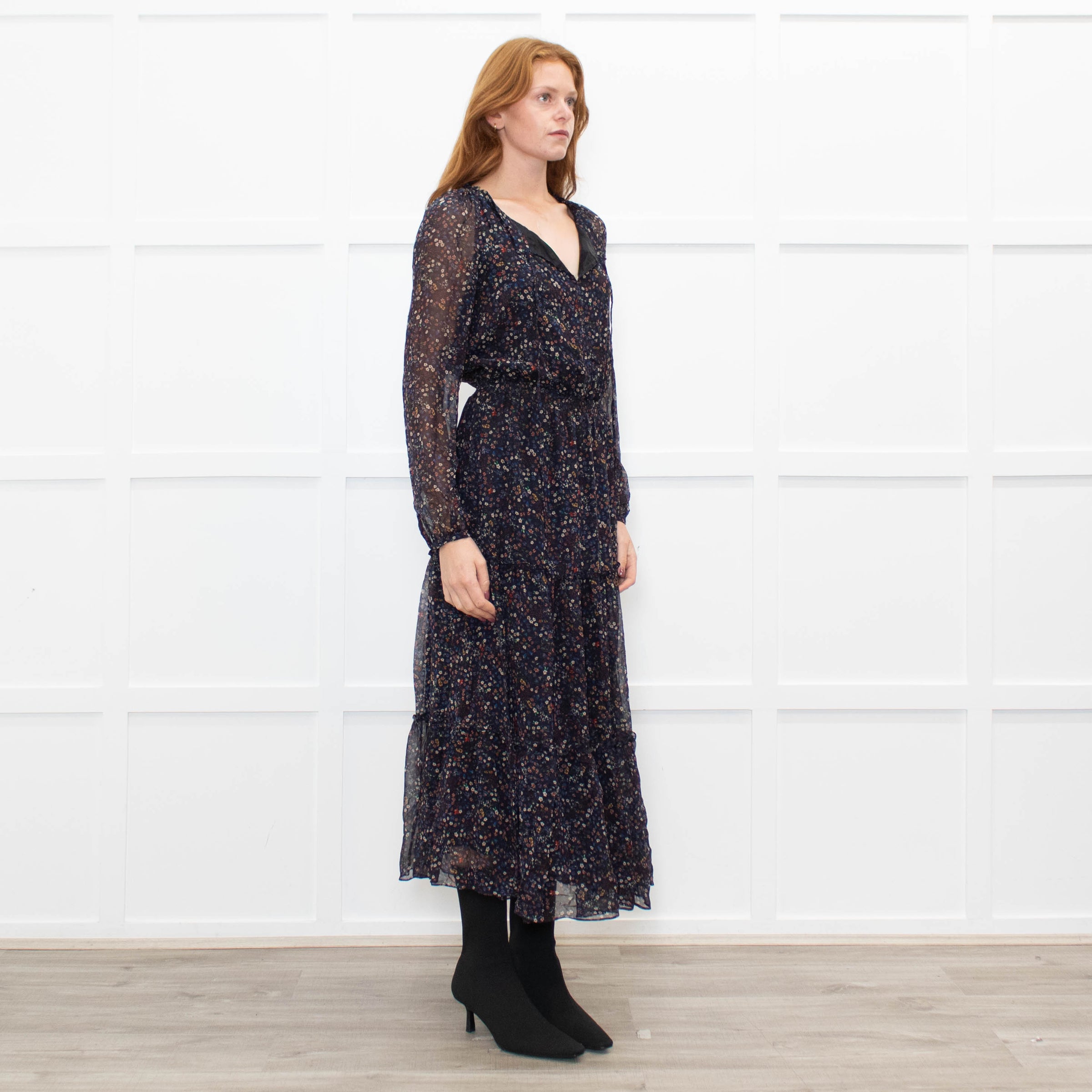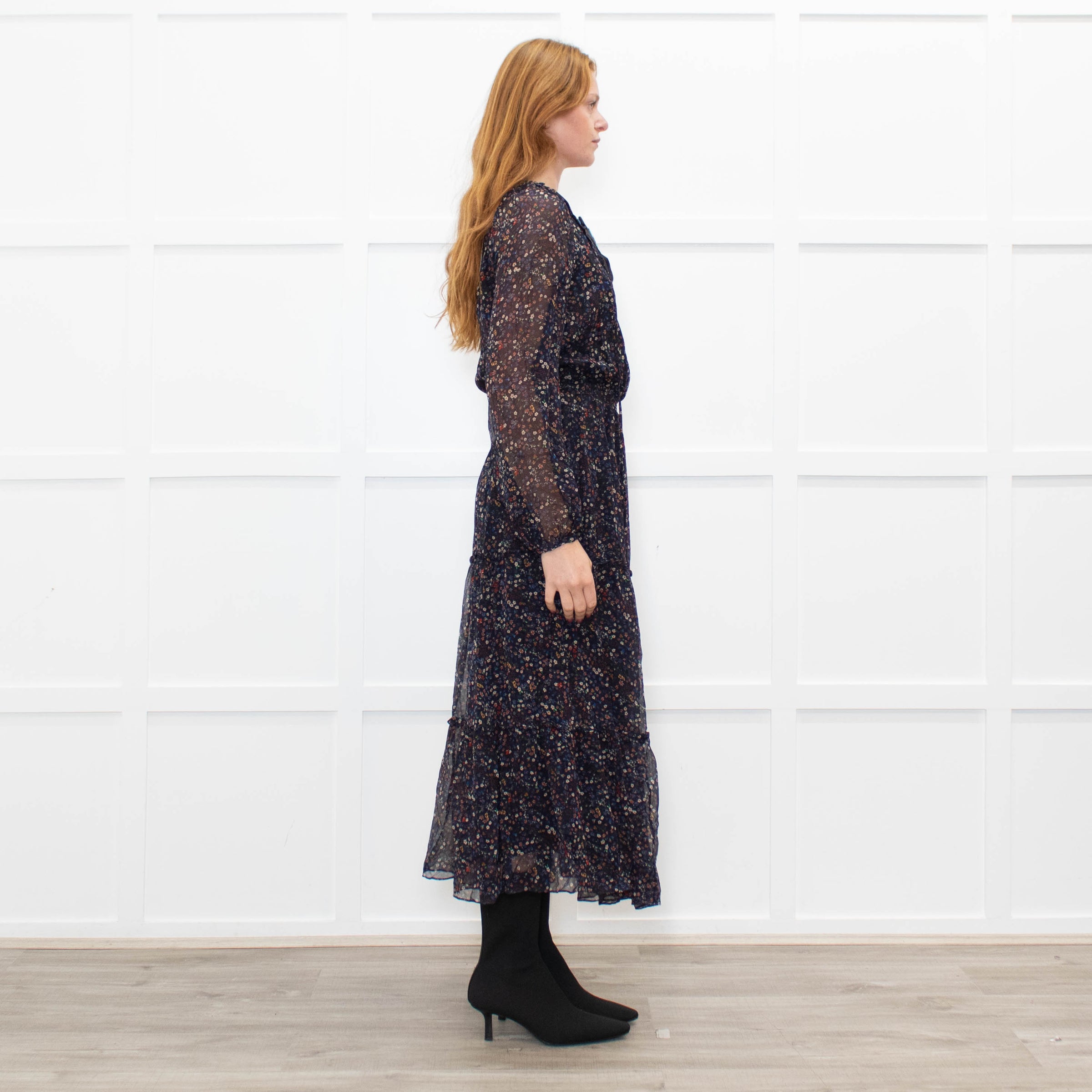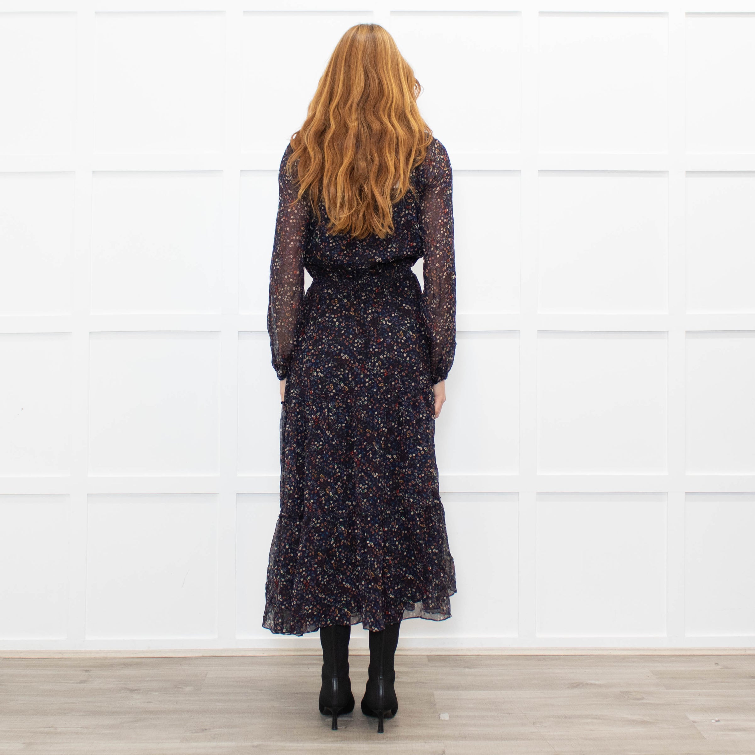 Ridley navy, white, and red floral elasticated waist tiered silk dress with a V-shaped cut-out neckline, and neck tie.