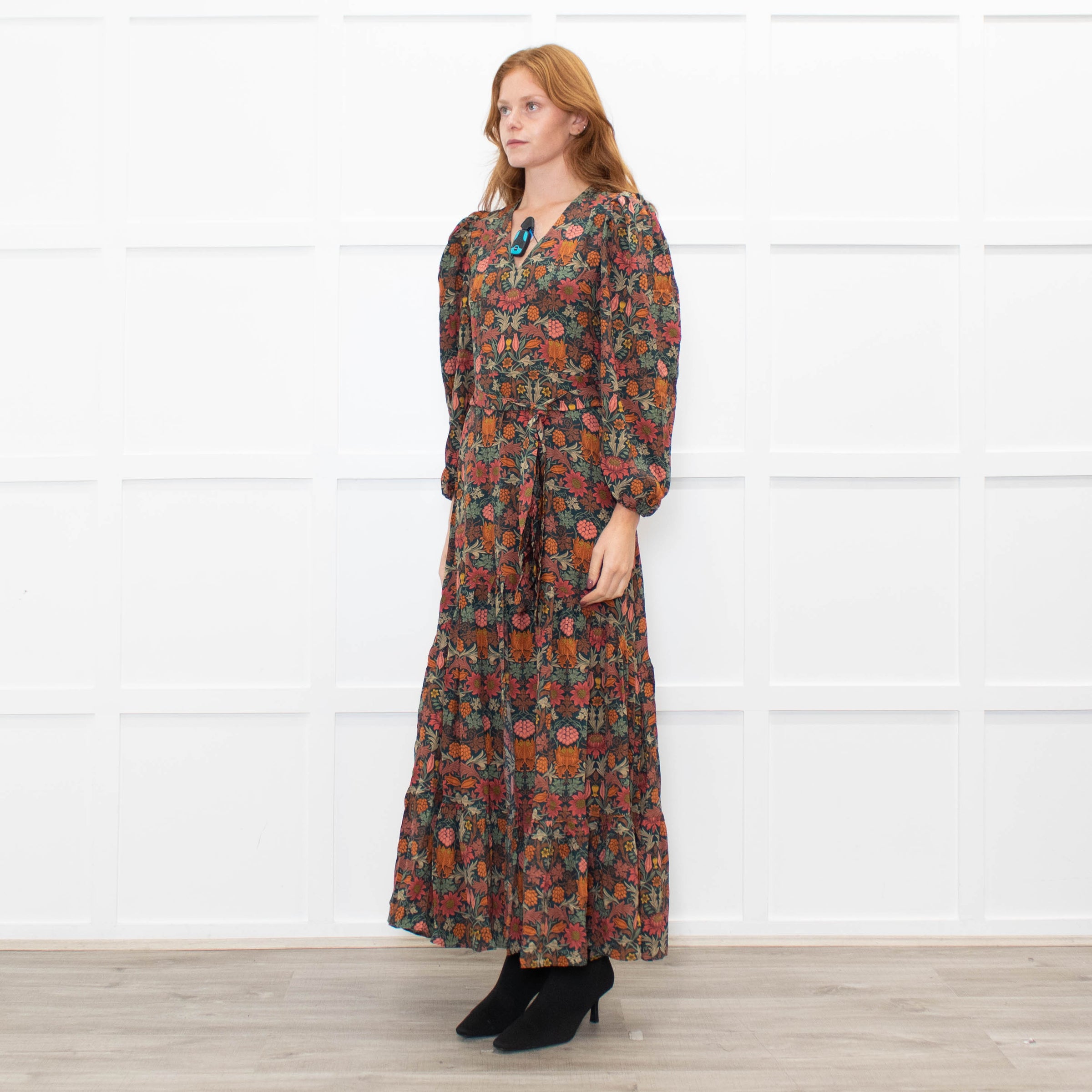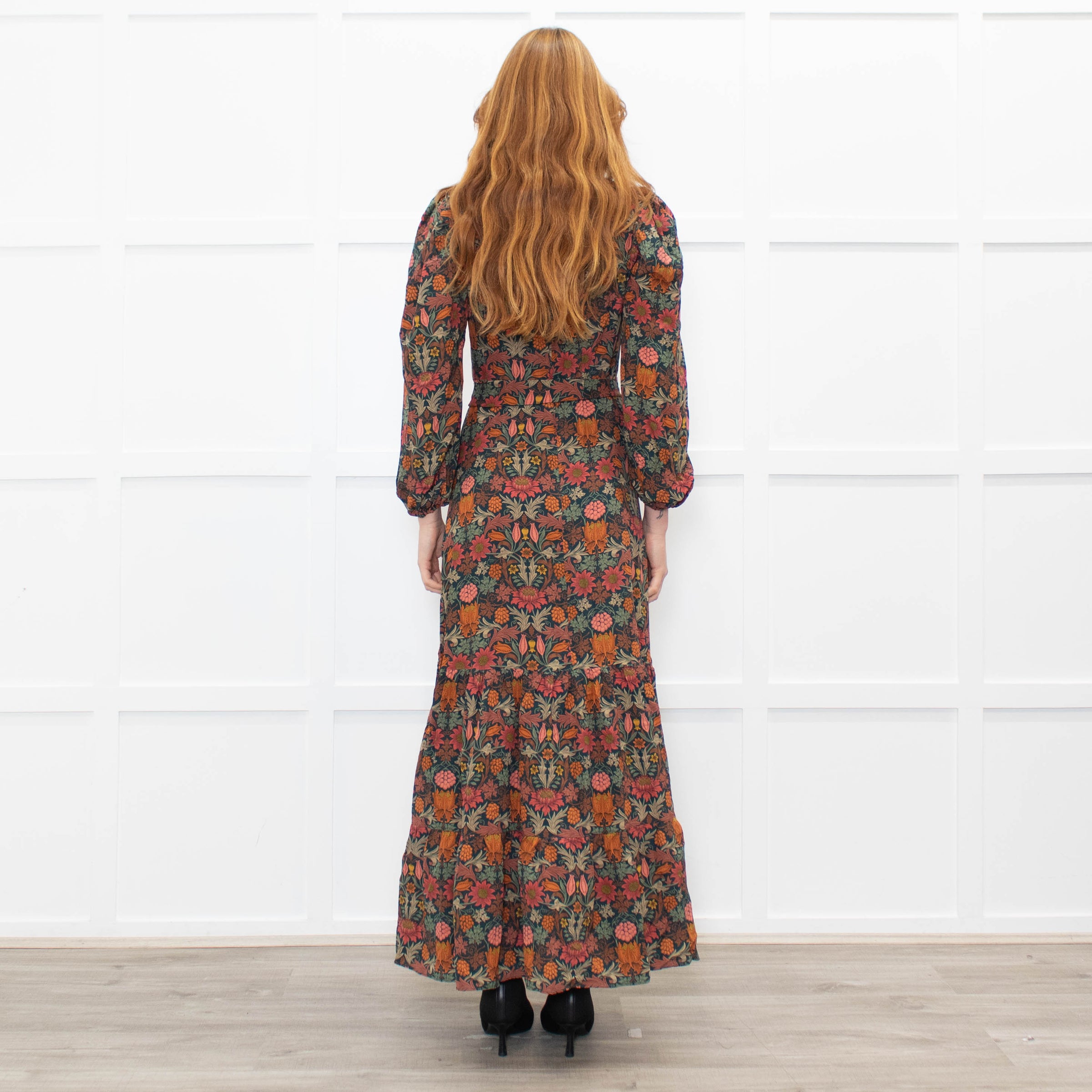 Ridley dark green, orange, and pink floral belted maxi dress with a V-shaped neckline and cuffed sleeves. New with tags.
