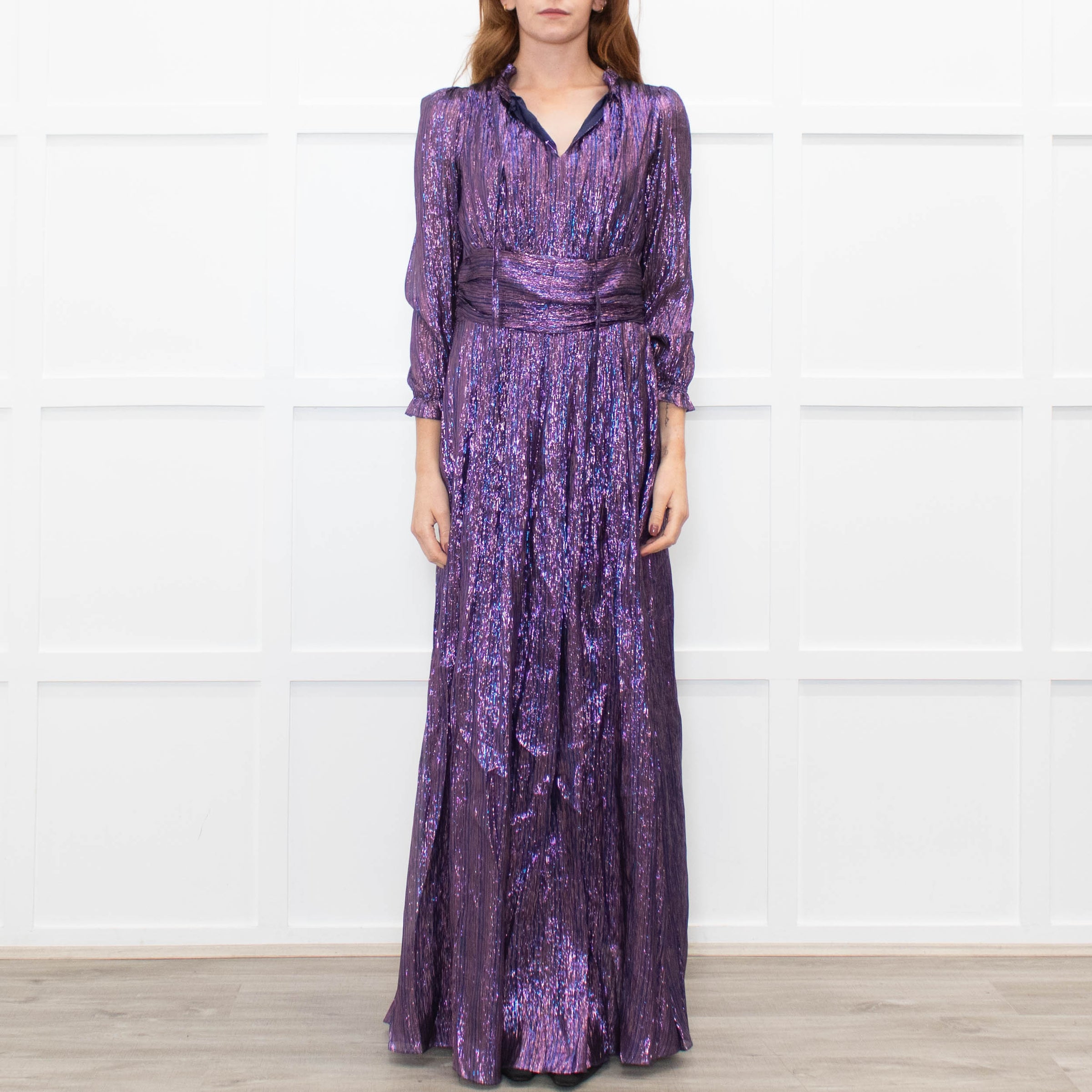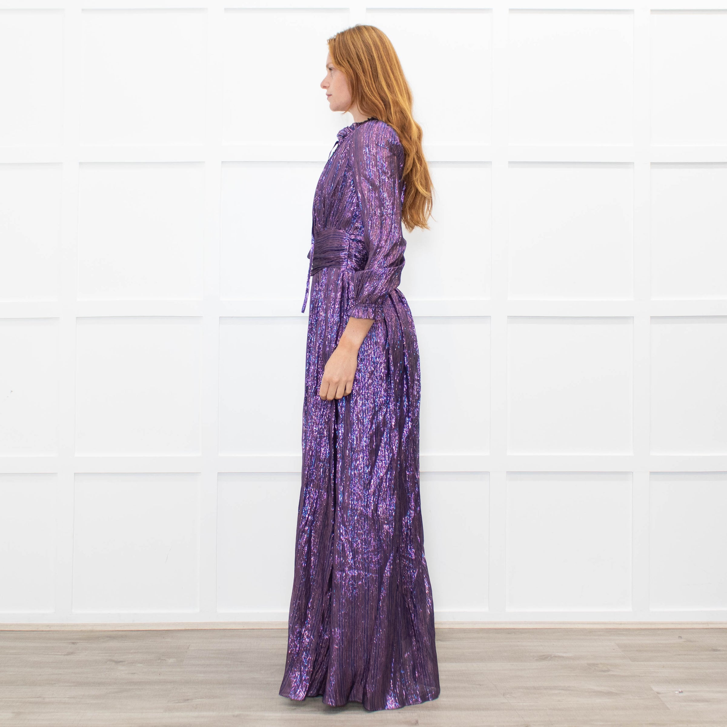 Ridley purple lurex maxi dress with a V-shaped cut-out neckline and neck tie.