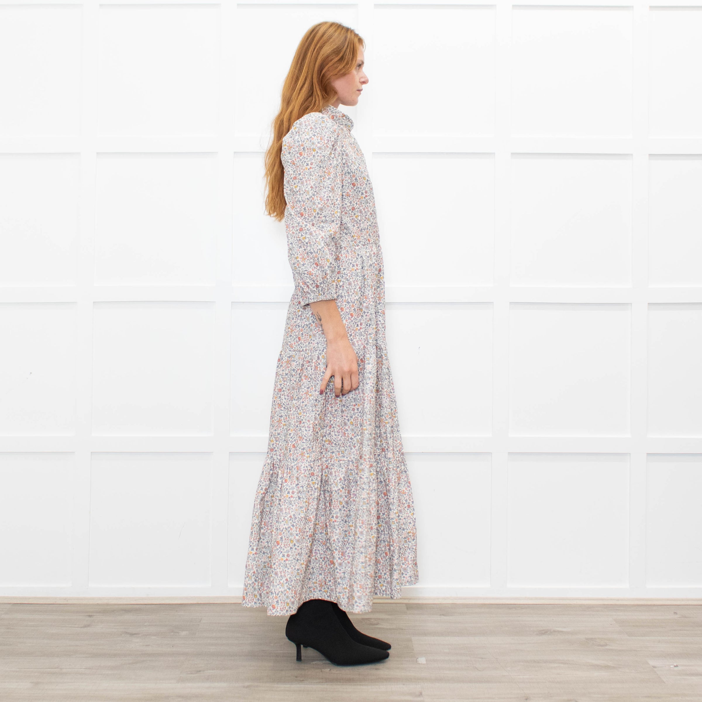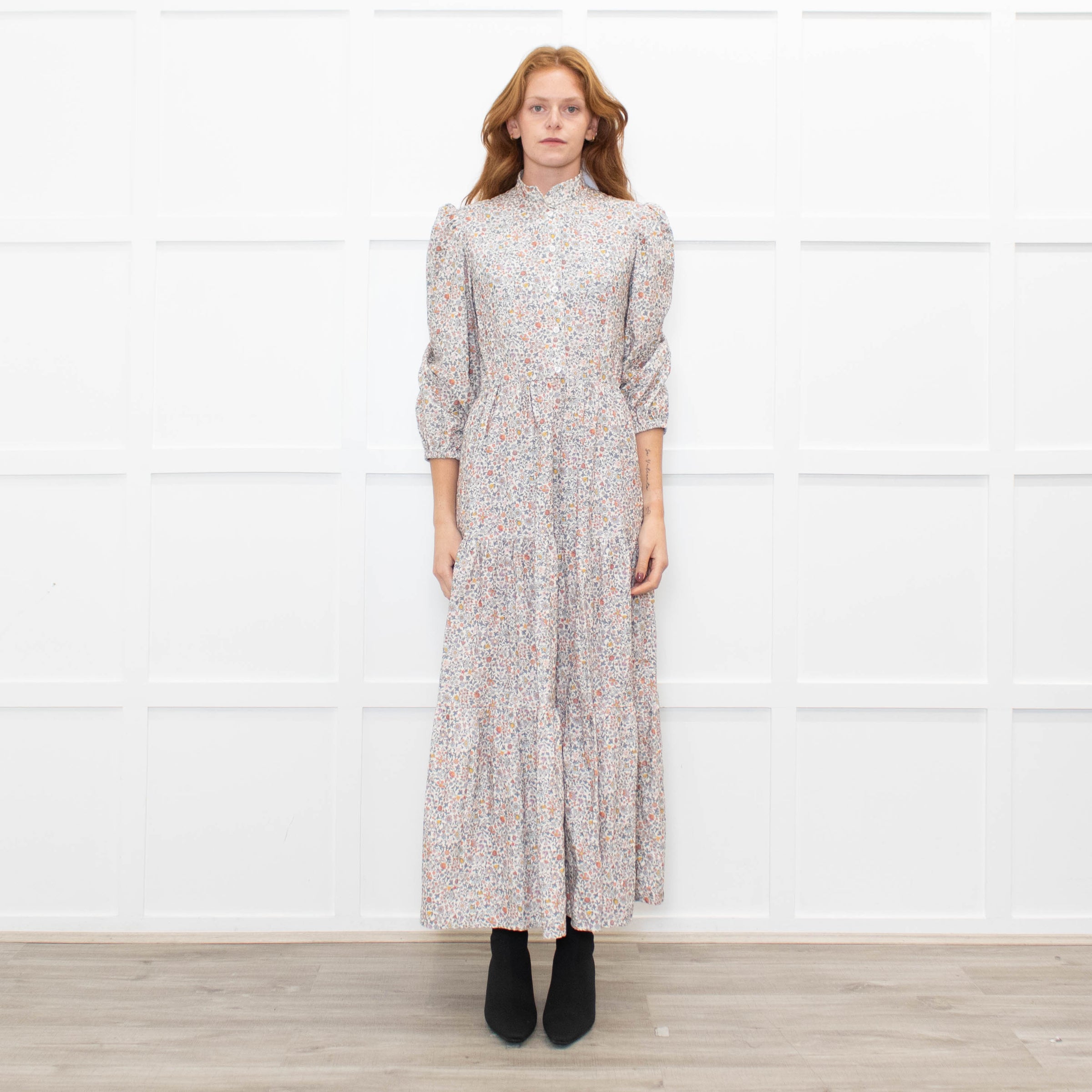 Ridley white, grey, and orange floral corduroy maxi dress with front button closure, and a pleated skirt.