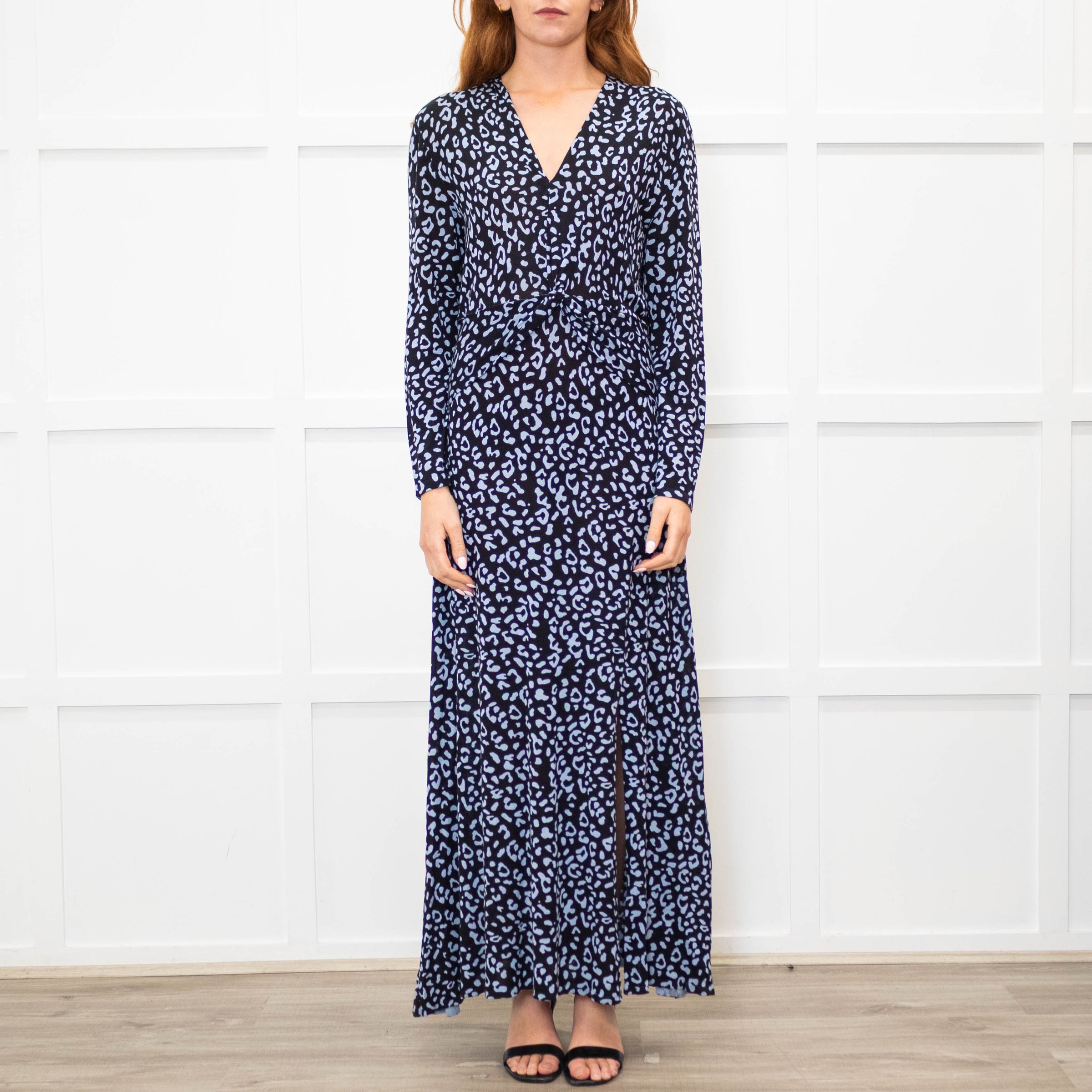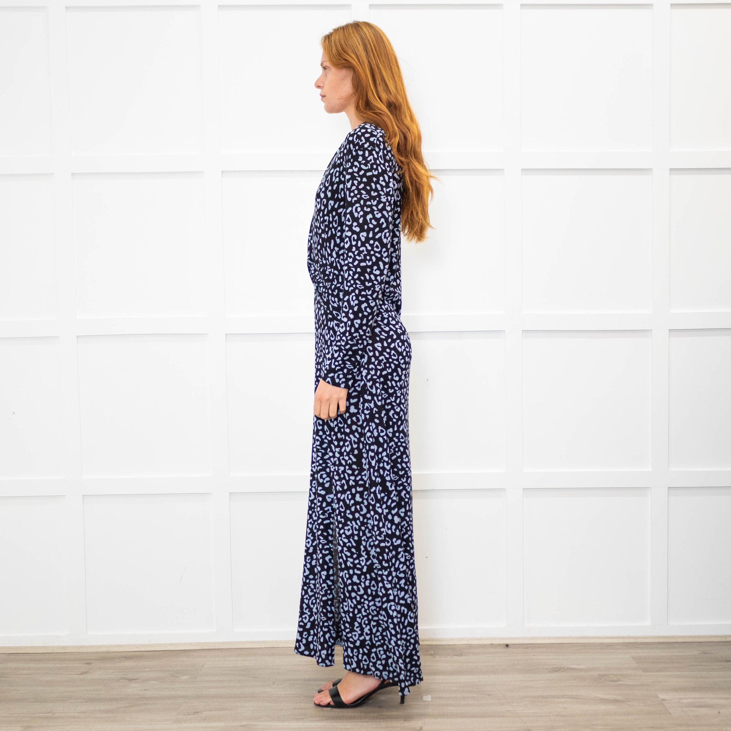 Rixo black and blue animal print knit jersey V-neck dress with a twist detail at the front, long sleeves, and a front hem split.