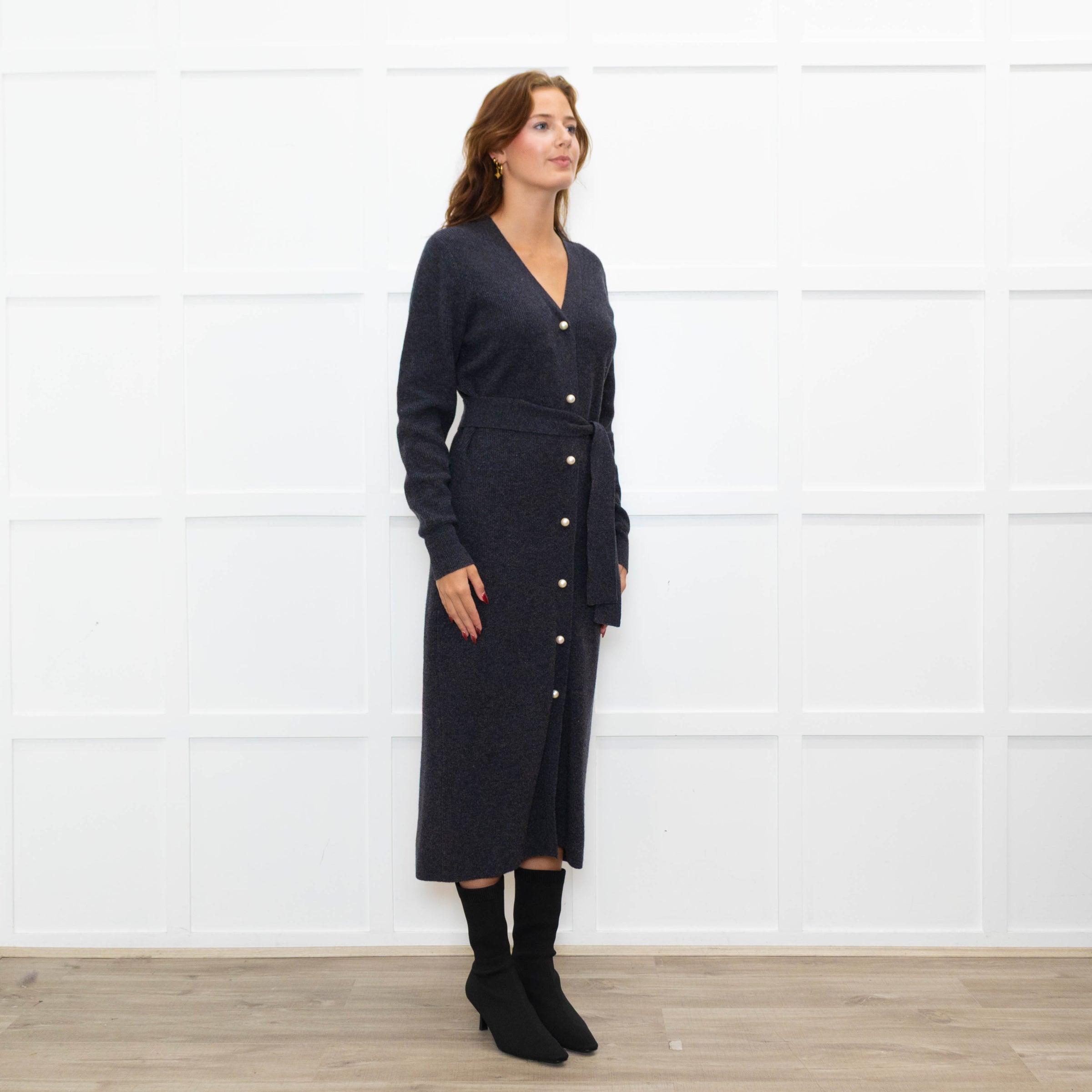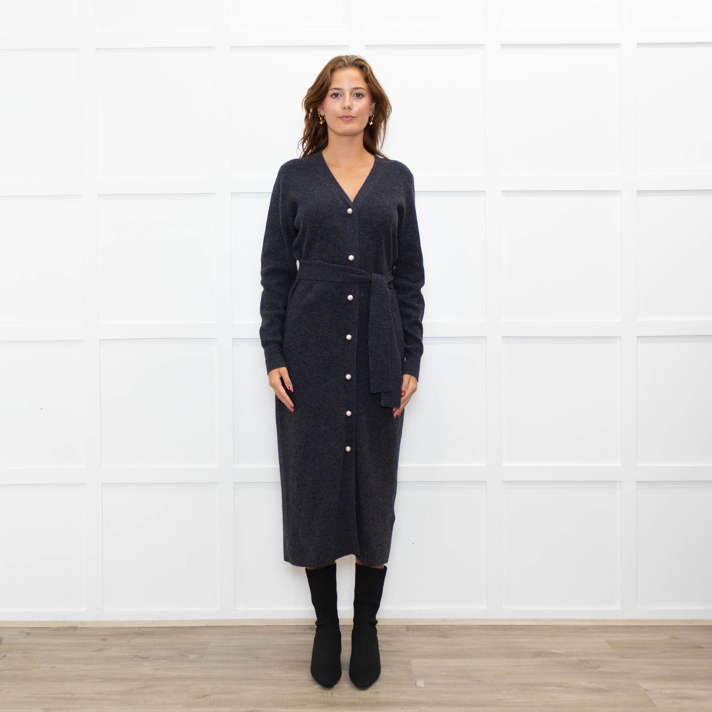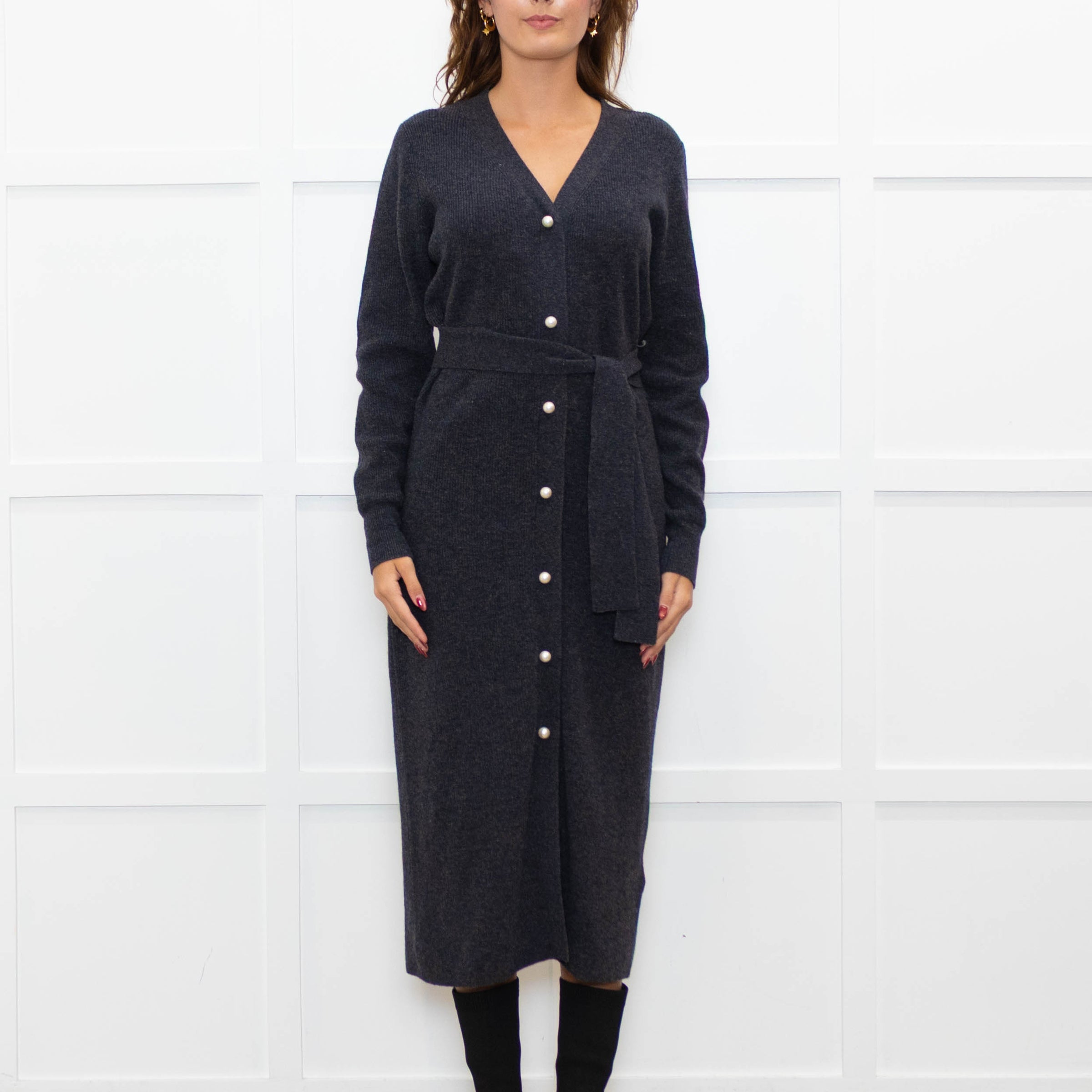Sandro elegant long-sleeve grey knit dress, featuring a pearl button closure, and a V-neckline with a knitted tie-up belt.