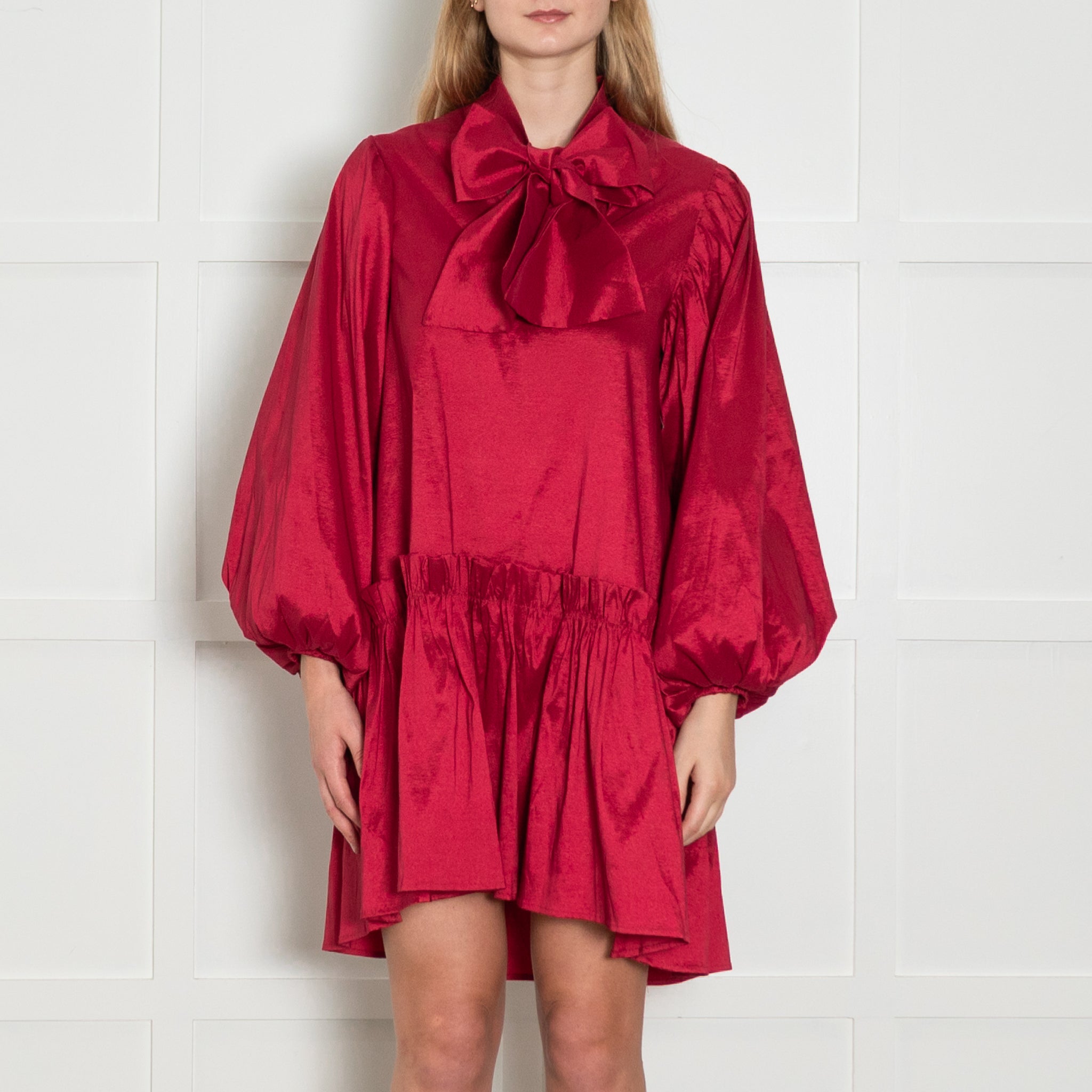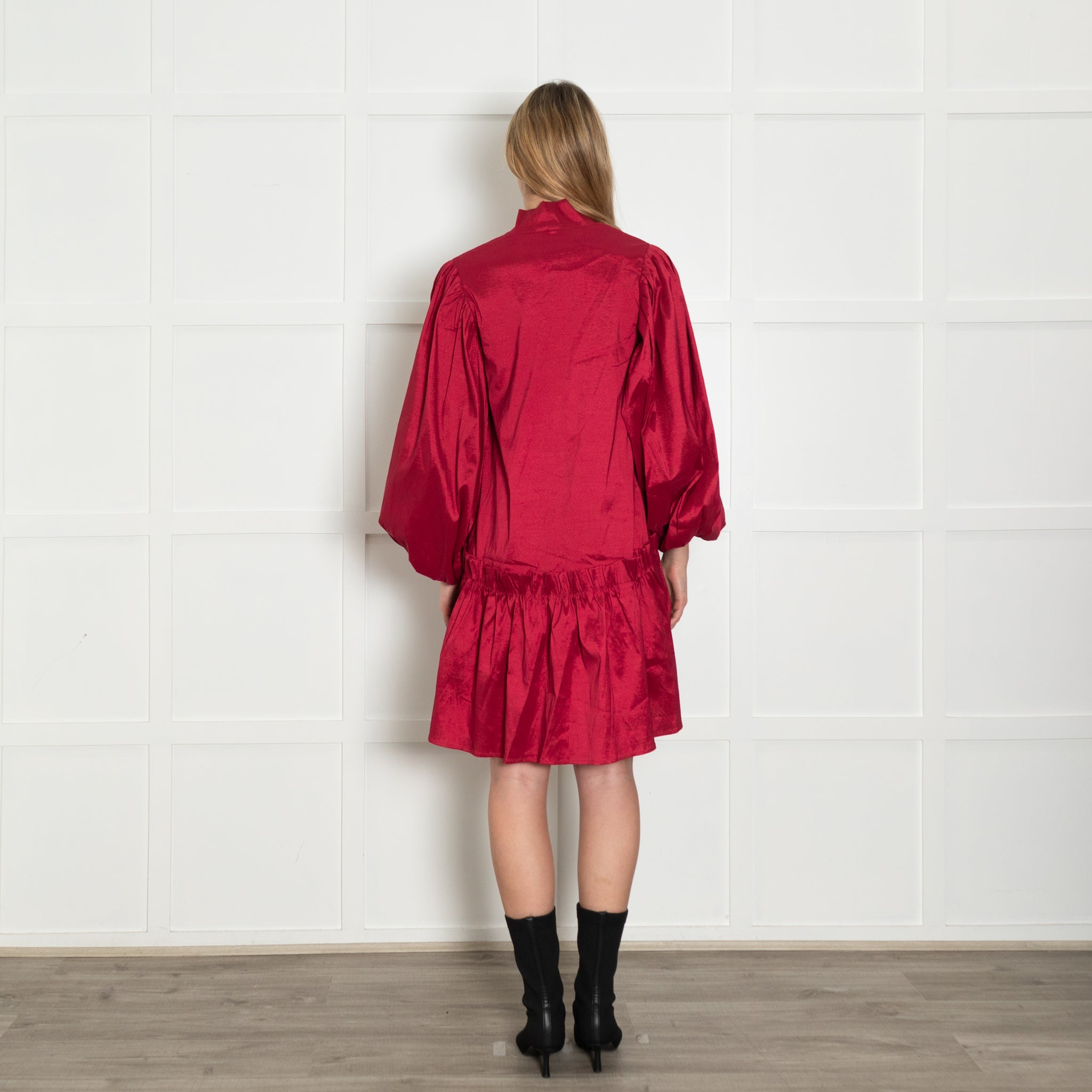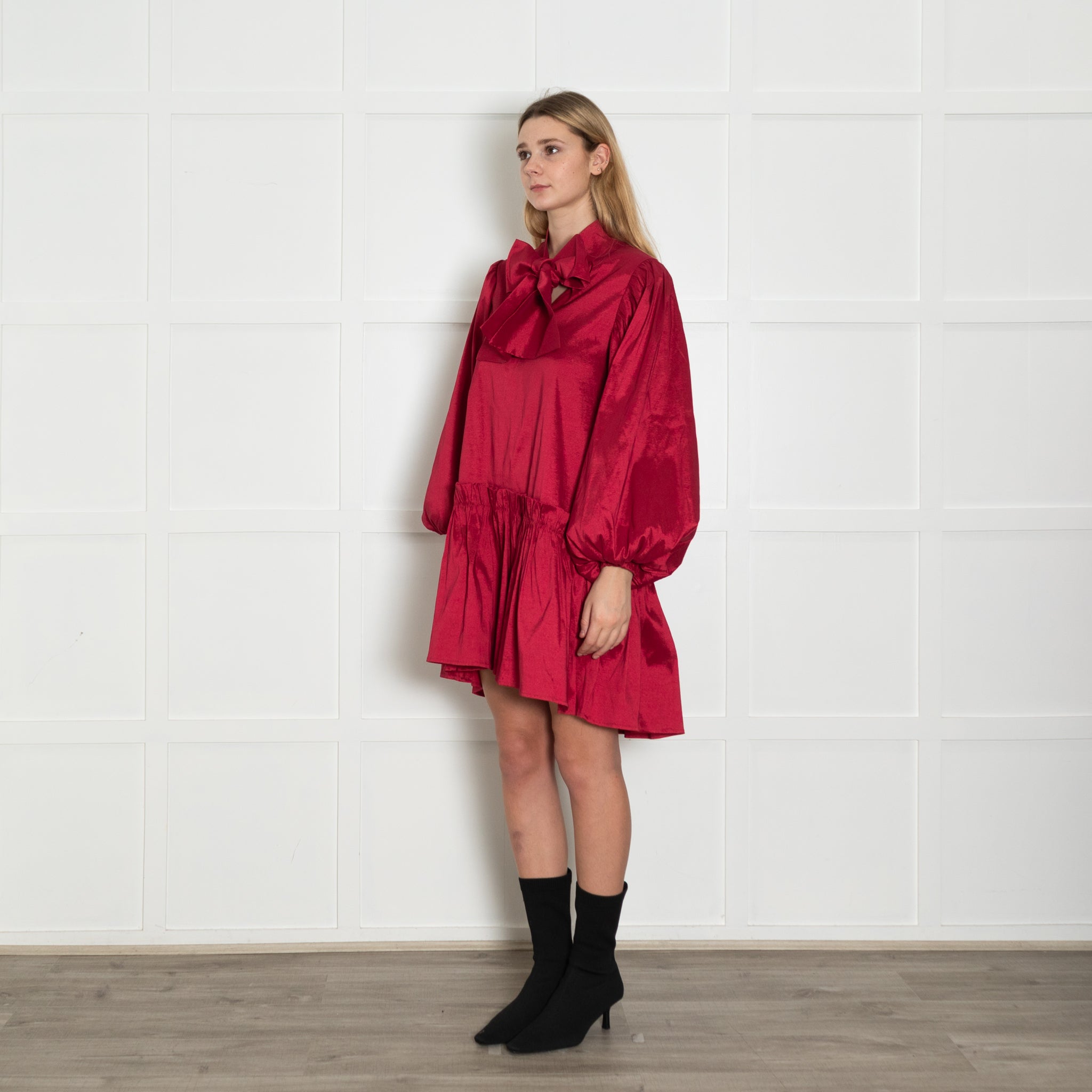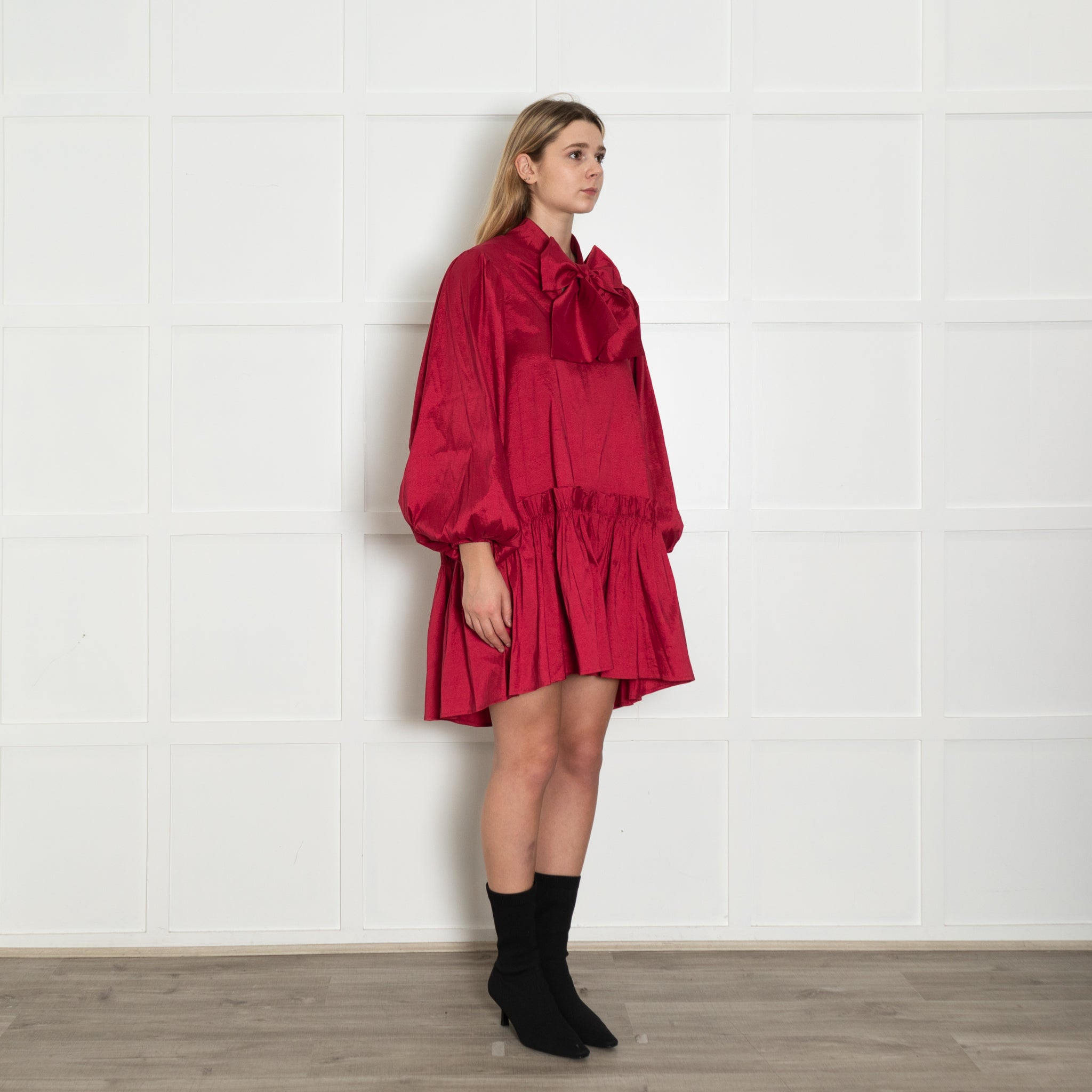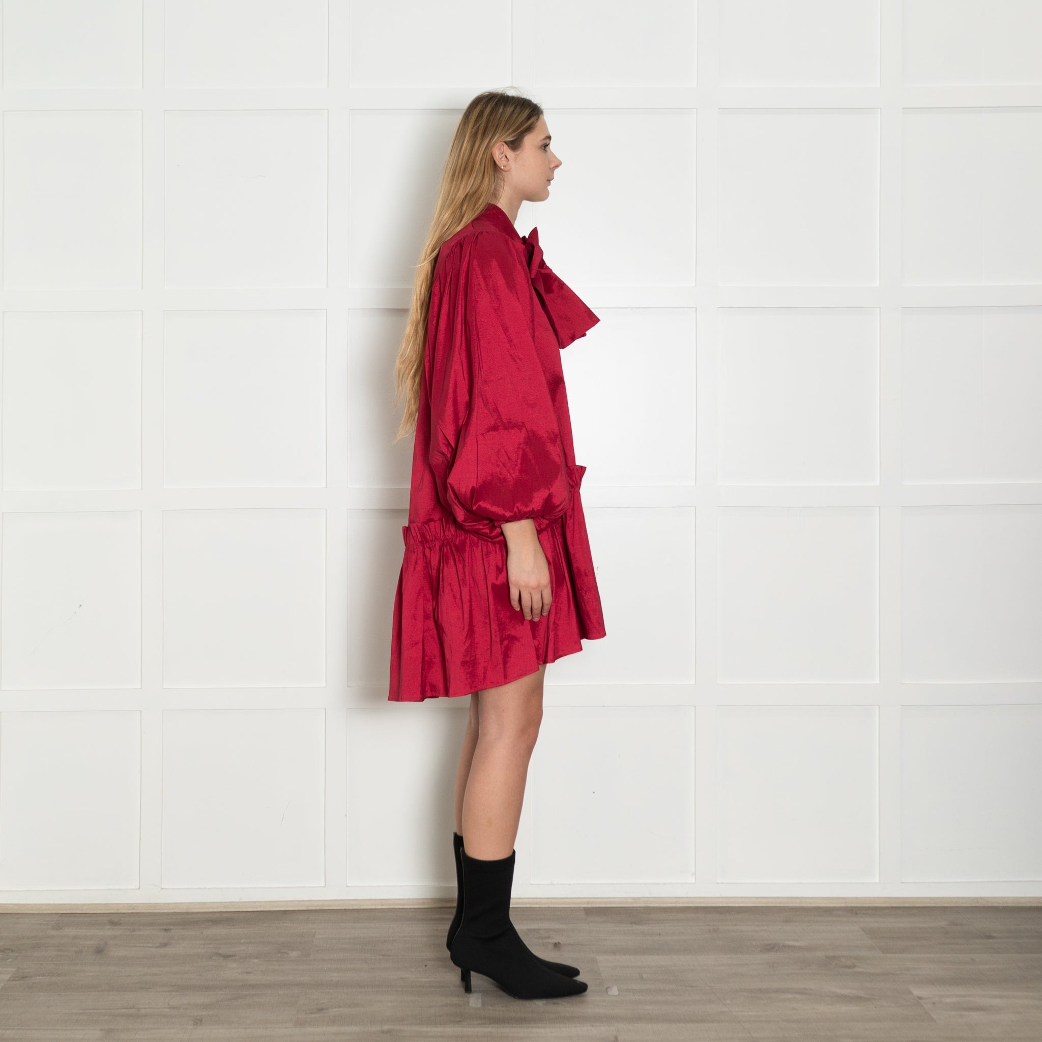 Vibrant red short Sister Jane dress featuring tiered construction and puff sleeves. Designed with a long tie at the neckline and ruffled detailing at the hips