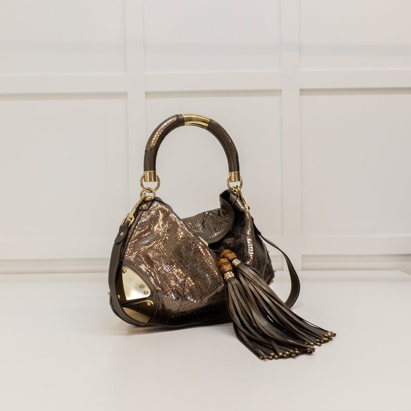Gucci Pewter Metallic Snake Skin Babouska Indy Hobo Bag