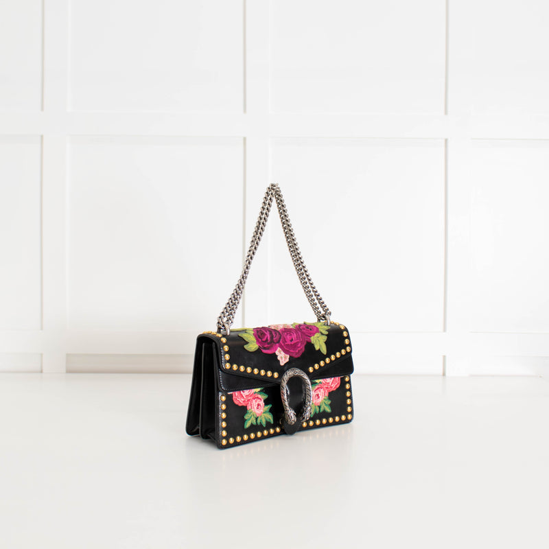 Gucci Black Calfskin Floral Embroidered Studded Small Dionysus Bag