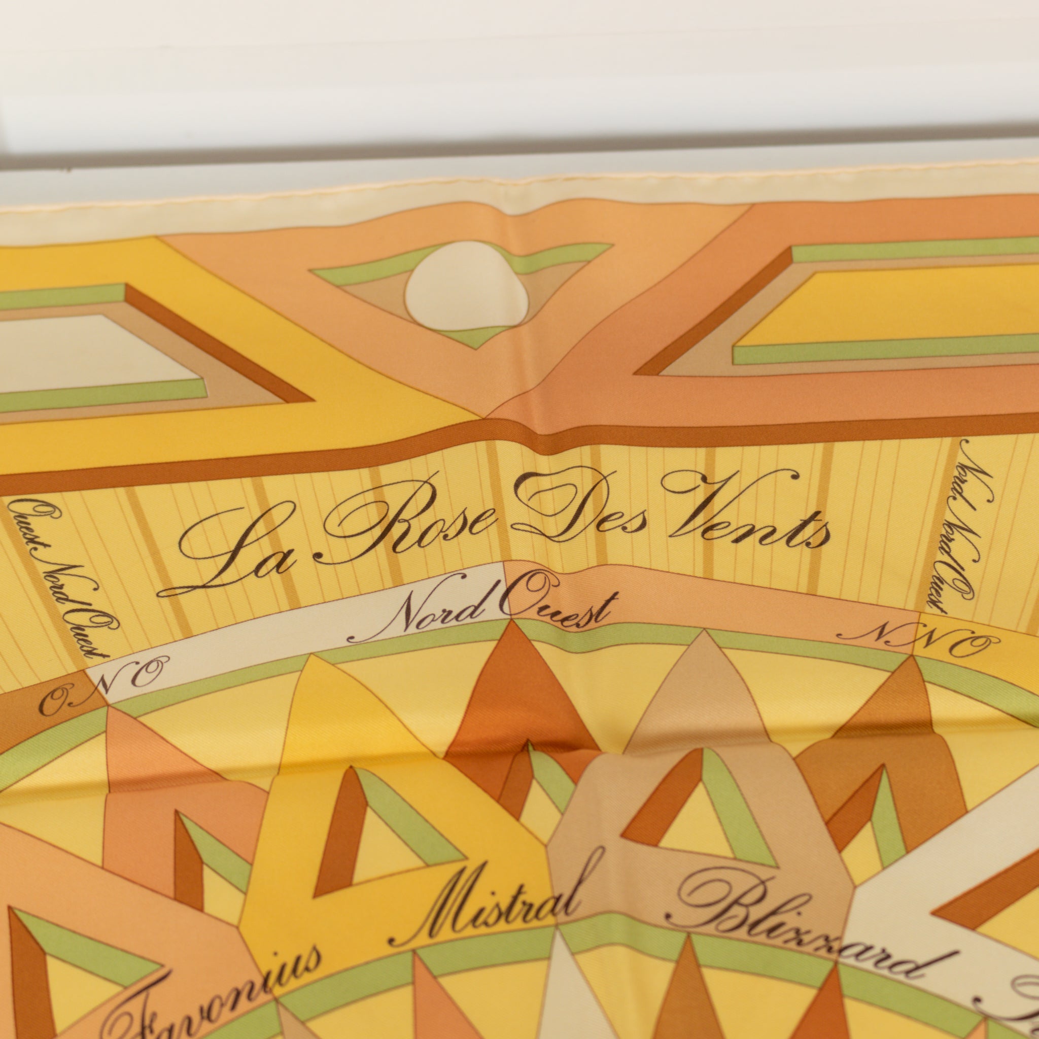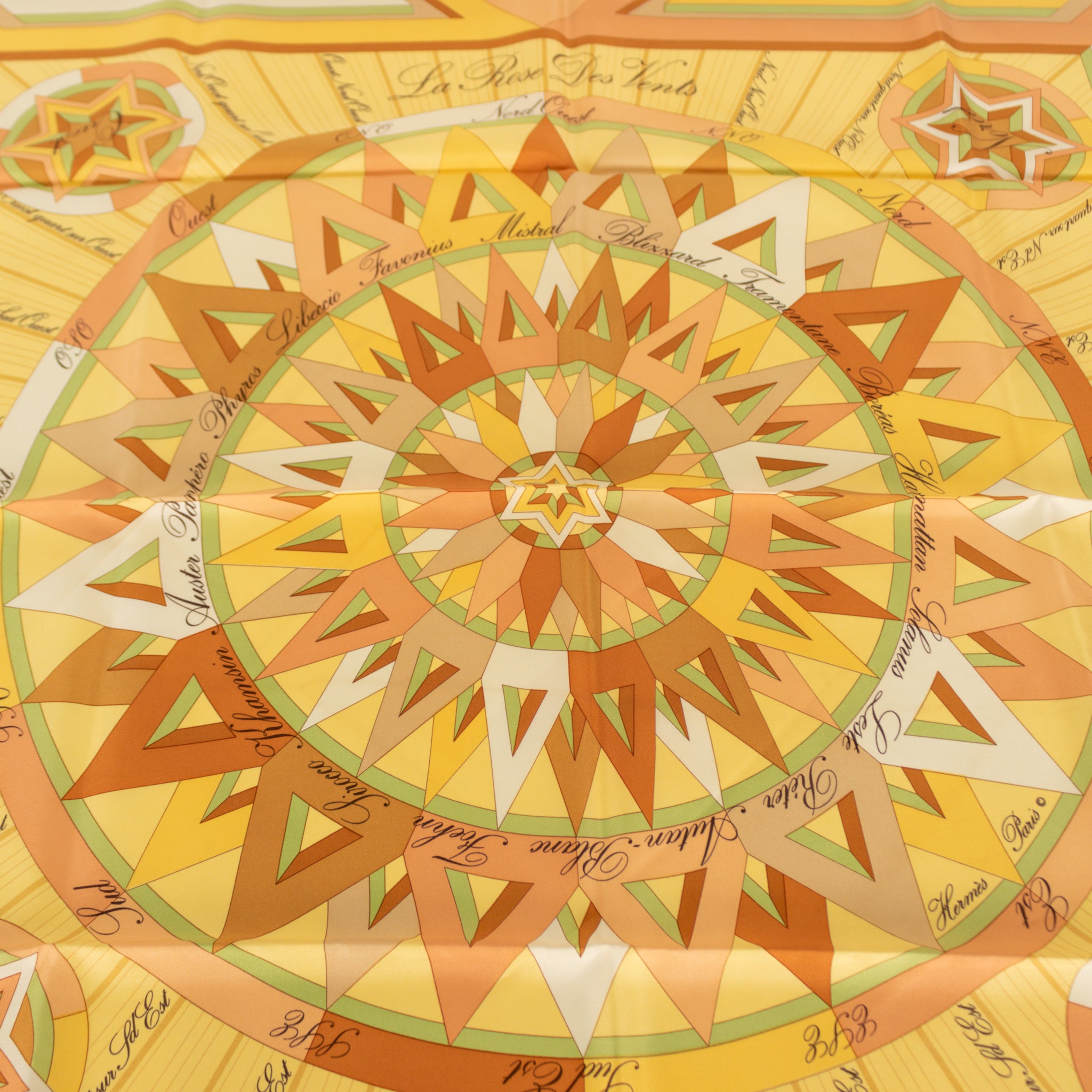 Hermes La Rose Des vents (1984) silk pale yellow scarf, featuring a stunning, elegant centre design, for a sophisticated look.