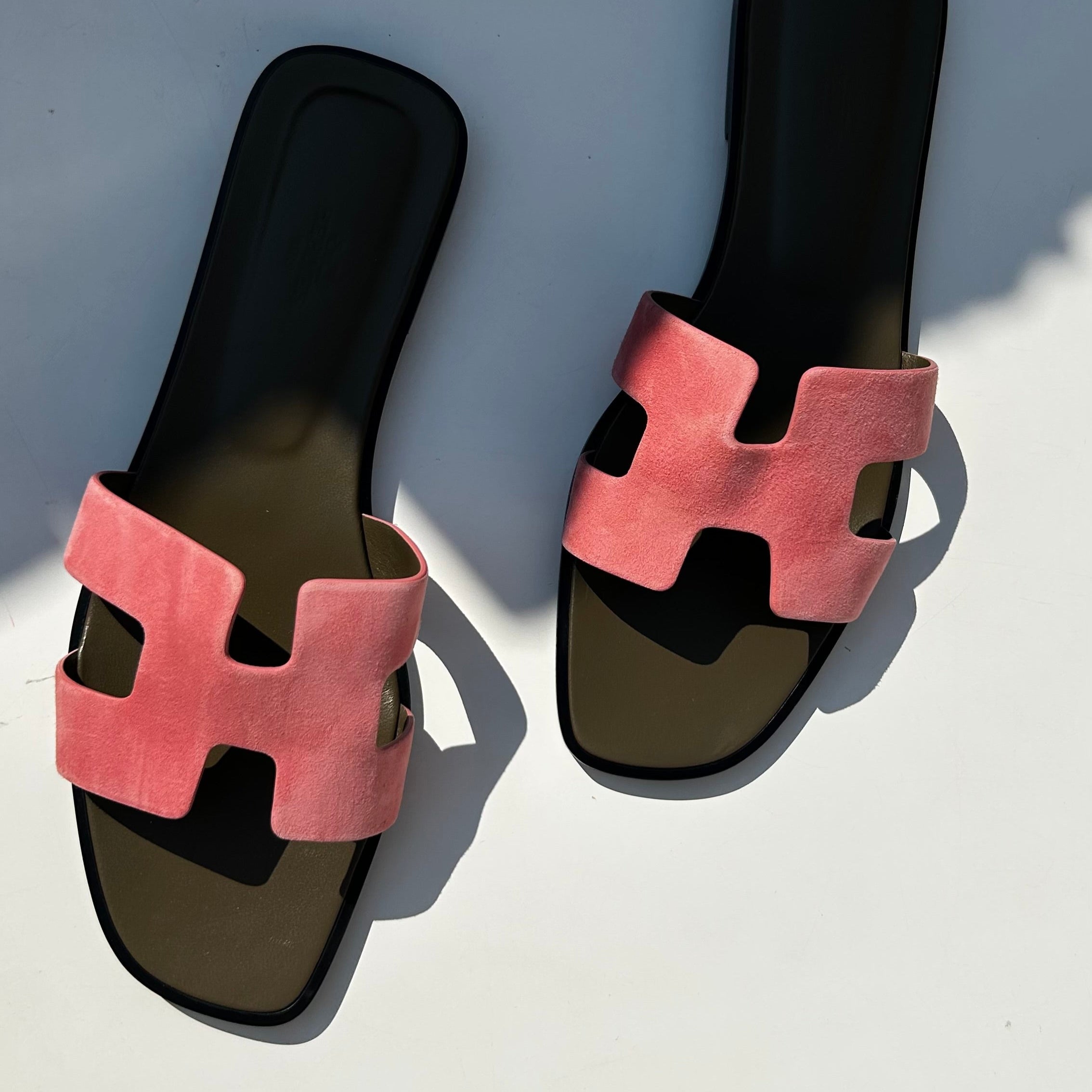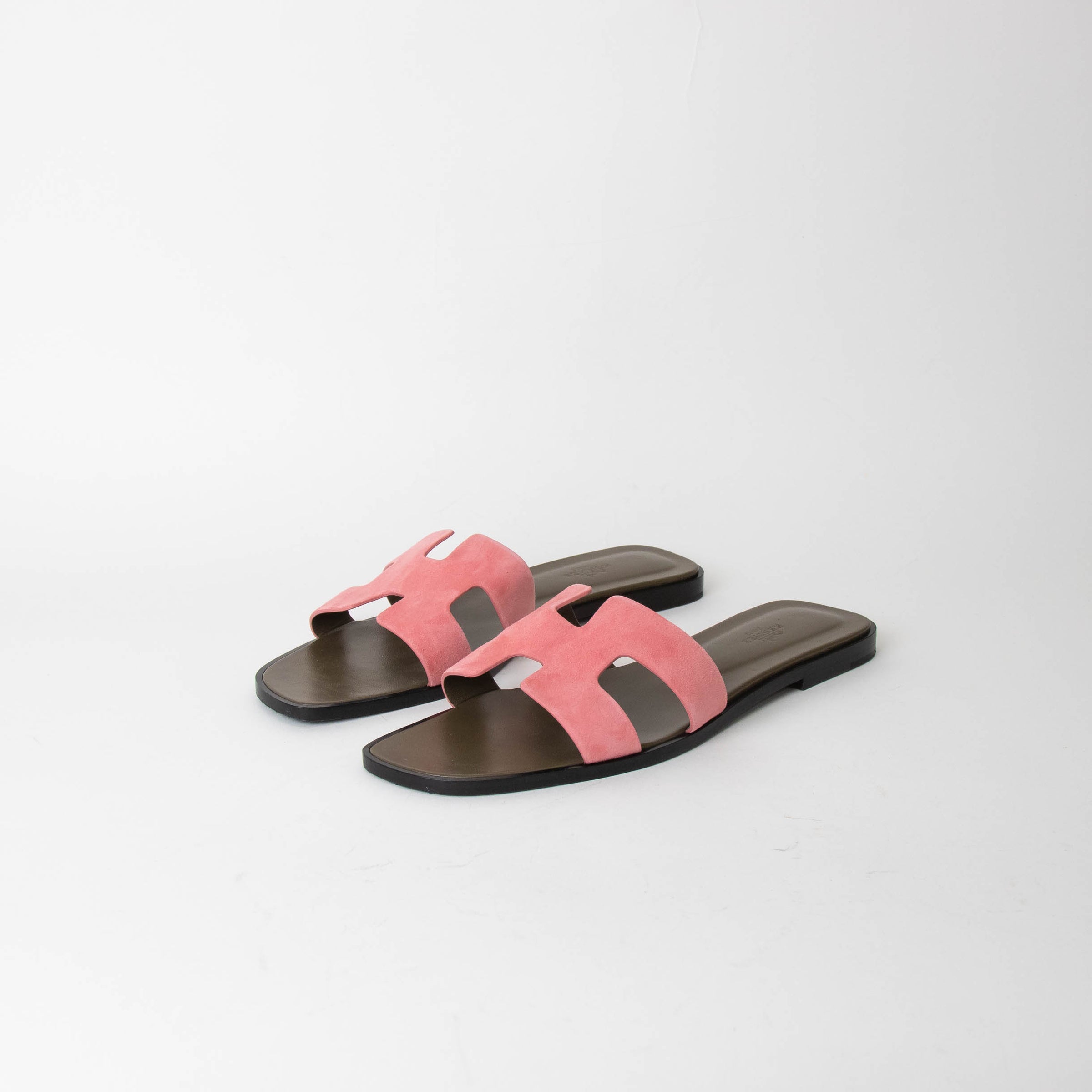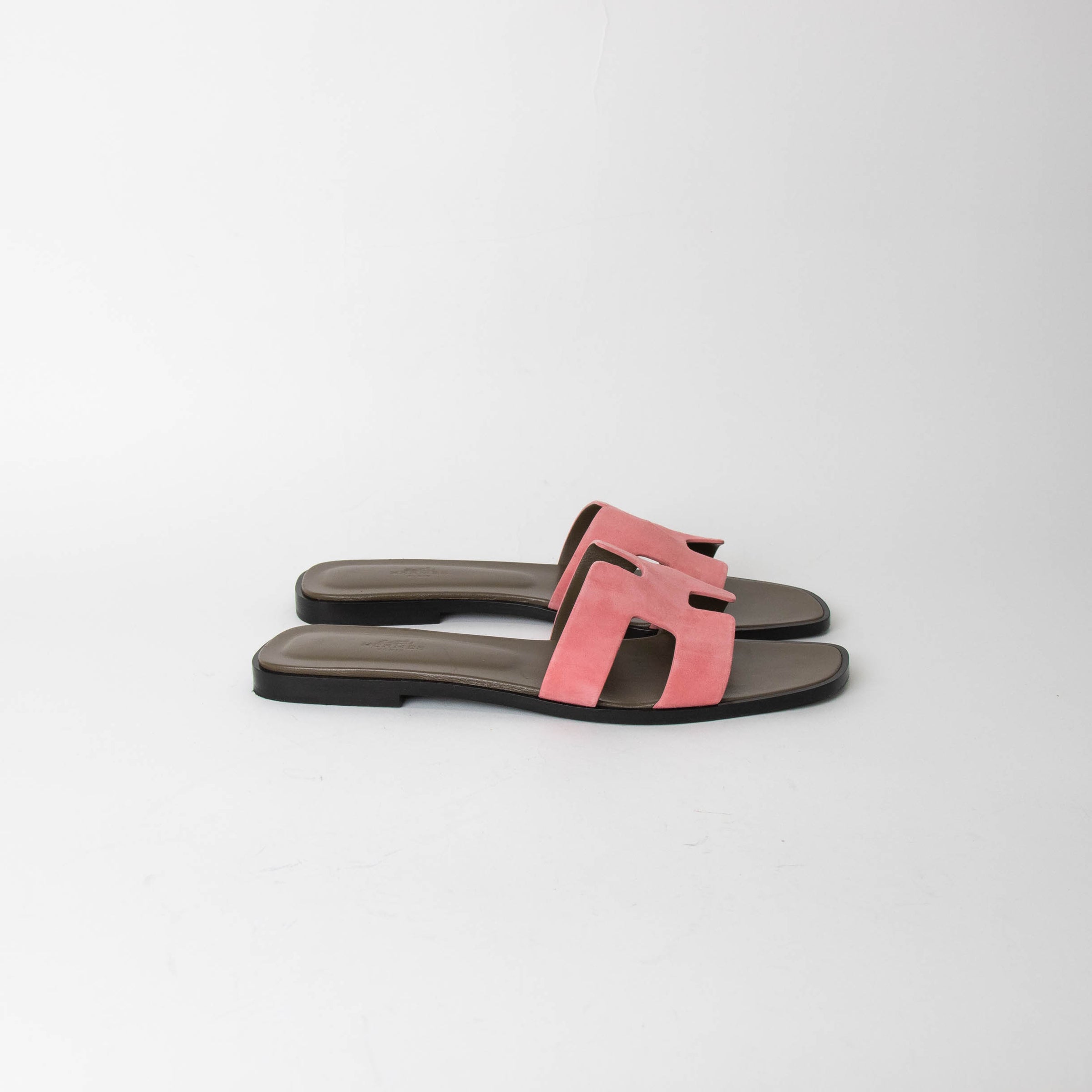 Hermes rose suede Oran sandals with the iconic 'H' cut-out detail and straight cut edges. Current season, RRP £610.