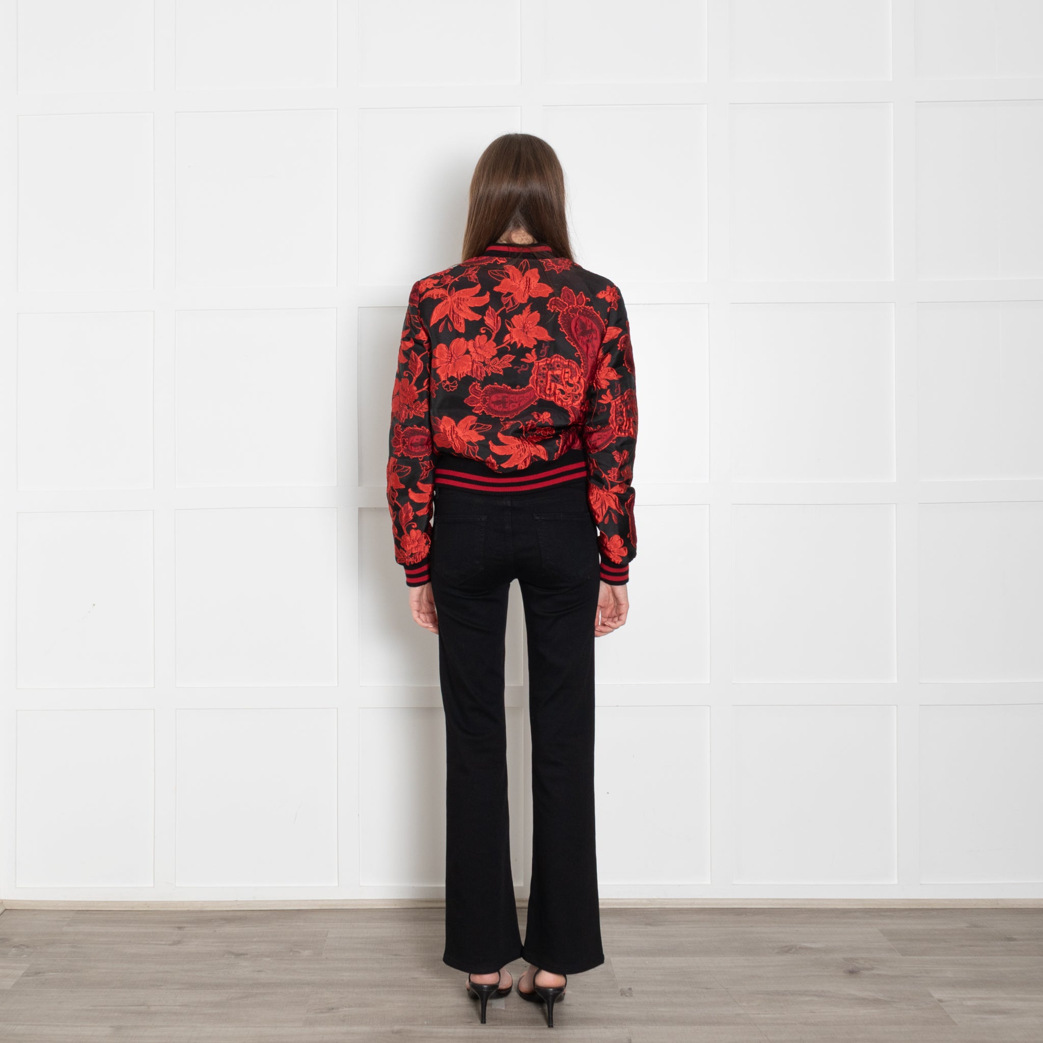 Alice + Olivia black and red floral jacquard bomber jacket with zip closure and two pockets. The jacket has classic bomber style stripe cuffs, waistband and neckline.